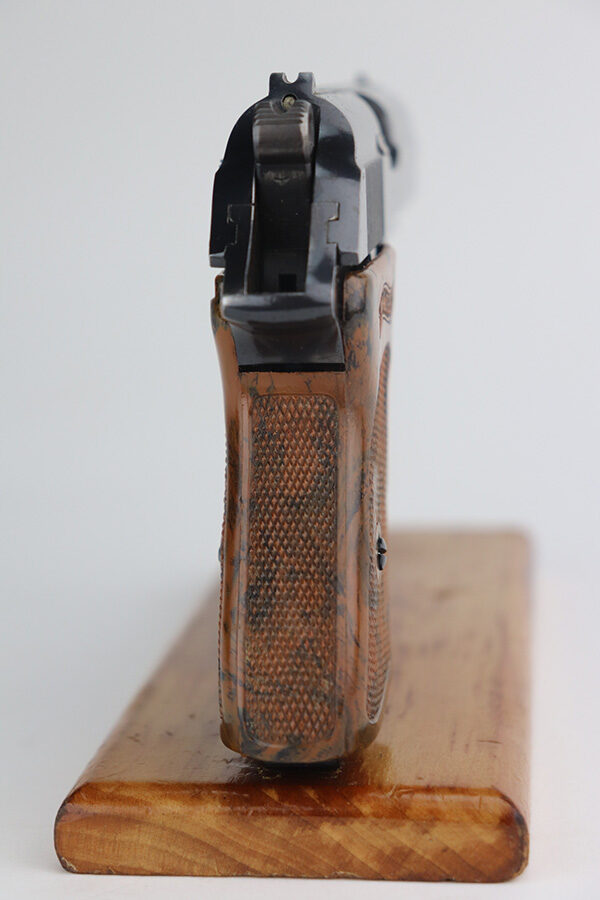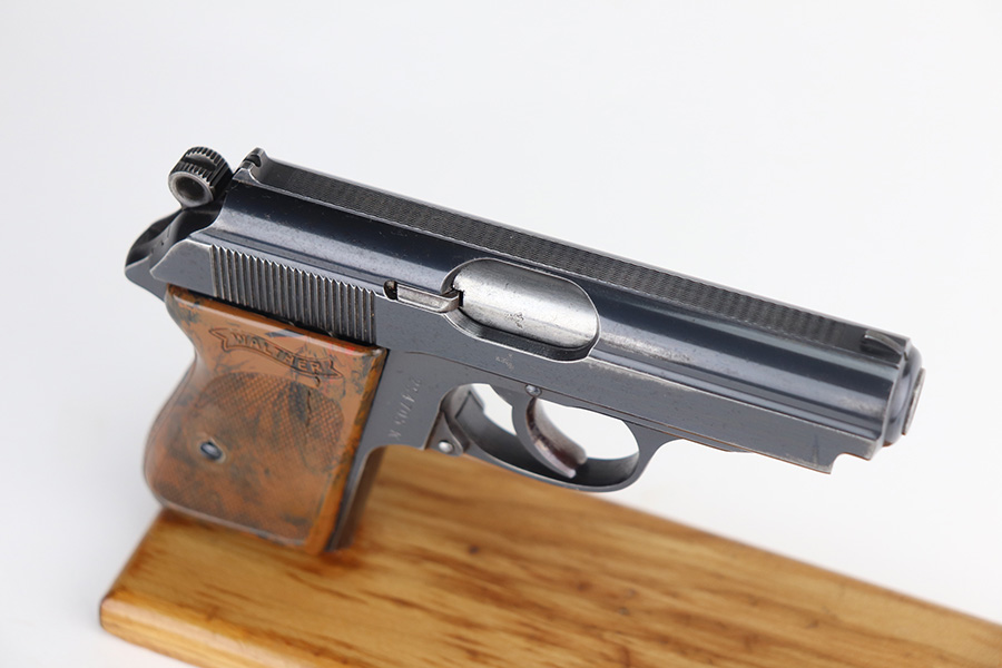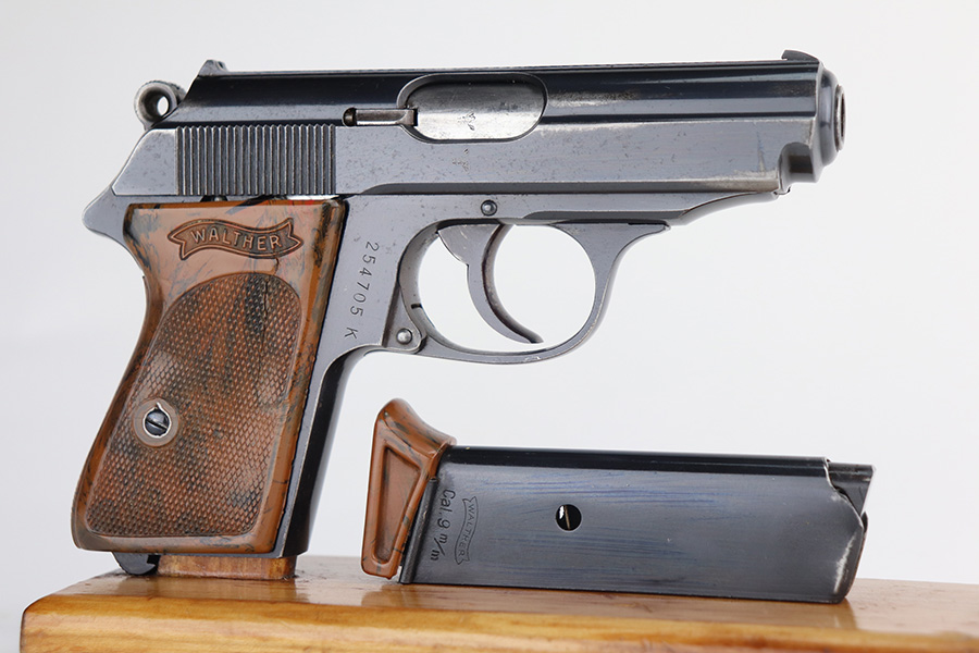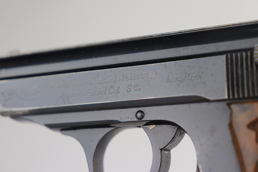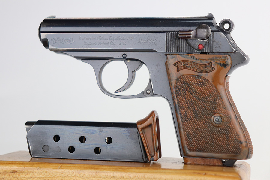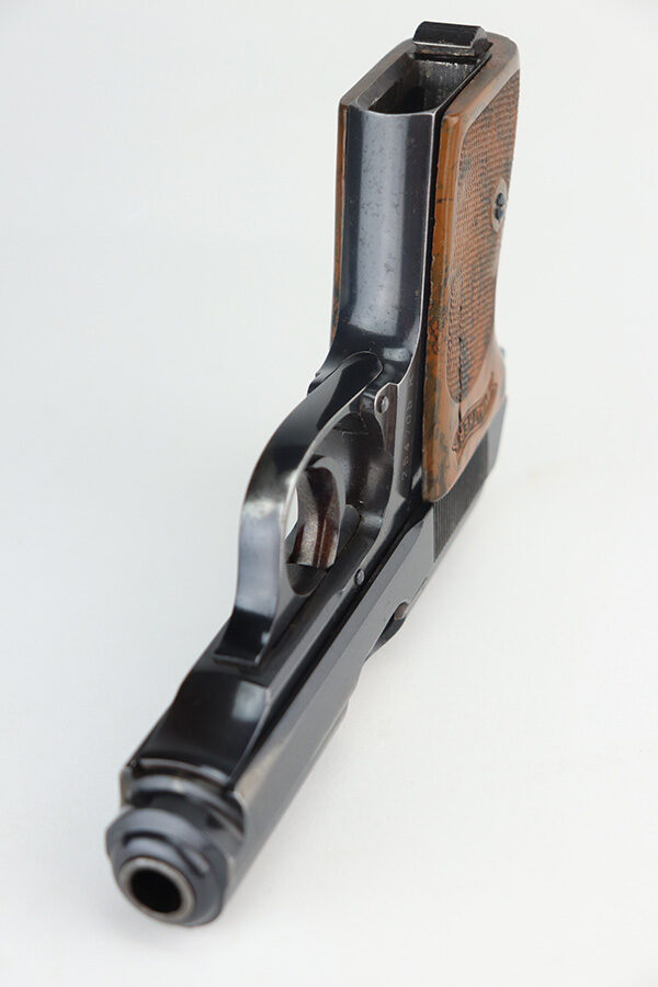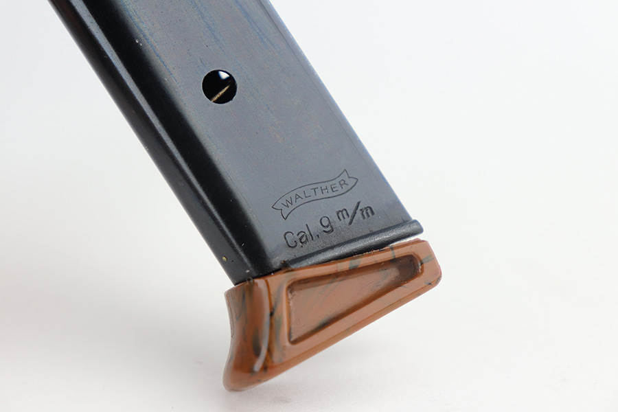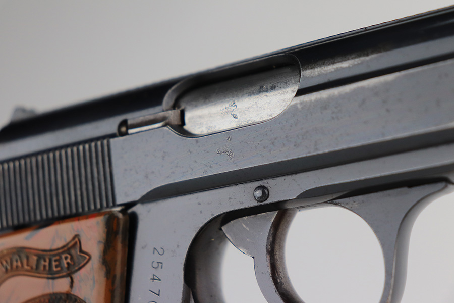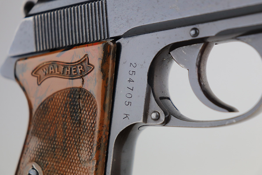 8/2/21 – This is a very nice example of a rare 9mm Walther PPK made in 1939-40. It is all matching and has the proper “Eagle N” proofs. Only about 3.5% of total Walther PPK production was done in this caliber. This one has retained about 94% of its original finish. There is minor wear concentrated around the muzzle and high edges of the slide. One area of wear on the round edge of the right side of the slide. Areas of pin-pricking on the round edge of the left side of the slide and on the front strap. Comes with a nice brown Walther grip – there is a crack on the right side. Also comes with a proper 9mm finger extension magazine. The bore is shiny with strong rifling and a few very light scratches.