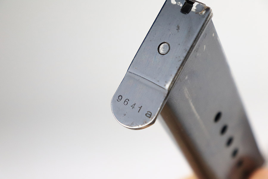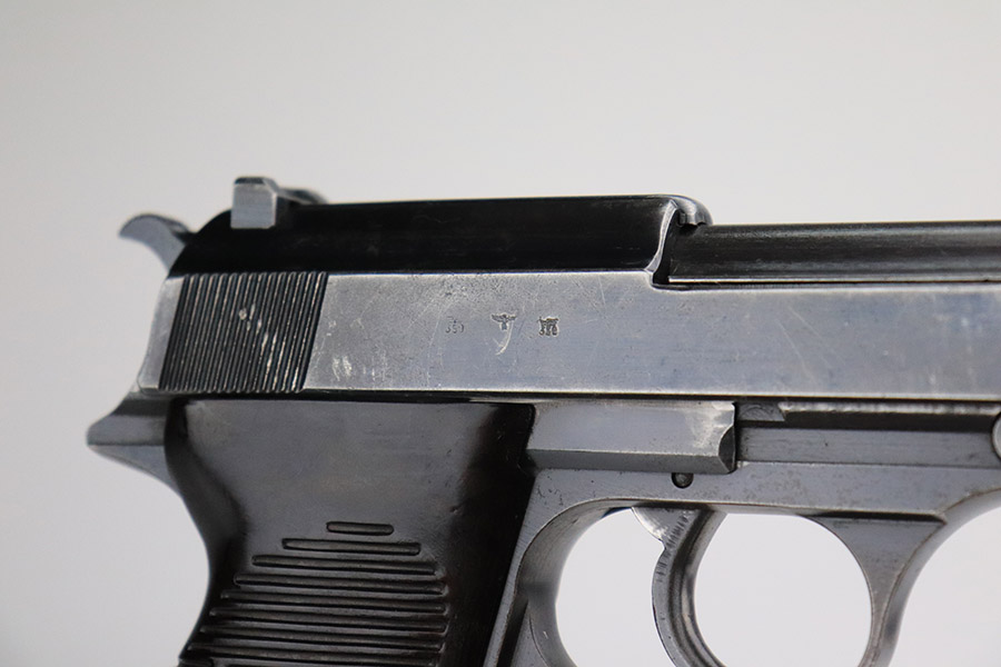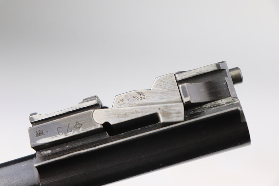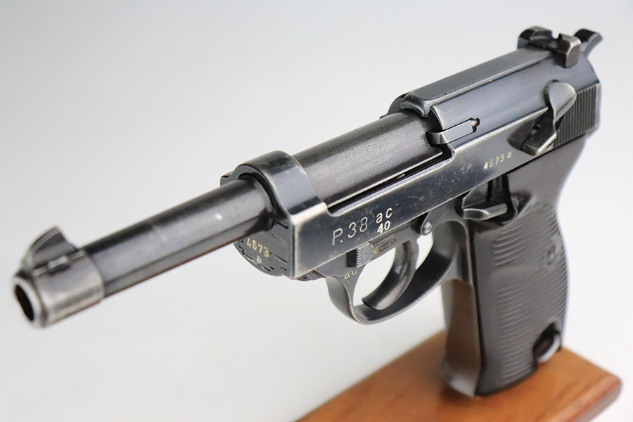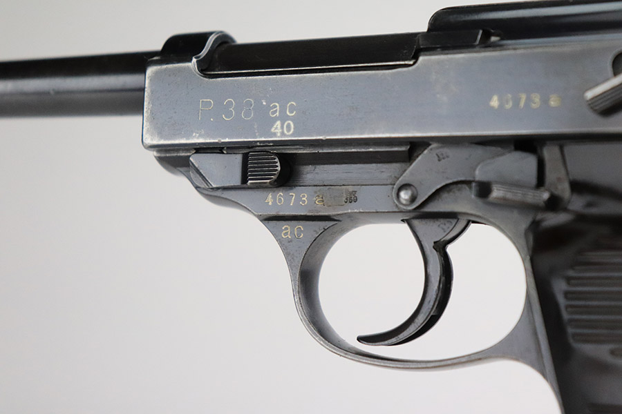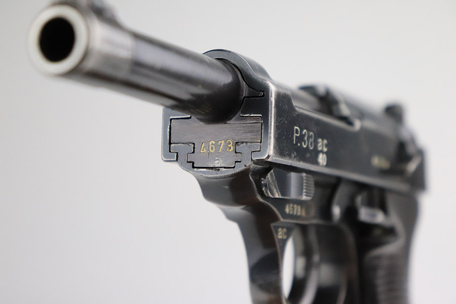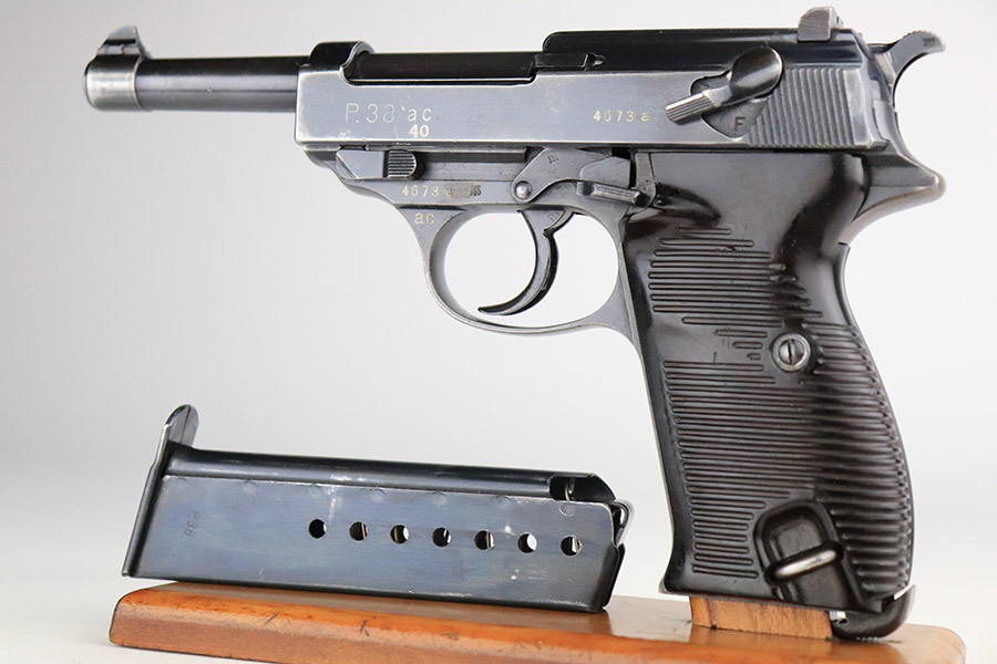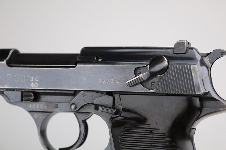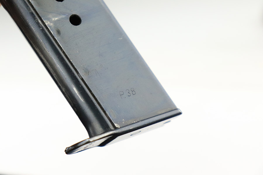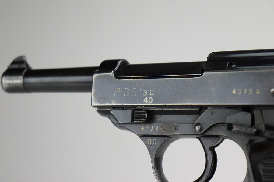 11/7/22 – This is a nice example of a very hard to find Walther P.38, with ’40’ added under the ac proof on left side slide. There were only 5,700 of this variation produced, made in November of 1940 with the ’40’ added after the gun was blued. This pistol is in the proper range for this variation, is all matching, and has the proper “Eagle 359” military acceptance proofs throughout, even on the small parts. It appears there was a marking on the left side of the frame that has been peened – likely a post-war police marking. The gun has retained roughly 80% of its original high polish finish with spotty, scratchy wear along both sides of the slide and along the barrel. Some thinning and dulling of the finish on the front strap. The gun comes with nice Walther grips that are “Eagle 359” proofed but not numbered. The magazine is numbered and not matching, but it is in the correct “a” serial block. The bore has decent rifling, but there is pin-pricking throughout. De-cocker is functional.