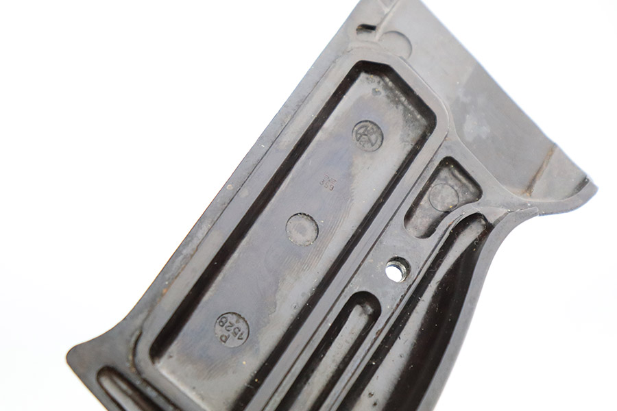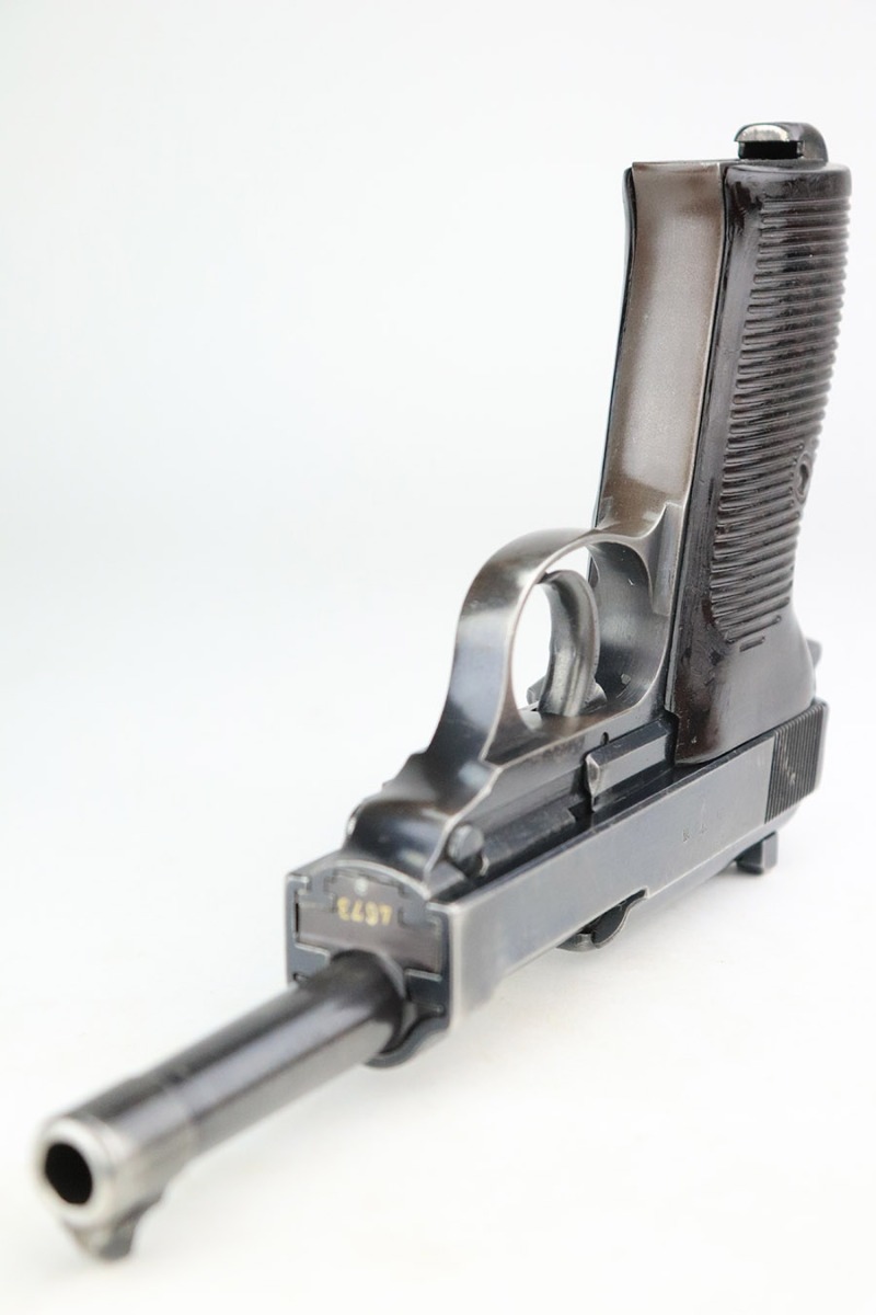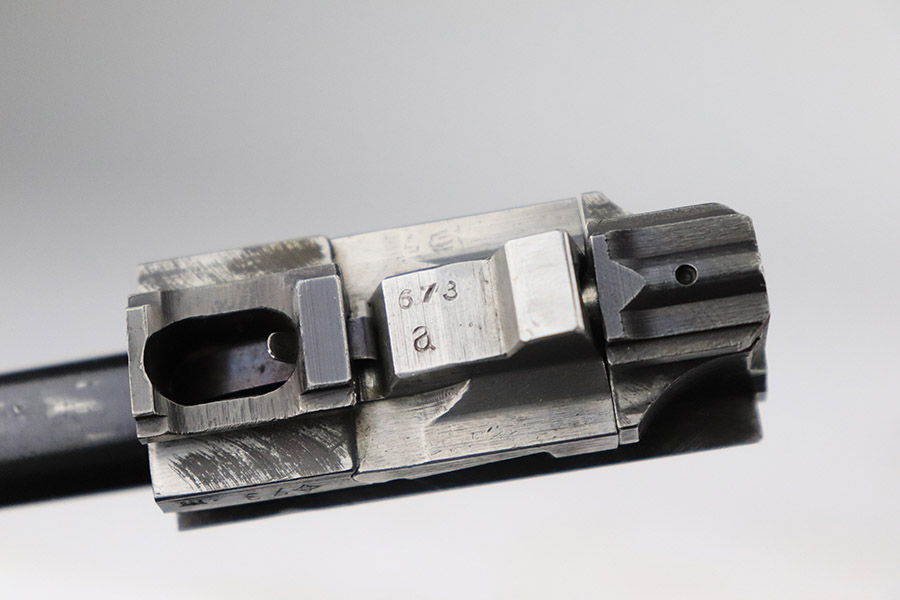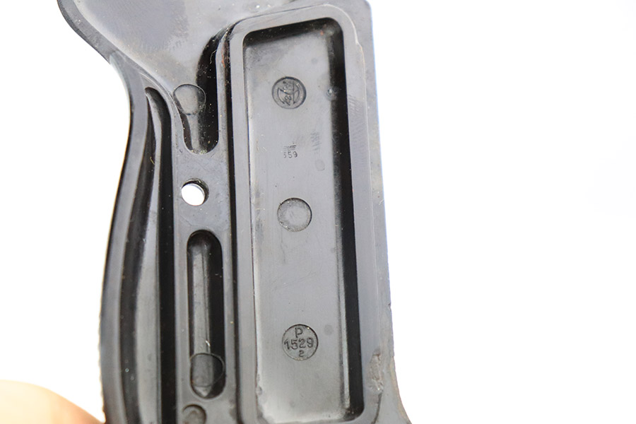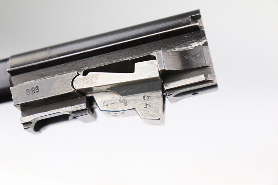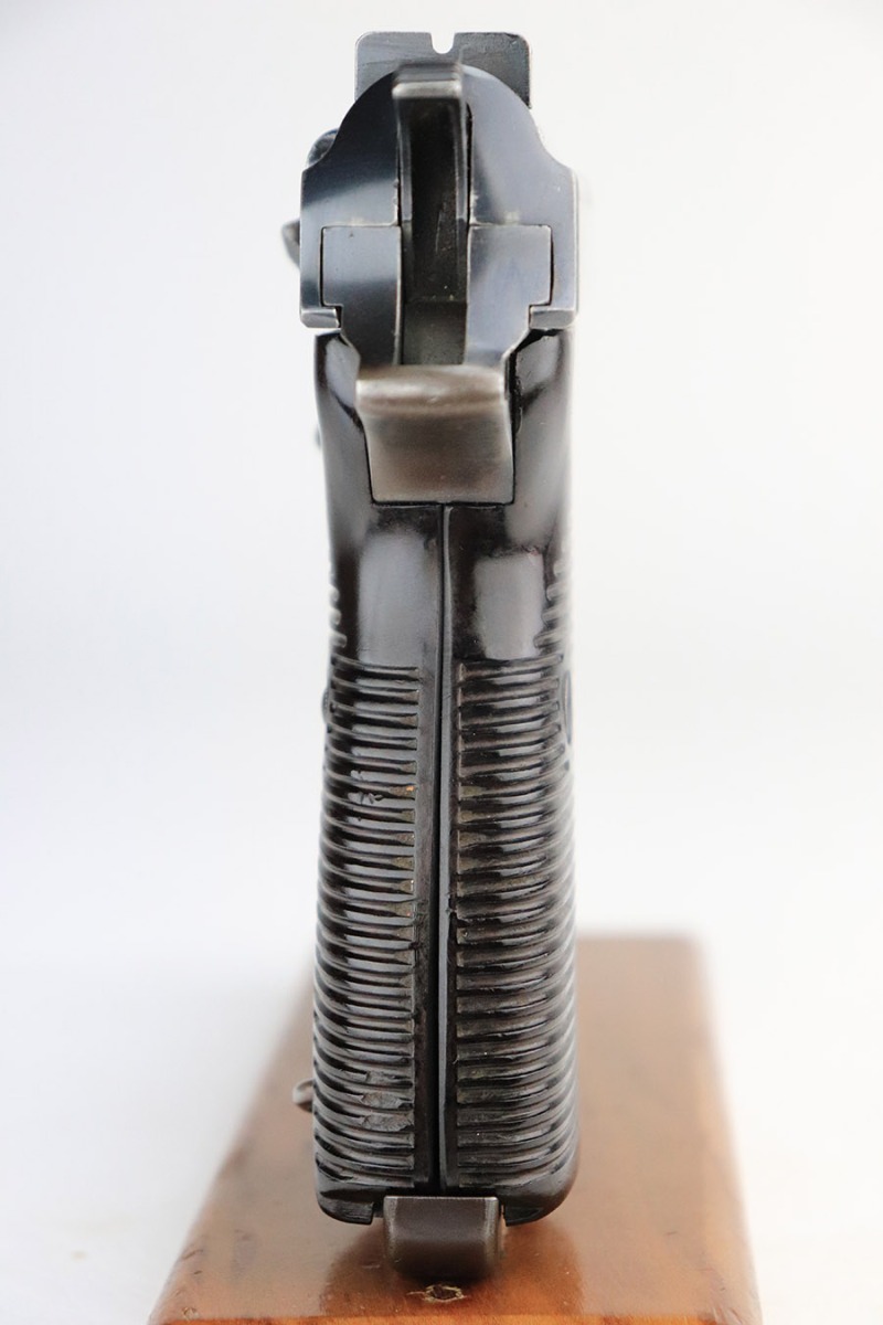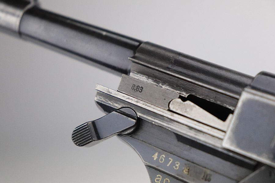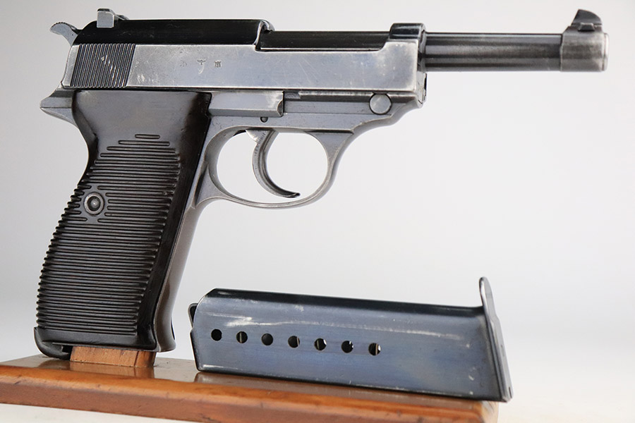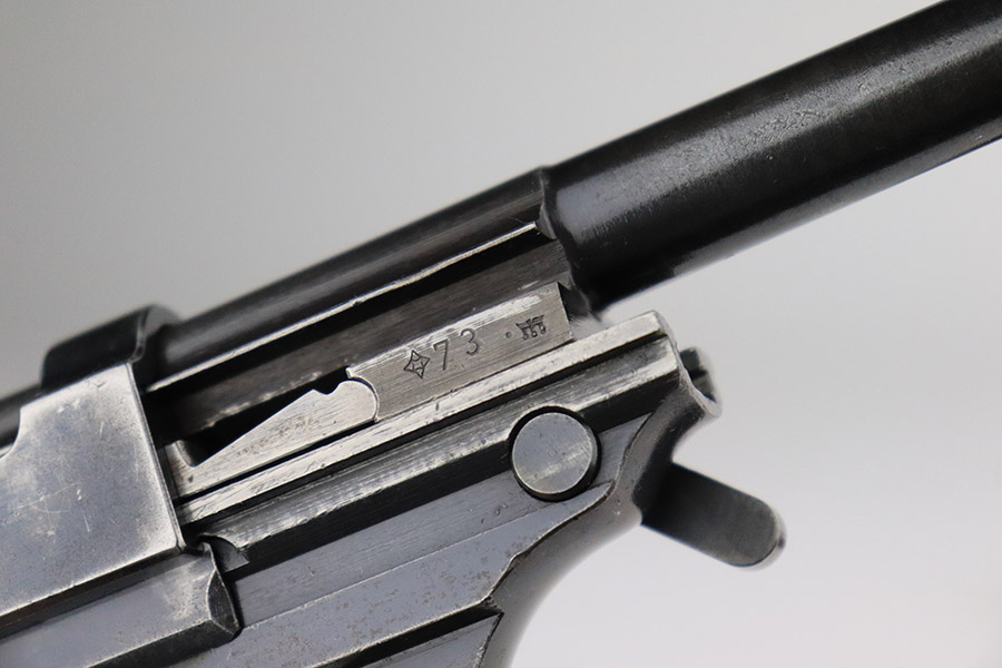 11/7/22 – This is a nice example of a very hard to find Walther P.38, with ’40’ added under the ac proof on left side slide. There were only 5,700 of this variation produced, made in November of 1940 with the ’40’ added after the gun was blued. This pistol is in the proper range for this variation, is all matching, and has the proper “Eagle 359” military acceptance proofs throughout, even on the small parts. It appears there was a marking on the left side of the frame that has been peened – likely a post-war police marking. The gun has retained roughly 80% of its original high polish finish with spotty, scratchy wear along both sides of the slide and along the barrel. Some thinning and dulling of the finish on the front strap. The gun comes with nice Walther grips that are “Eagle 359” proofed but not numbered. The magazine is numbered and not matching, but it is in the correct “a” serial block. The bore has decent rifling, but there is pin-pricking throughout. De-cocker is functional.