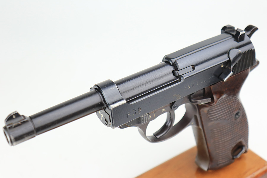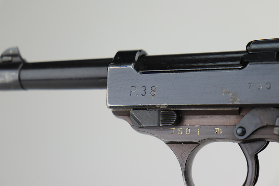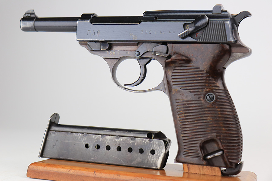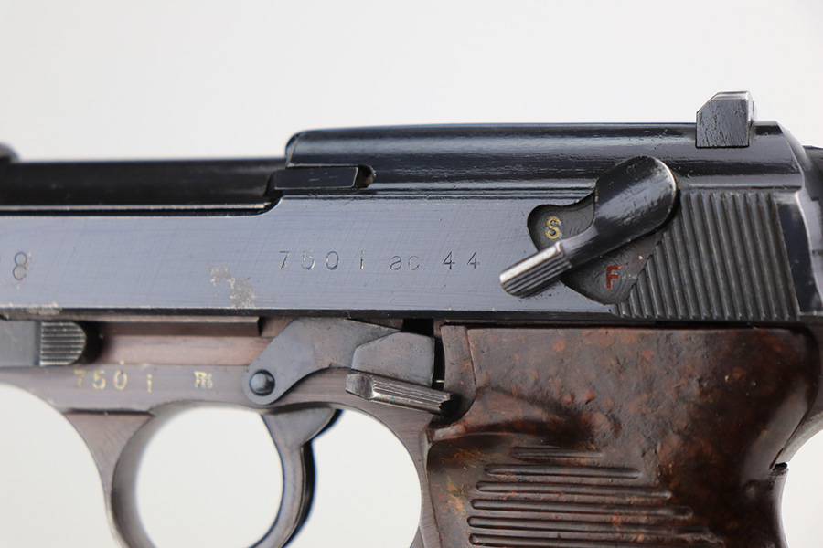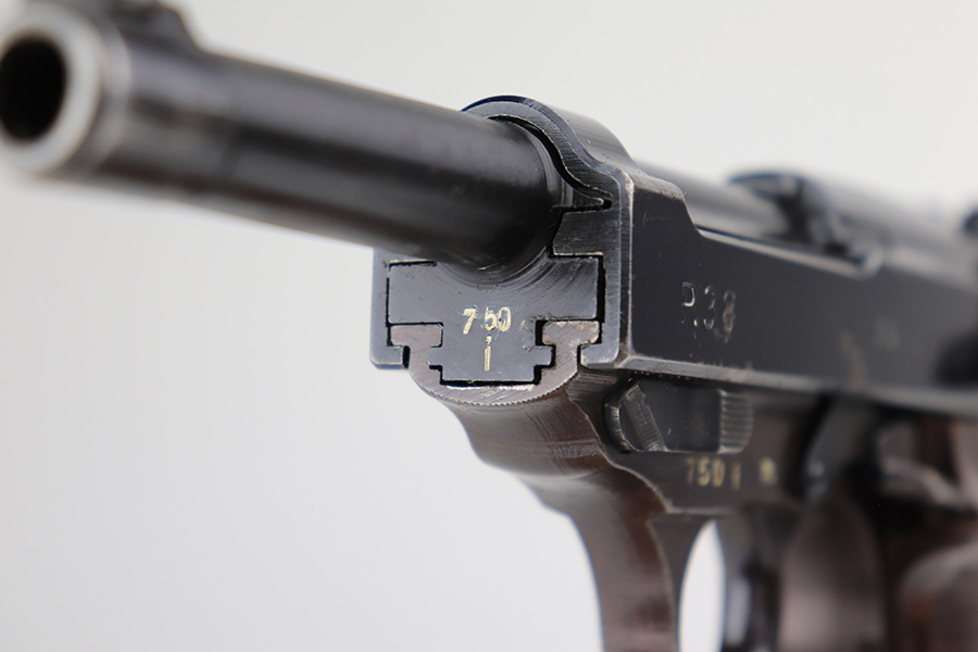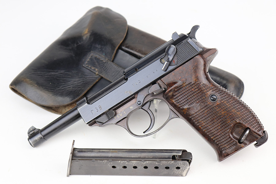 3/11/22 – This is an AC 44 Walther P.38 issued to the Nazi military in 1944. The gun is all matching and has the proper “Eagle 359” Nazi military acceptance proofs throughout. This one also has a rare eagle proof on the left side of the trigger guard, similar to the test eagle proofs found on early Mauser HSC’s. It comes as a rig with a nice 1944-dated softshell holster and one period-correct Walther magazine. The gun has retained about 92-93% of its original finish. Most of the finish loss is on the front strap, so the profile views are excellent. There is just minor wear at the very front edges of the slide and around the muzzle. A couple of small spots of discoloration on the left side of the slide. A few very light surface scratches on the right side of the slide. Comes with excellent period-correct reddish grips. The bore is mint. De-cocker is functional.