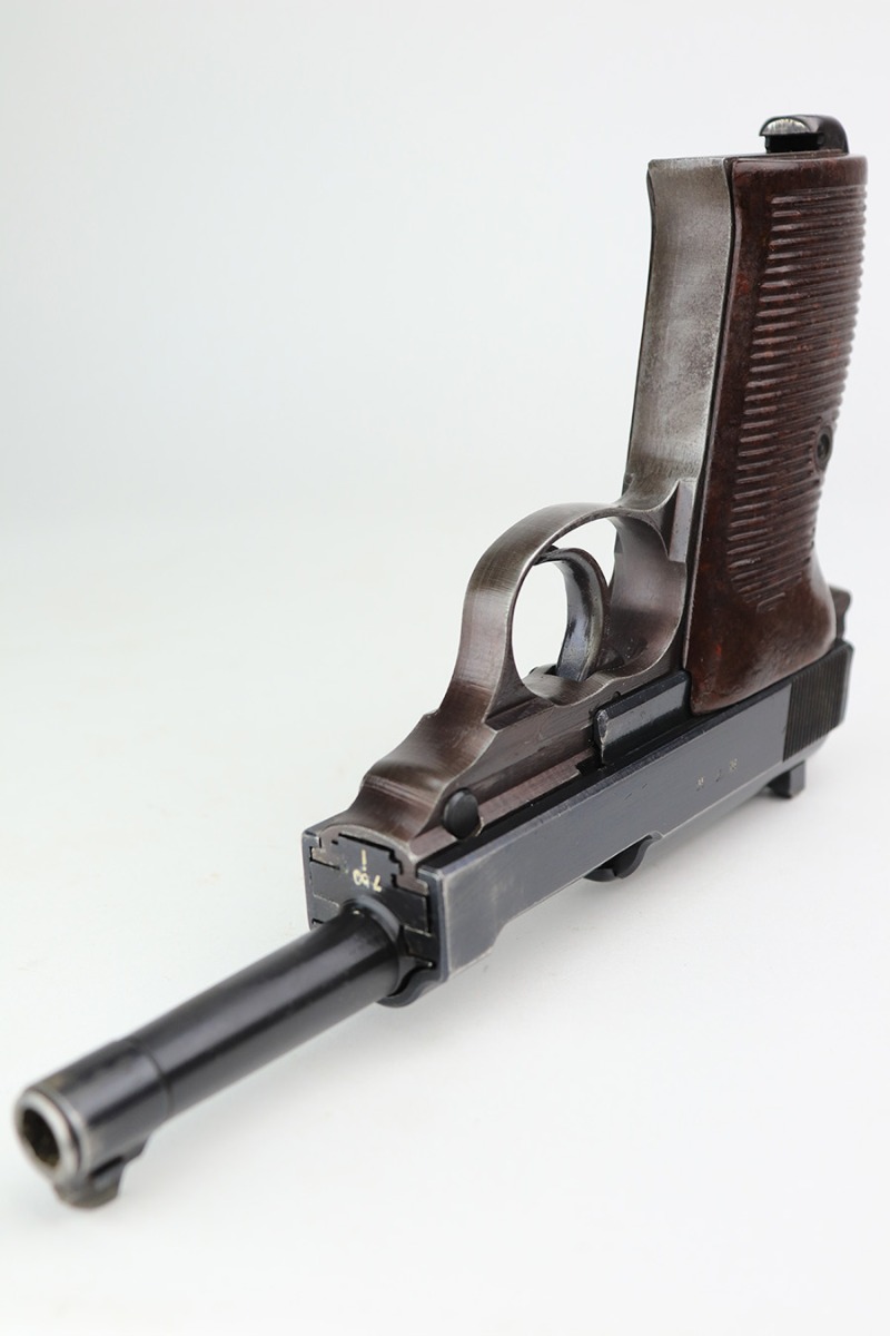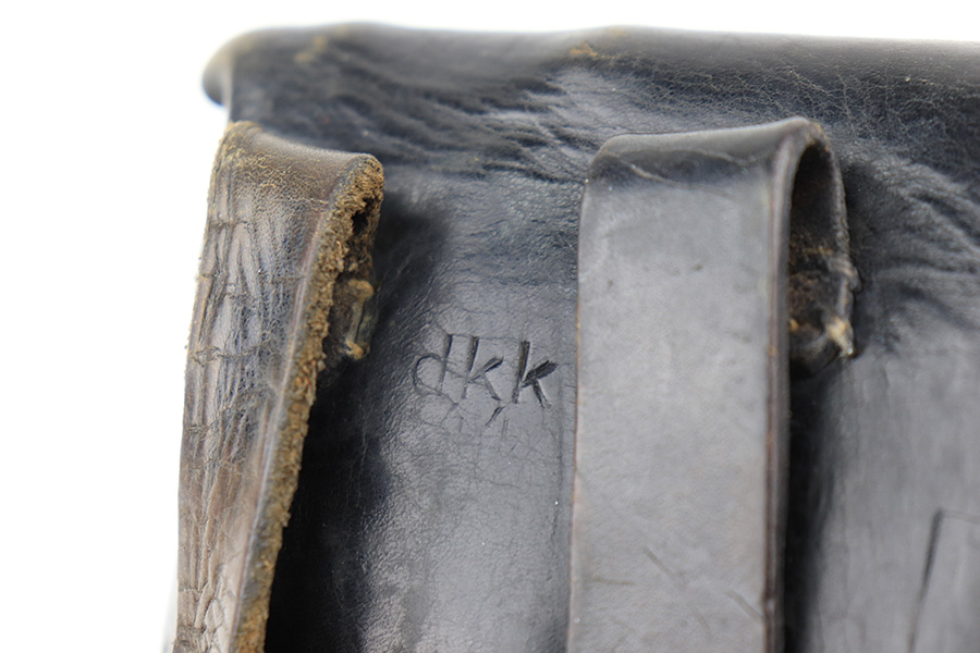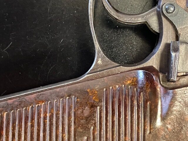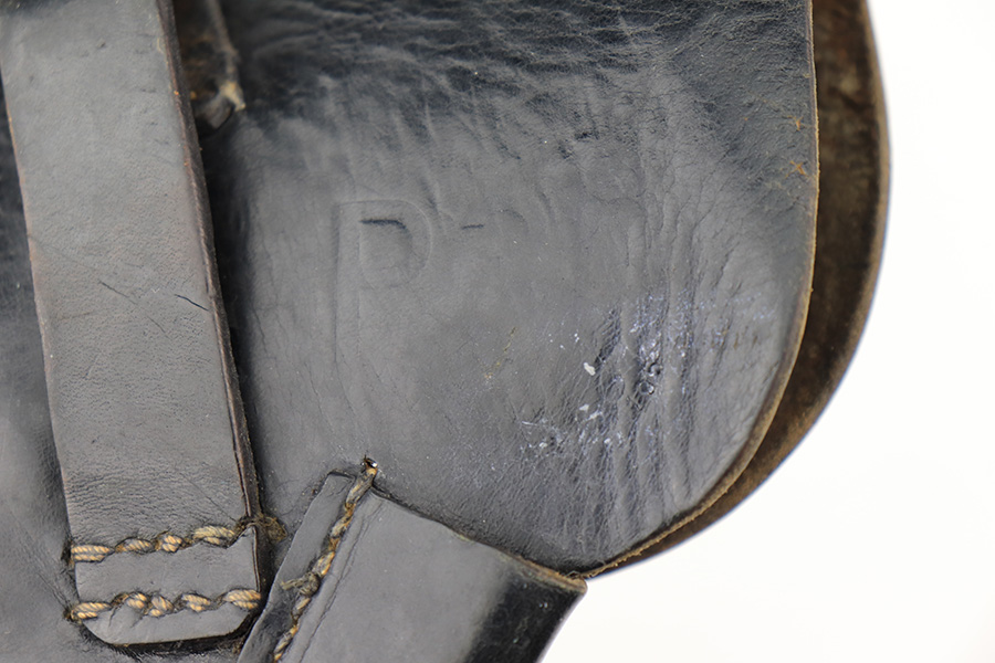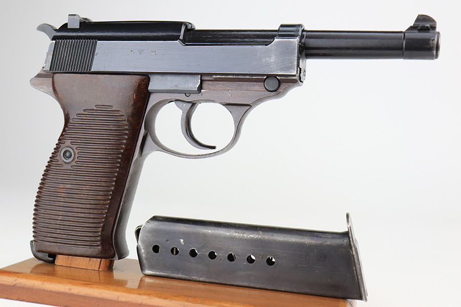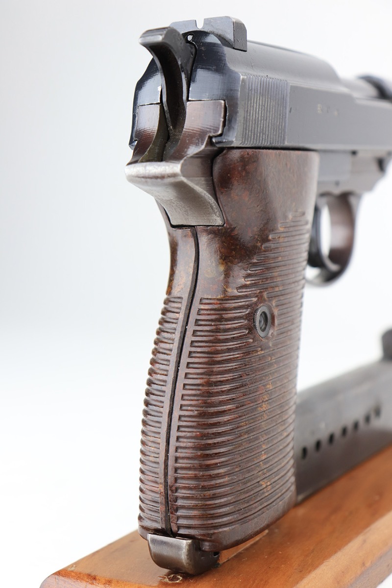 3/11/22 – This is an AC 44 Walther P.38 issued to the Nazi military in 1944. The gun is all matching and has the proper “Eagle 359” Nazi military acceptance proofs throughout. This one also has a rare eagle proof on the left side of the trigger guard, similar to the test eagle proofs found on early Mauser HSC’s. It comes as a rig with a nice 1944-dated softshell holster and one period-correct Walther magazine. The gun has retained about 92-93% of its original finish. Most of the finish loss is on the front strap, so the profile views are excellent. There is just minor wear at the very front edges of the slide and around the muzzle. A couple of small spots of discoloration on the left side of the slide. A few very light surface scratches on the right side of the slide. Comes with excellent period-correct reddish grips. The bore is mint. De-cocker is functional.