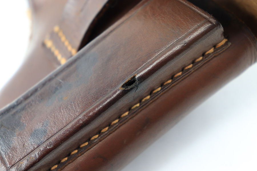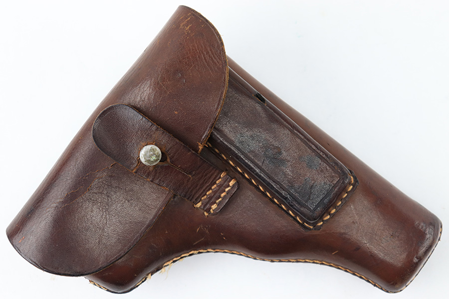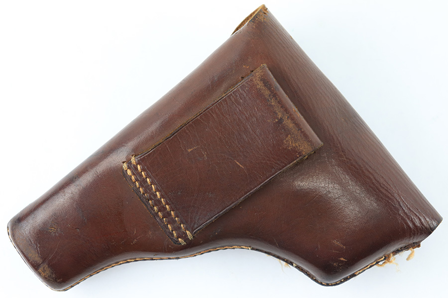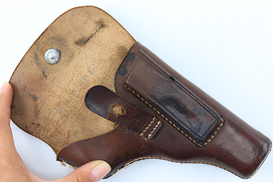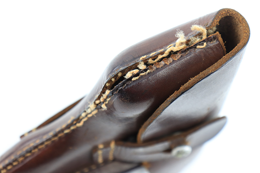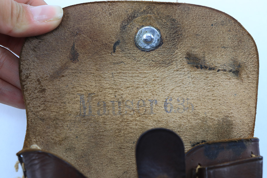 8/21/23 – This is a rare variation holster for a .25 caliber Mauser pistol. The holster was likely made in the 1930’s and is in good condition despite having some loose and missing stitching along the left side of the holster. Despite this stitching flaw, the holster holds shape nicely and is otherwise in great condition. There’s an AKAH maker stamp under the closure strap, and the interior leather is Mauser 6,35 designation ink stamped. The leather is clean with some light surface wear and normal pliability.