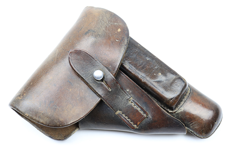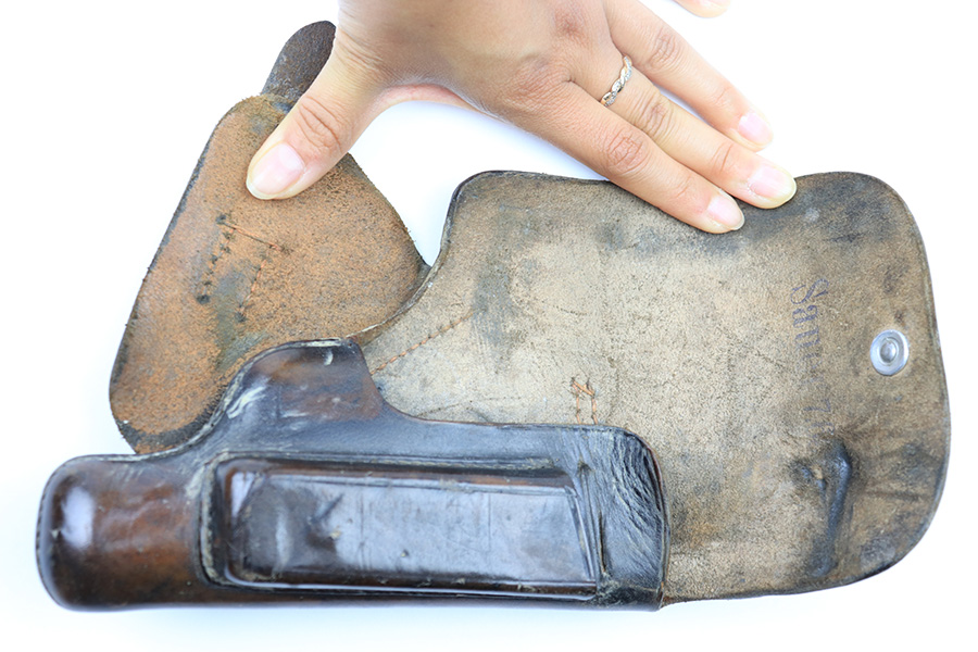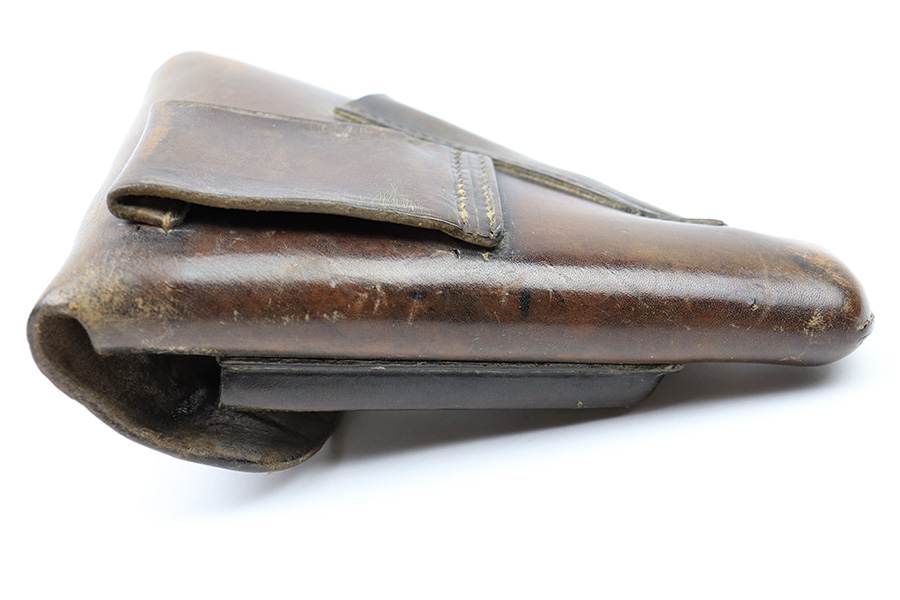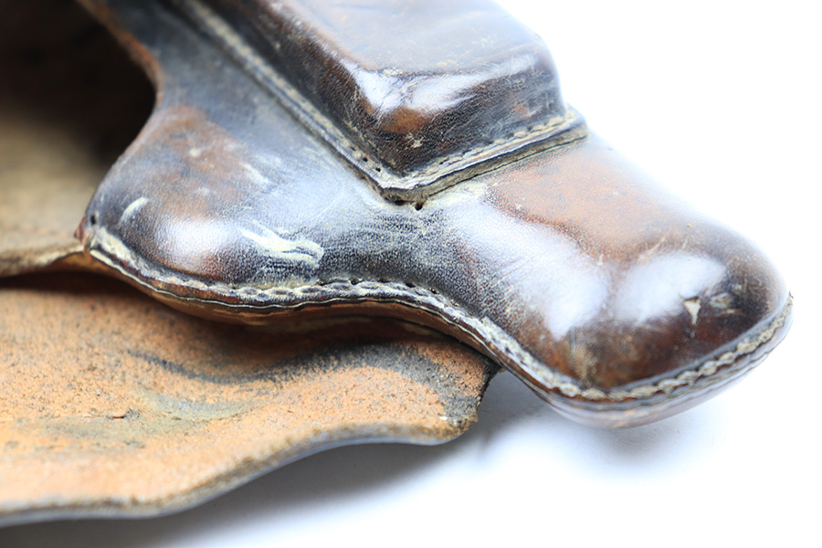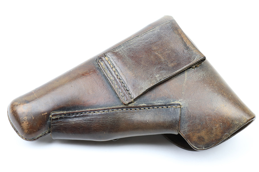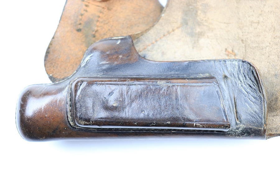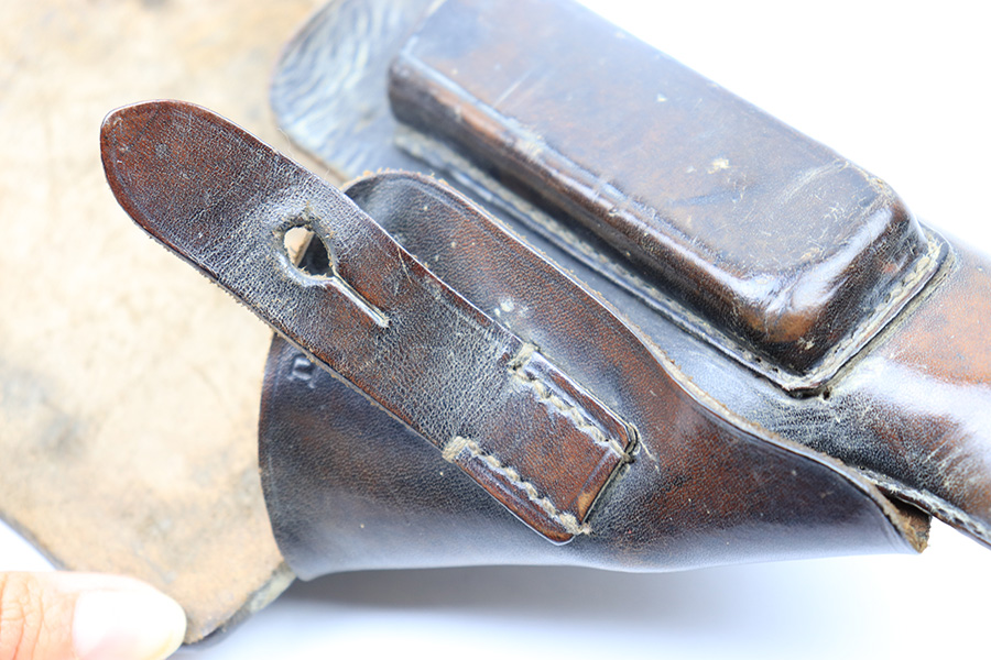6/22/22 – This is an original AKAH made holster for a Sauer 38h pistol. The holster is specifically for the Sauer 38h, as indicated by the interior ink stamp which reads “Sauer 7,65”. These are scarce and seldom found with the interior ink stamp still in tact like this example. There’s an AKAH stamp under the closure strap. The leather is strong with normal pliability and some typical use wear and aging. No cracks or issues with the leather. All original stitching in tact as well. A very nice, rare collectible holster.