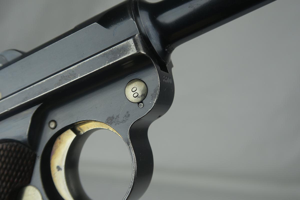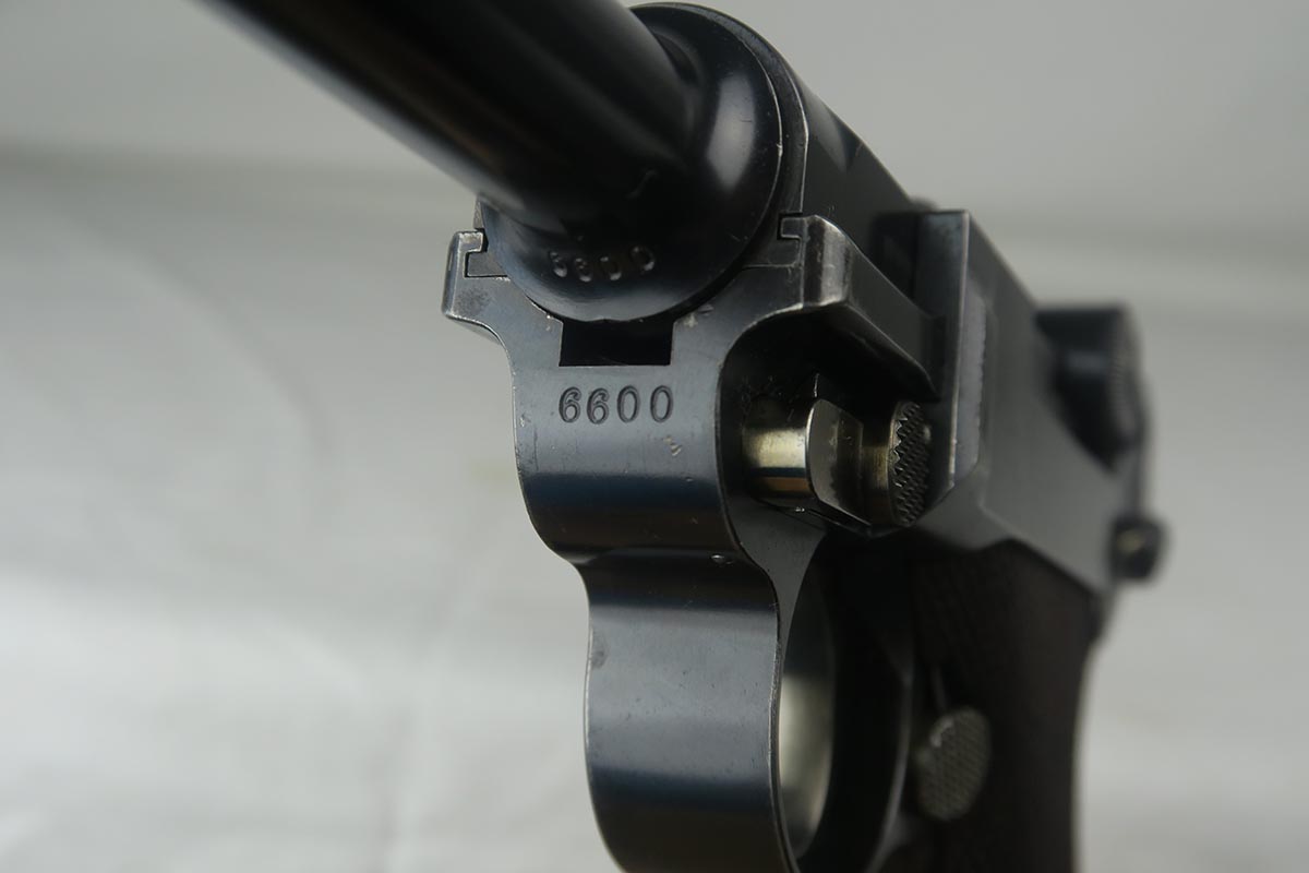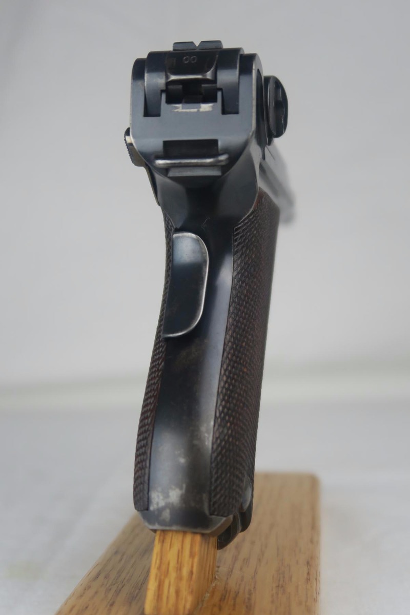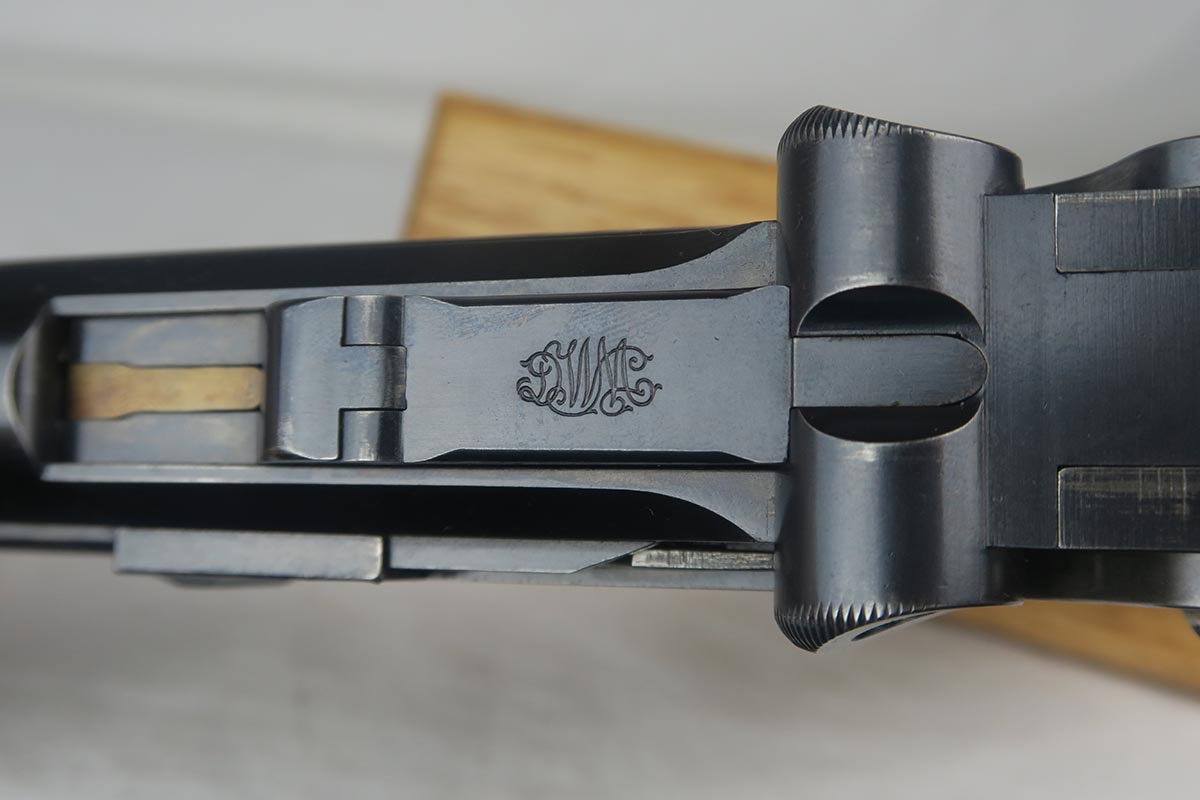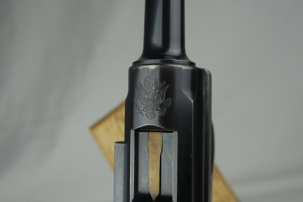 8/7/17 – Here we have an extremely rare and correct American Eagle Army Test luger produced by DWM.  In April of 1901, the United States Board of Ordnance and Fortifications put in an order for 1,000 of these lugers following test trials in which the model was fired 2,000 times under the harshest conditions possible.  These lugers feature the Great Seal over the chamber, which was not included upon request, but rather was found to be a great sales tool for the Swiss market by DWM following their initial sales of the same model but featuring the Swiss sunburst.  The characteristics that separate these American Test Eagle lugers from the other Model 1900 lugers are the lack of proofs, the lack of a ‘GERMANY’ import stamp, and the last two digits of the serial number on the right end of the takedown lever.  This particular pistol features grips that are numbered and matching to the gun, and a wood-bottom magazine that is unmarked.  It rates at about 90% bluing, with most of the wear on the straps.  Very nice bore with no major flaws.  As of the printing of Michael Reese’s book on the subject, there was only about 100 of these known and identified in the accepted serial range (6099-7098)!