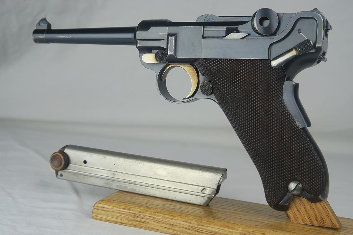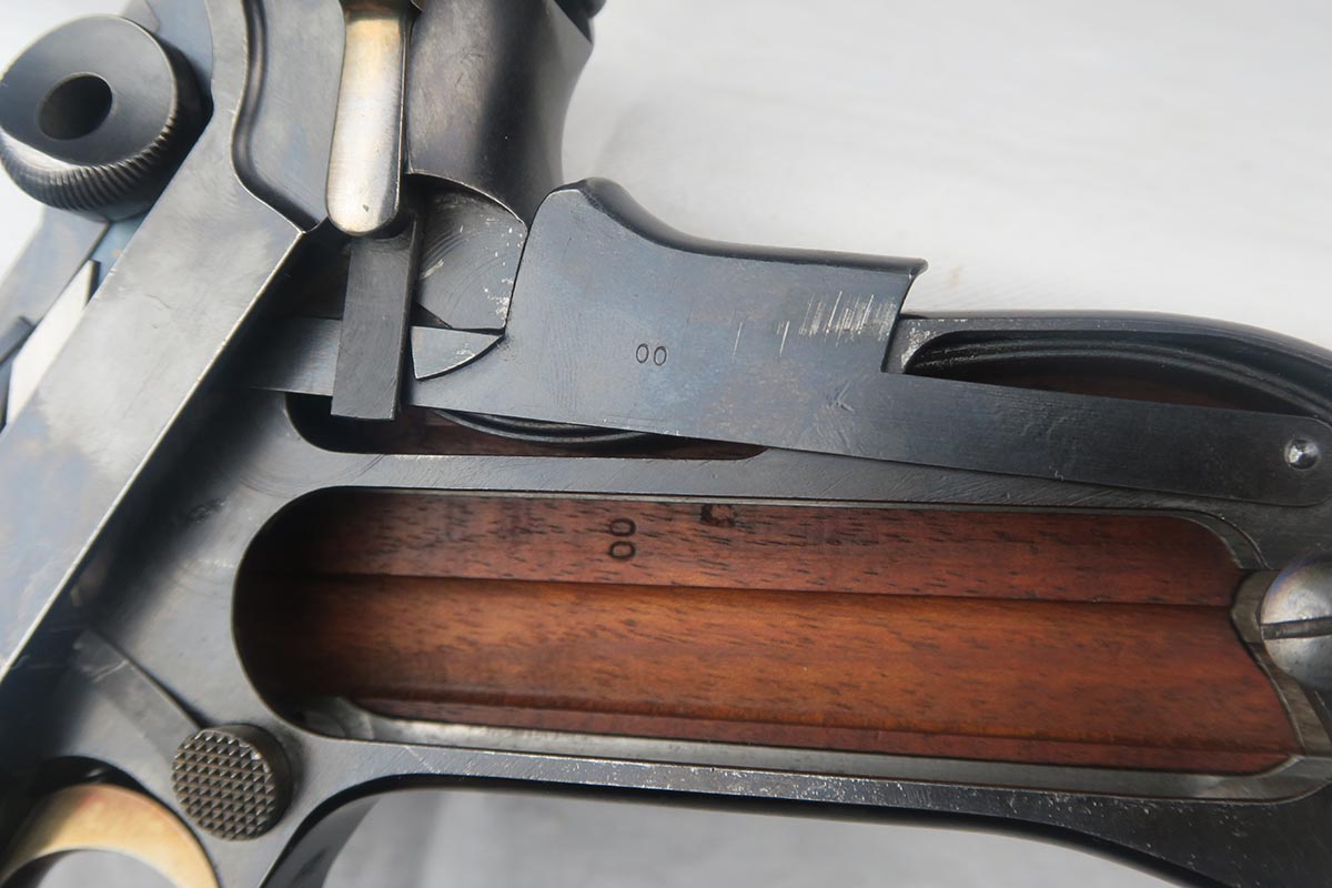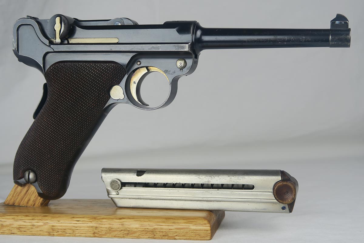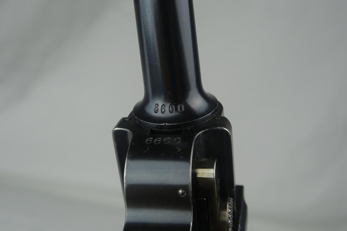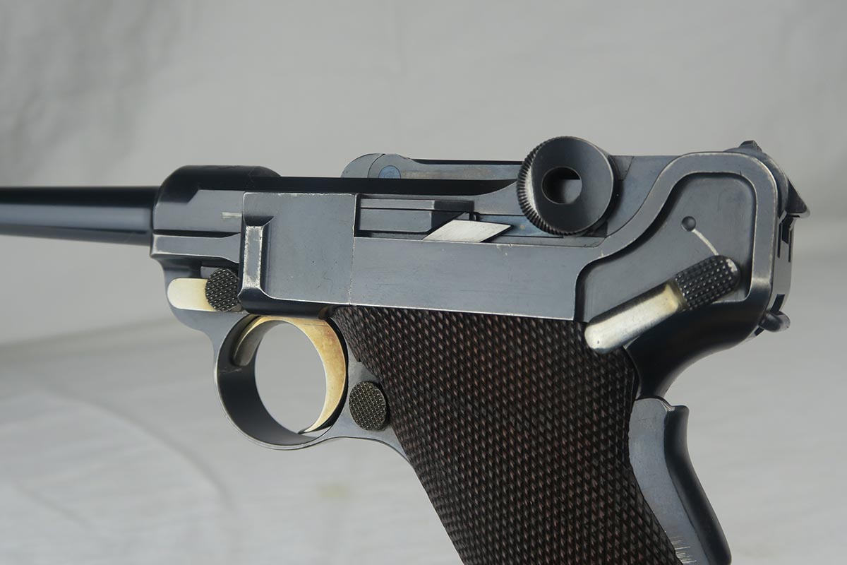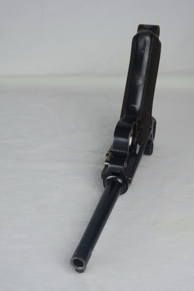 8/7/17 – Here we have an extremely rare and correct American Eagle Army Test luger produced by DWM.  In April of 1901, the United States Board of Ordnance and Fortifications put in an order for 1,000 of these lugers following test trials in which the model was fired 2,000 times under the harshest conditions possible.  These lugers feature the Great Seal over the chamber, which was not included upon request, but rather was found to be a great sales tool for the Swiss market by DWM following their initial sales of the same model but featuring the Swiss sunburst.  The characteristics that separate these American Test Eagle lugers from the other Model 1900 lugers are the lack of proofs, the lack of a ‘GERMANY’ import stamp, and the last two digits of the serial number on the right end of the takedown lever.  This particular pistol features grips that are numbered and matching to the gun, and a wood-bottom magazine that is unmarked.  It rates at about 90% bluing, with most of the wear on the straps.  Very nice bore with no major flaws.  As of the printing of Michael Reese’s book on the subject, there was only about 100 of these known and identified in the accepted serial range (6099-7098)!
