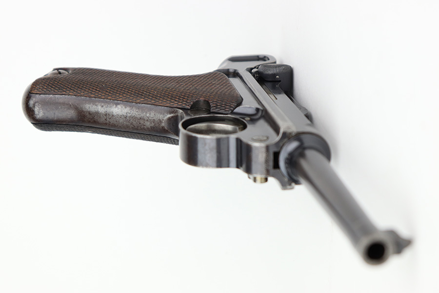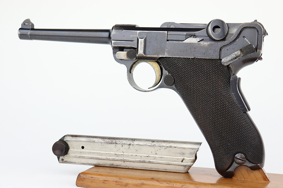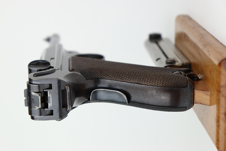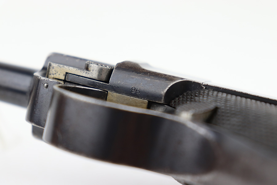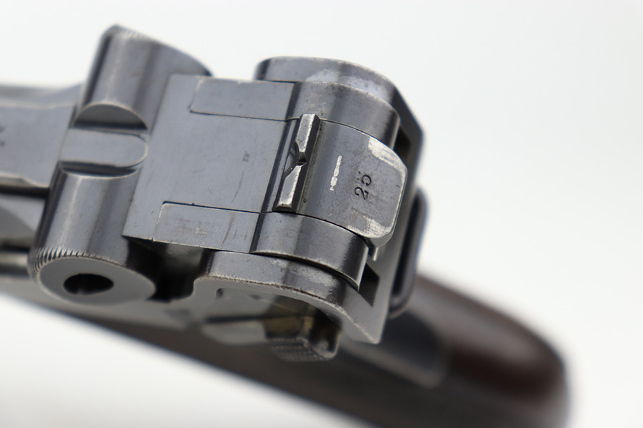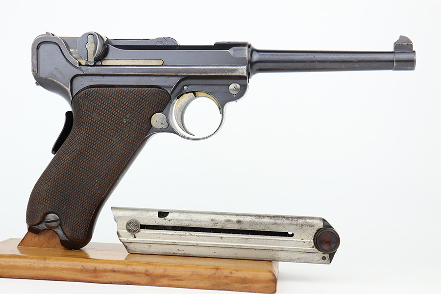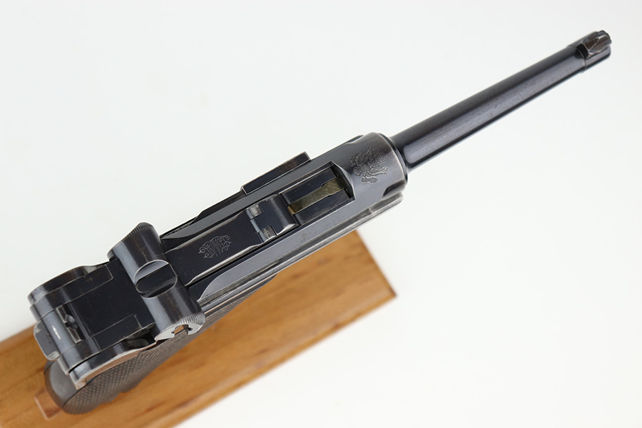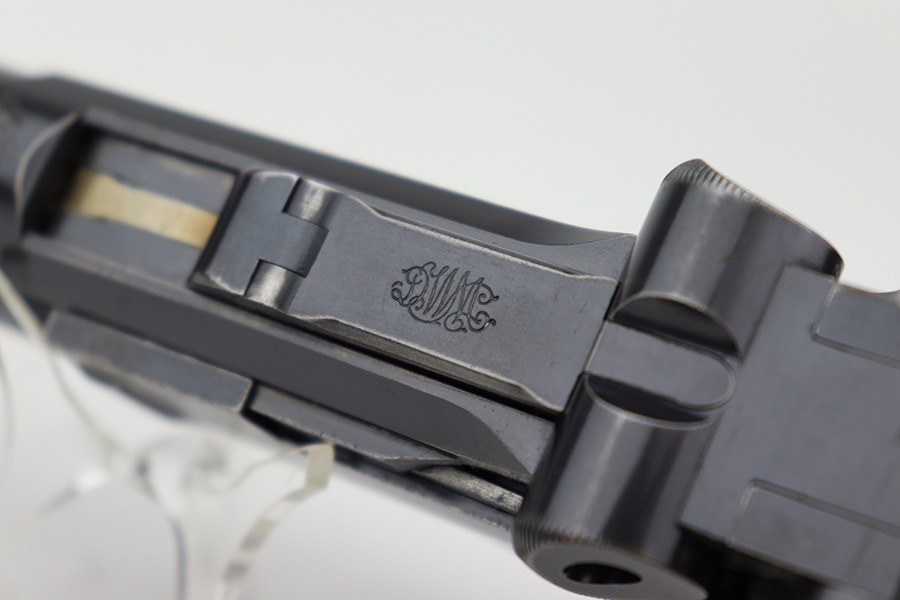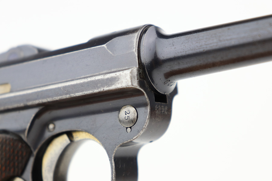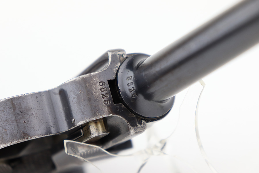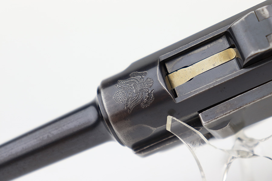 8/10/22 – Here we have an extremely rare American Eagle Army Test Luger rig produced by DWM. In April of 1901, the United States Board of Ordnance and Fortifications put in an order for 1,000 of these Lugers following test trials in which the model was fired 2,000 times under the harshest conditions possible. These Lugers feature the Great Seal over the chamber, which was not included upon request, but rather was found to be a great sales tool for the Swiss market by DWM following their initial sales of the same model but featuring the Swiss sunburst. The characteristics that separate these American Test Eagle Lugers from the other Model 1900 Lugers are the lack of proofs, the lack of a ‘GERMANY’ import stamp, and the last two digits of the serial number on the right end of the takedown lever. This particular pistol features grips that are numbered and matching to the gun, and a correct wood-bottom magazine, though it does have a crack in the base. The pistol’s bluing rates at about 70-75% original finish, with a nice profile but the majority of finish loss is on the grip straps. The bore has good rifling but notable frost throughout. As of the printing of Michael Reese’s book, there was only about 100 of these known and identified in the accepted serial range (6099-7098)!