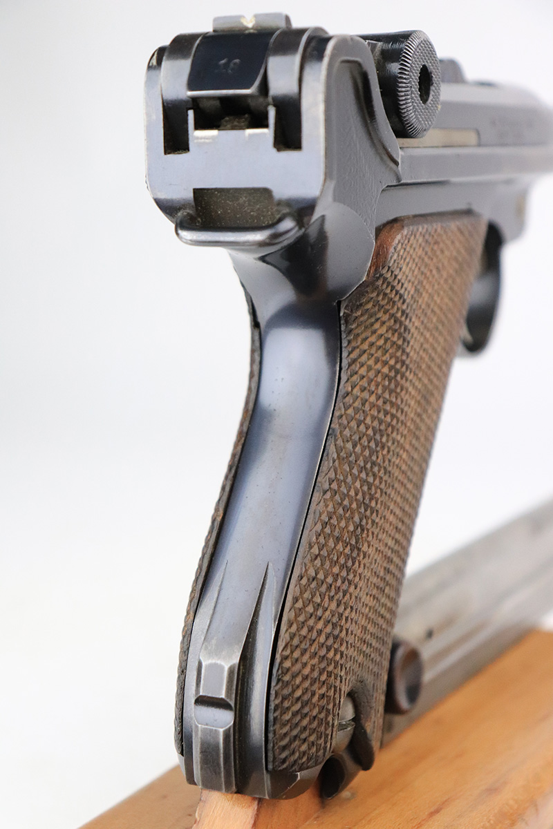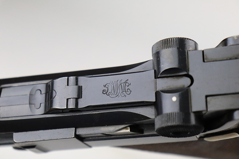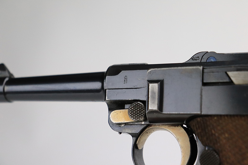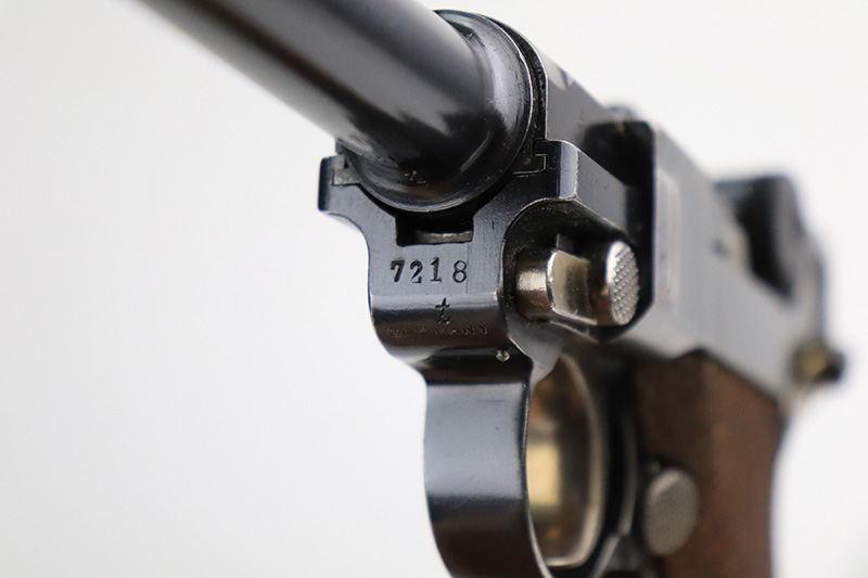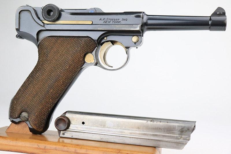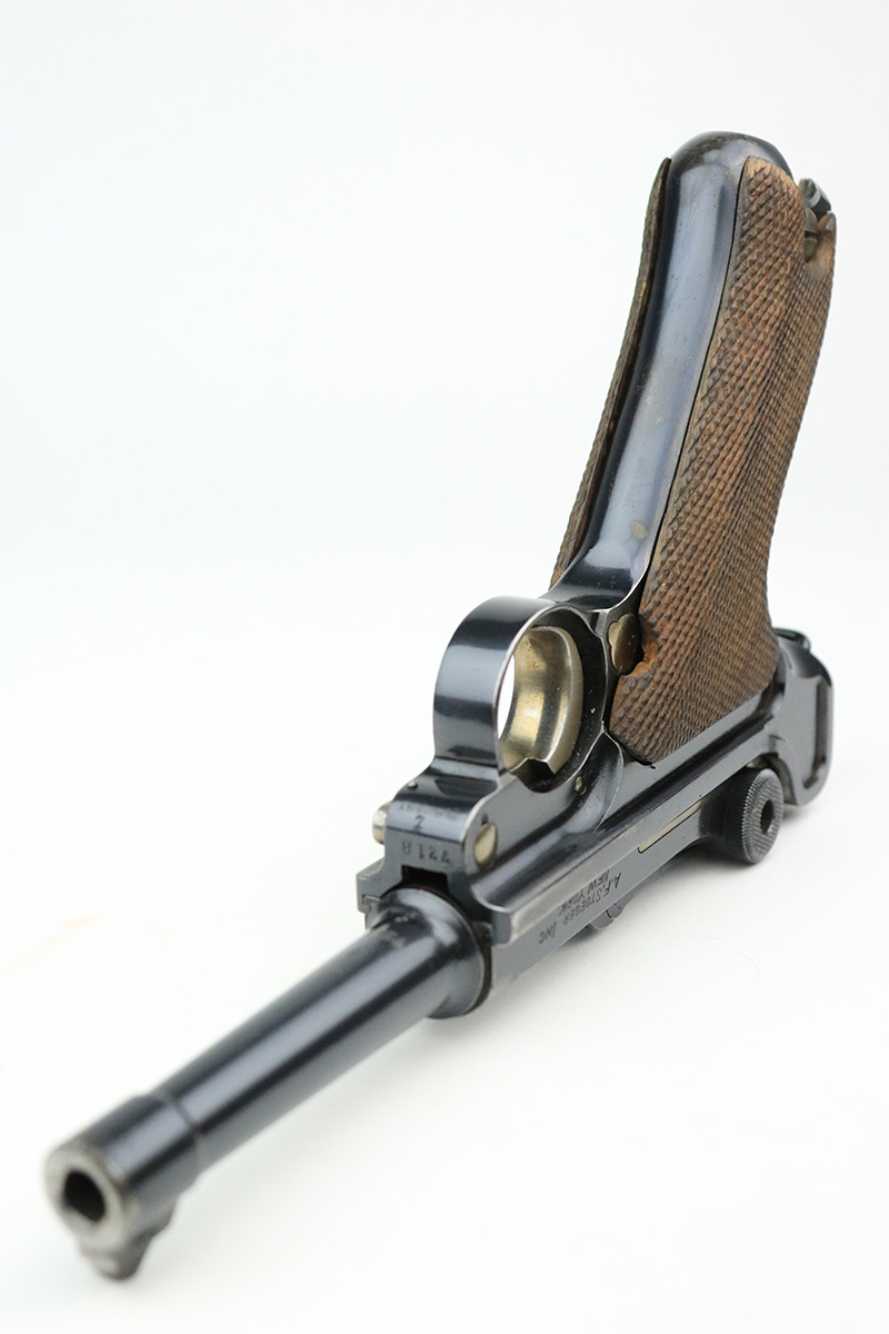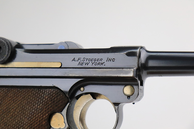 8/18/22 – This is a rare A.F. Stoeger marked Luger in excellent, original condition. These Luger pistols were manufactured in Germany during the 1930s by Mauser, after recently taking over production of Luger pistols from DWM, for Stoeger Arms Corporation to be sold in the U.S. Several different barrel lengths were offered in either 9mm or 7.65mm, and the quantity acquired by Stoeger was rather low, making this Luger a scarce variation. This particular pistol is in .30 Luger with 4-inch barrel. This example is marked with the “American Eagle” stamp on the chamber and “DWM” on the toggle. It is all matching and has the proper “Crown N” proofs. The frame is GERMANY export marked. The right side of the slide is marked A.F. STOEGER INC/NEW YORK. It has retained about 94-95% of its original finish. There is spotty wear on the grip straps and areas of minor wear on the side plate and right side rail. Comes with excellent wood grips that appear to be numbered and mismatched. Also comes with a proper “Germany” marked magazine. The bore is excellent – shiny with strong rifling.