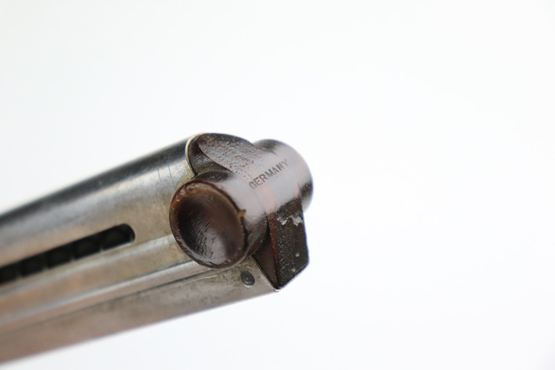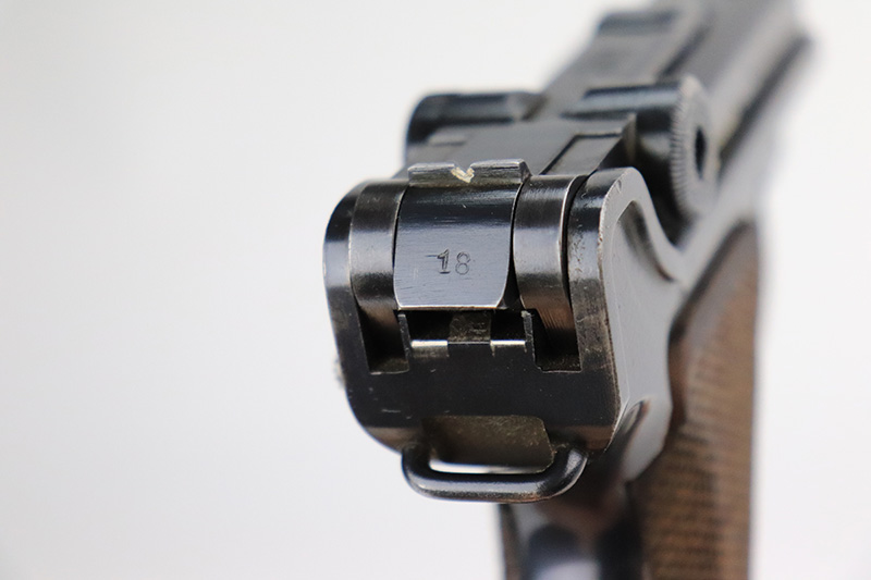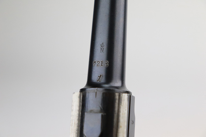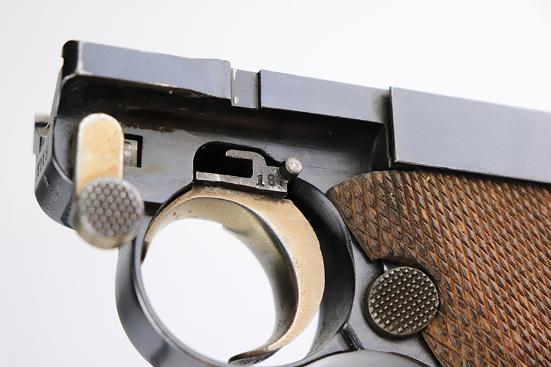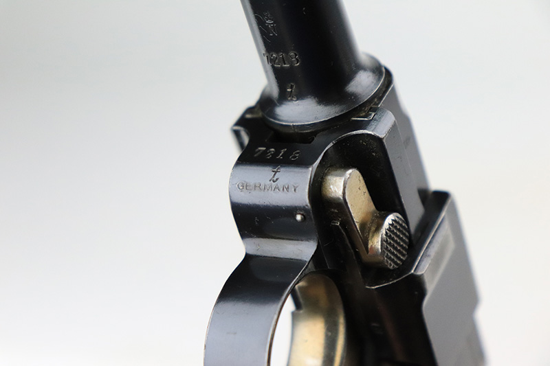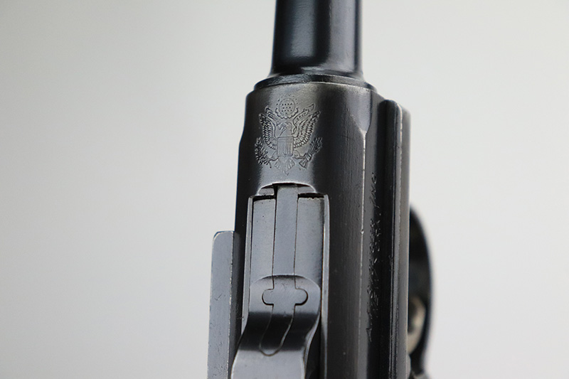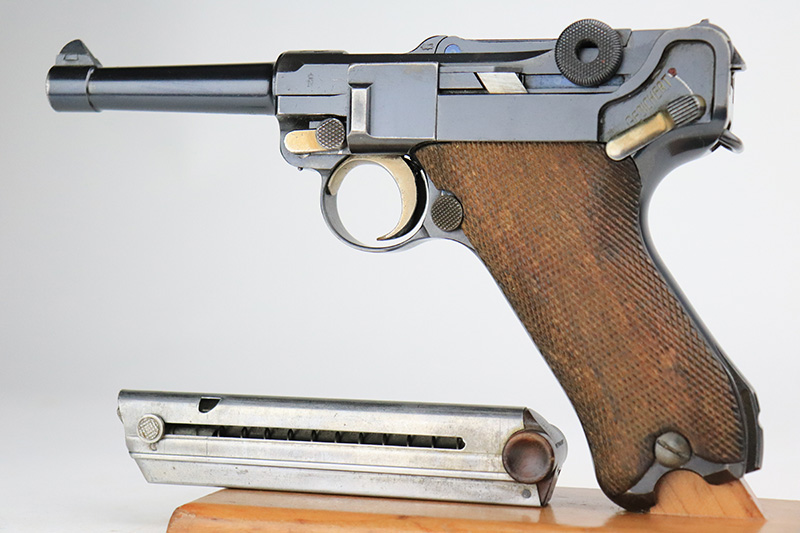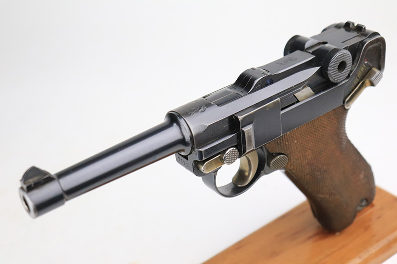 8/18/22 – This is a rare A.F. Stoeger marked Luger in excellent, original condition. These Luger pistols were manufactured in Germany during the 1930s by Mauser, after recently taking over production of Luger pistols from DWM, for Stoeger Arms Corporation to be sold in the U.S. Several different barrel lengths were offered in either 9mm or 7.65mm, and the quantity acquired by Stoeger was rather low, making this Luger a scarce variation. This particular pistol is in .30 Luger with 4-inch barrel. This example is marked with the “American Eagle” stamp on the chamber and “DWM” on the toggle. It is all matching and has the proper “Crown N” proofs. The frame is GERMANY export marked. The right side of the slide is marked A.F. STOEGER INC/NEW YORK. It has retained about 94-95% of its original finish. There is spotty wear on the grip straps and areas of minor wear on the side plate and right side rail. Comes with excellent wood grips that appear to be numbered and mismatched. Also comes with a proper “Germany” marked magazine. The bore is excellent – shiny with strong rifling.
