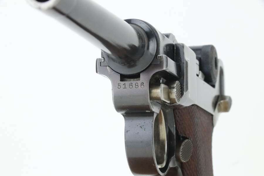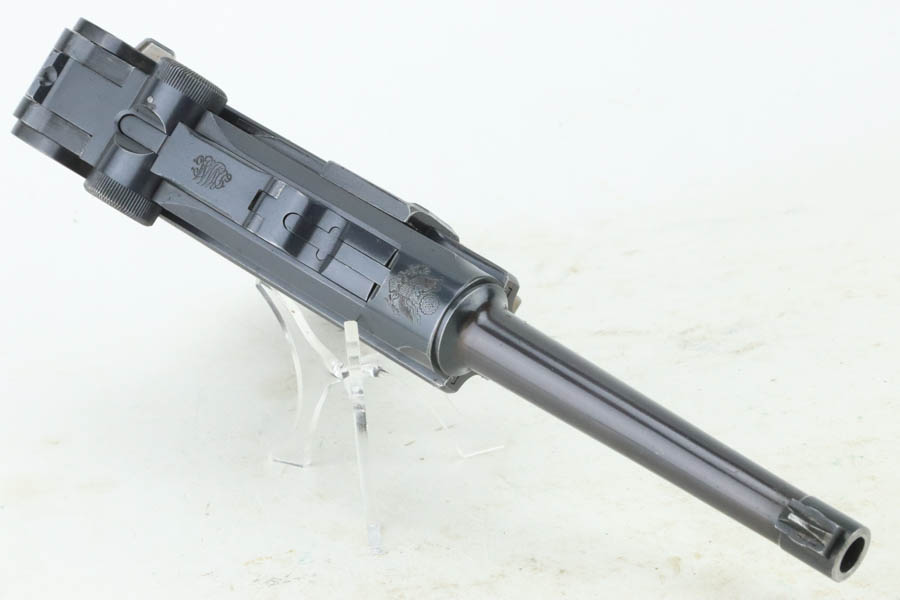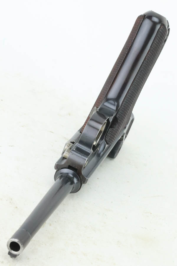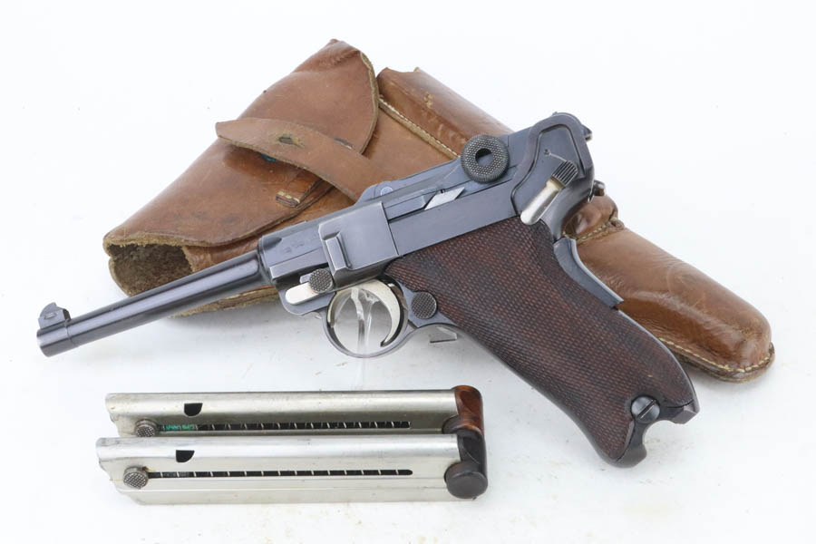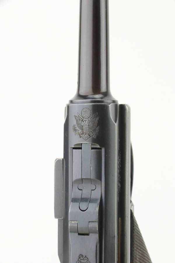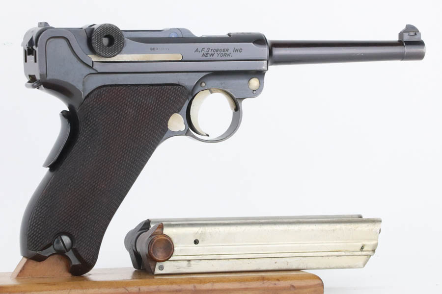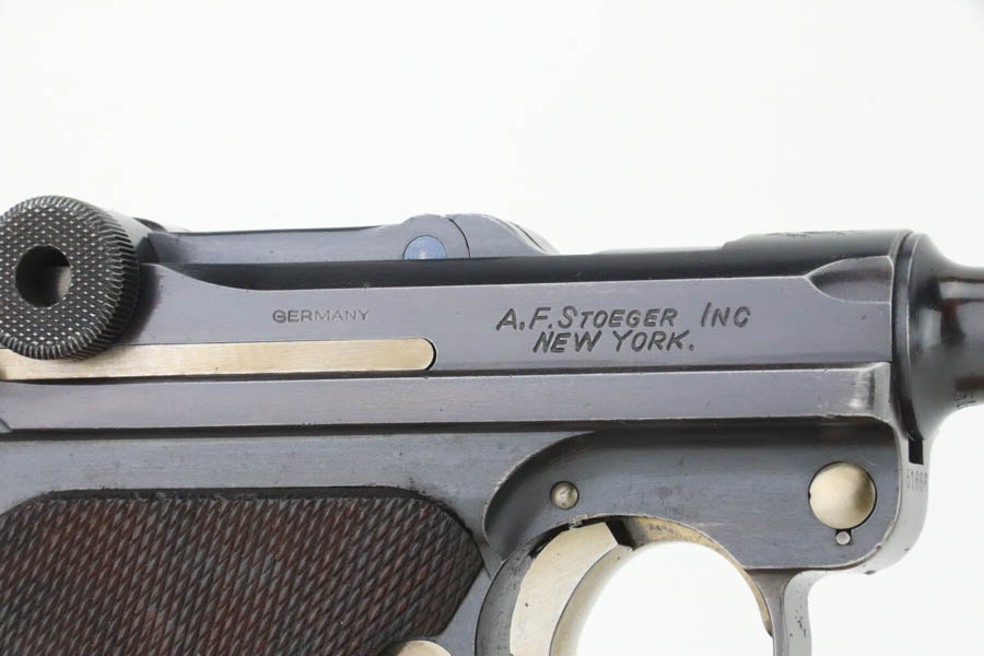 7/25/24 – This is a minty example of a rare A.F. Stoeger marked DWM Model 1906 Luger. These Luger pistols were manufactured for Stoeger Arms Corporation to be sold in the U.S. Several different barrel lengths were offered in either 9mm or 7.65mm, and the quantity acquired by Stoeger was rather low, making this Luger a scarce variation. This particular pistol is in .30 Luger with 4-inch barrel. This example is marked with the “American Eagle” stamp on the chamber and “DWM” on the toggle. It is all matching and has the proper “Crown BUG” proofs. The right side of the slide is GERMANY export marked. The right side of the slide is also marked A.F. STOEGER INC/NEW YORK. It is in beautiful condition, retaining nearly all of its finish. Fitted with minty wood grips. Very nice bore with good rifling. It comes as a rig with a period-correct commercial tan leather holster and two proper un-marked commercial magazines.