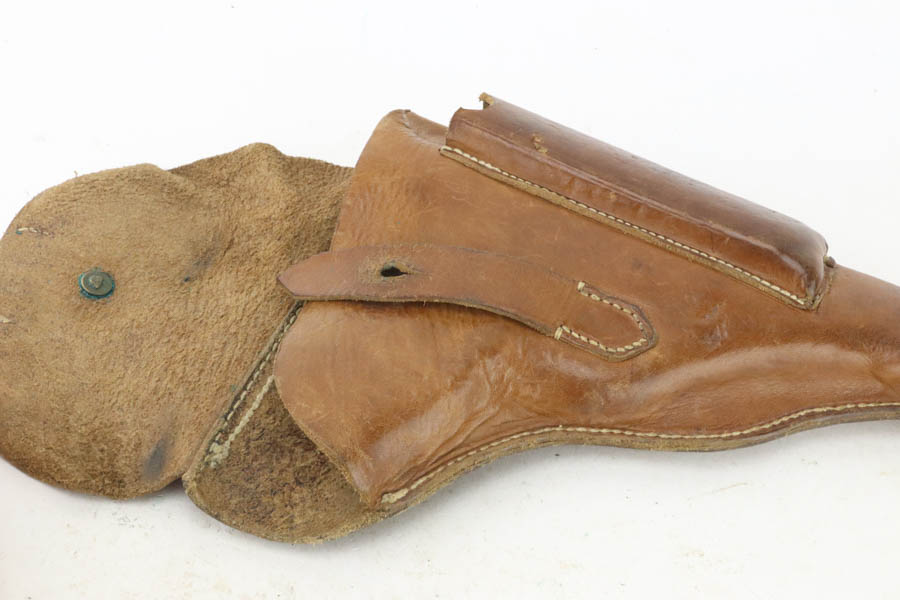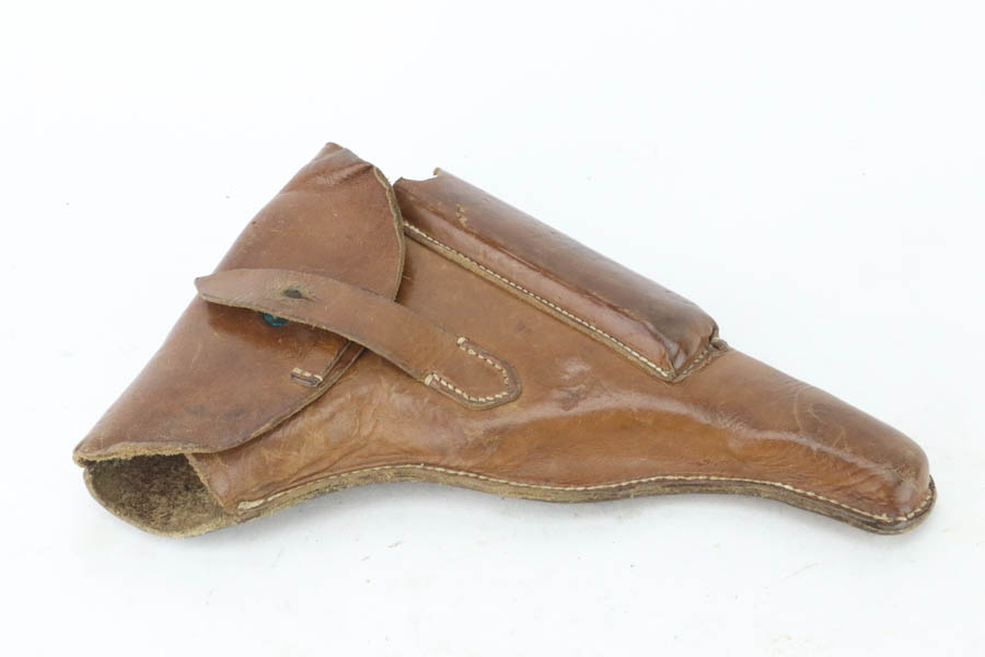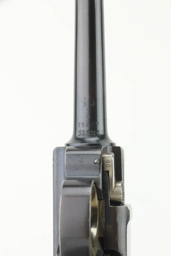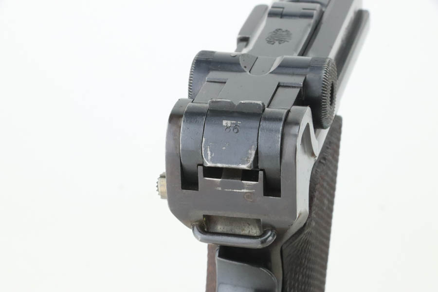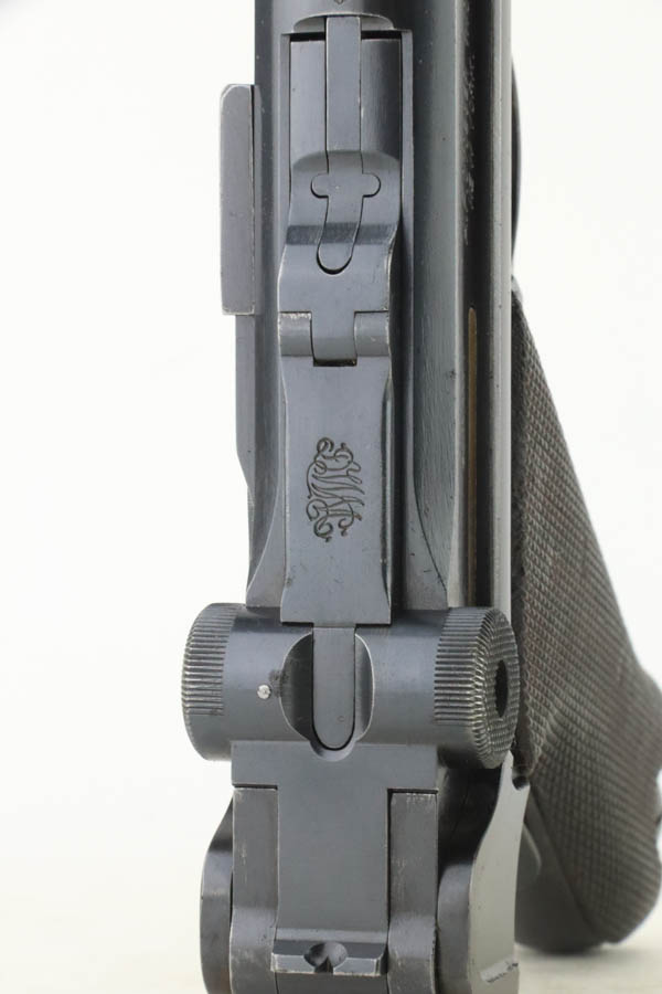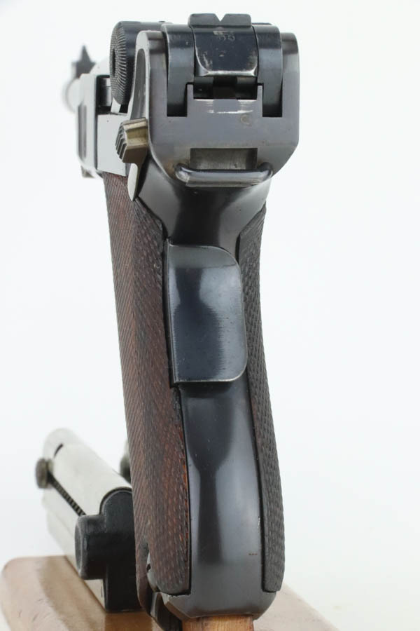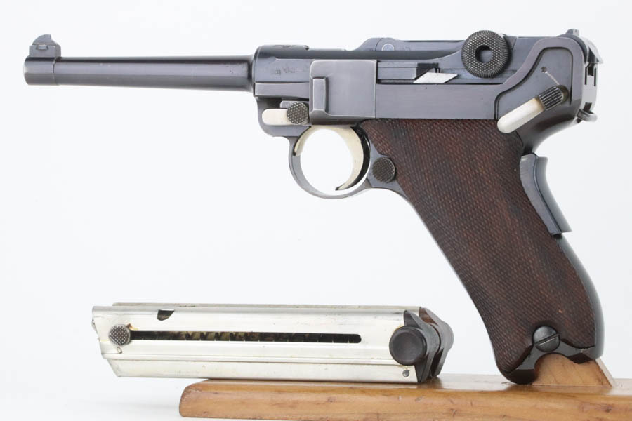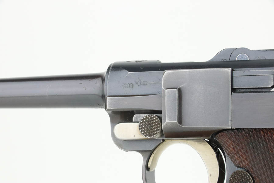 7/25/24 – This is a minty example of a rare A.F. Stoeger marked DWM Model 1906 Luger. These Luger pistols were manufactured for Stoeger Arms Corporation to be sold in the U.S. Several different barrel lengths were offered in either 9mm or 7.65mm, and the quantity acquired by Stoeger was rather low, making this Luger a scarce variation. This particular pistol is in .30 Luger with 4-inch barrel. This example is marked with the “American Eagle” stamp on the chamber and “DWM” on the toggle. It is all matching and has the proper “Crown BUG” proofs. The right side of the slide is GERMANY export marked. The right side of the slide is also marked A.F. STOEGER INC/NEW YORK. It is in beautiful condition, retaining nearly all of its finish. Fitted with minty wood grips. Very nice bore with good rifling. It comes as a rig with a period-correct commercial tan leather holster and two proper un-marked commercial magazines.