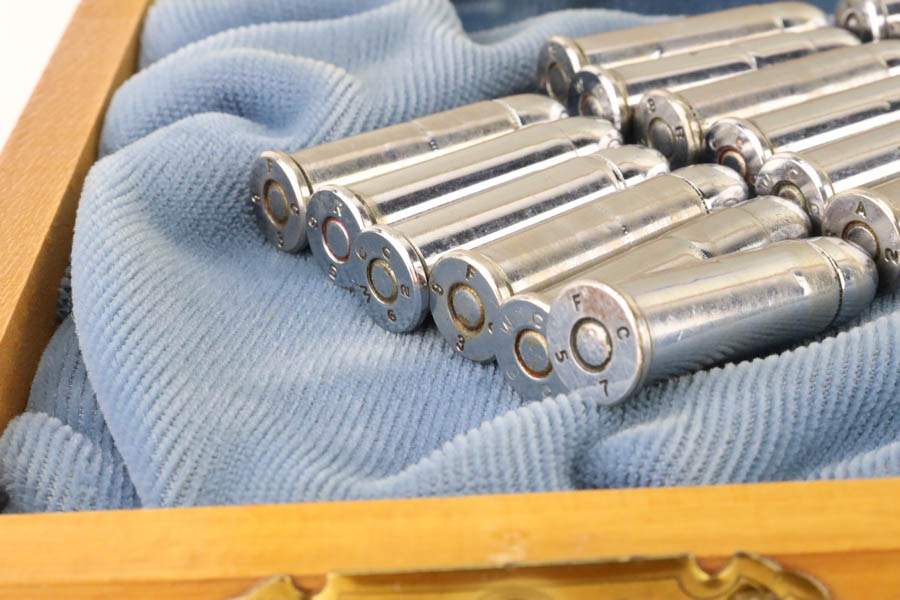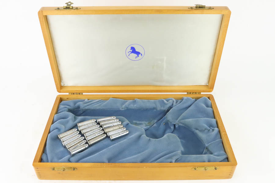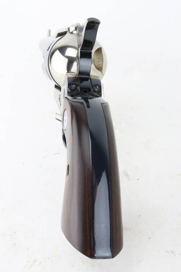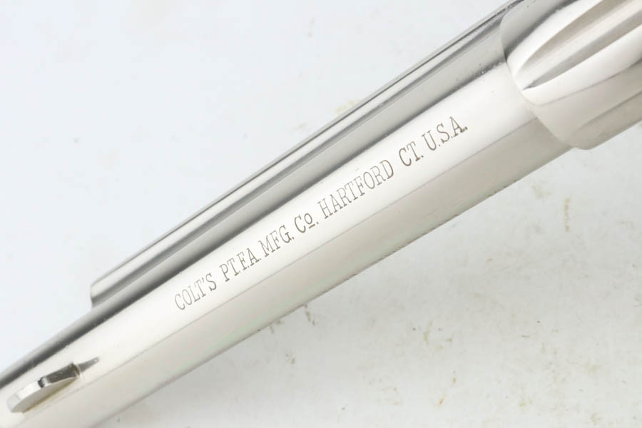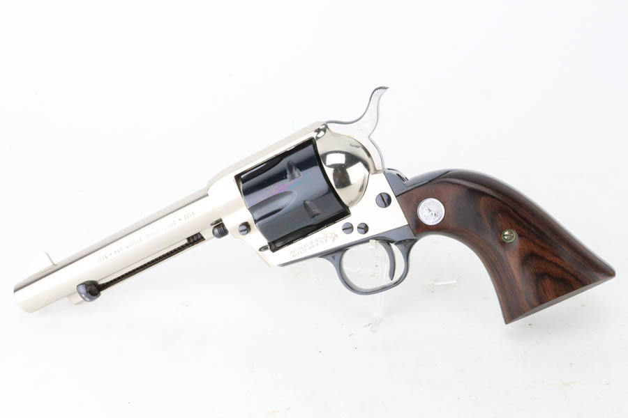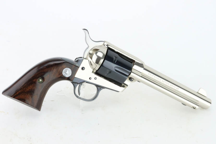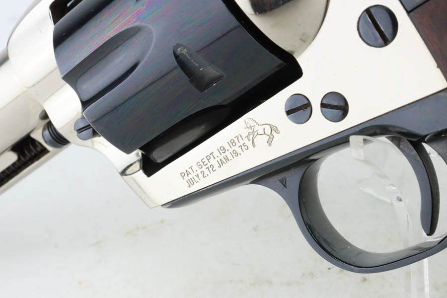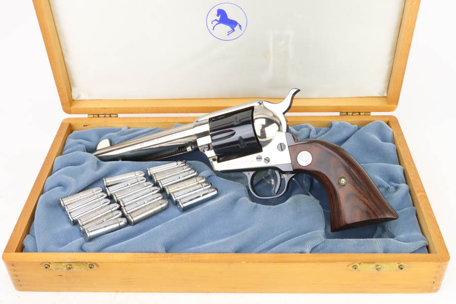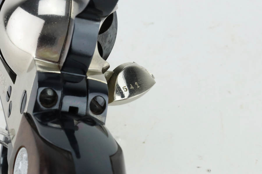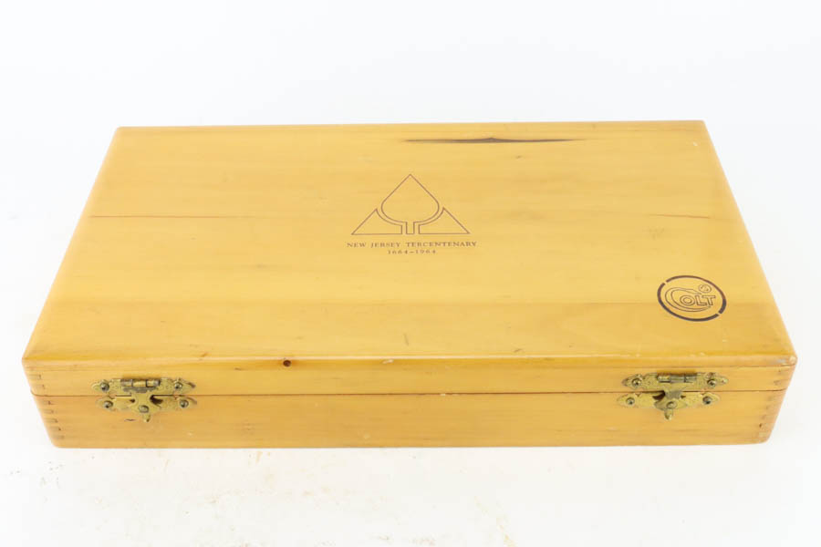 07/30/2024 – For sale is a Colt Single Action Army made in 1964 to commemorate the tricentennial anniversary of the founding of the state of New Jersey. The revolver revolver has an excellent polished nickel finish on the frame, hammer, and barrel with a deep polished bluing on the cylinder, cylinder rod, trigger guard, trigger, grip frame, and ejector rod. The wood grips have a colt medallion and are in great condition with no wear. The cylinder has a very minimal ring from the cylinder stop. The bore is very bright and like new. The revolver comes in a wood case commemorating the tercentenary. It also comes with 18 rounds of .45 Long Colt in a silver finish.