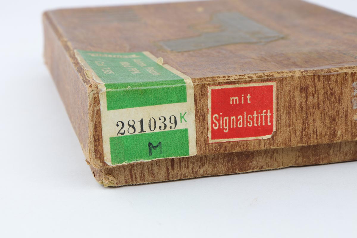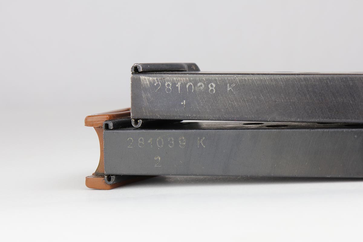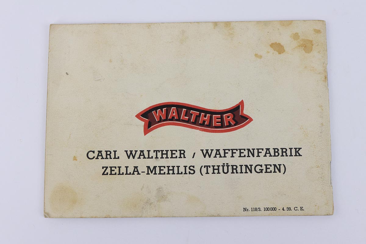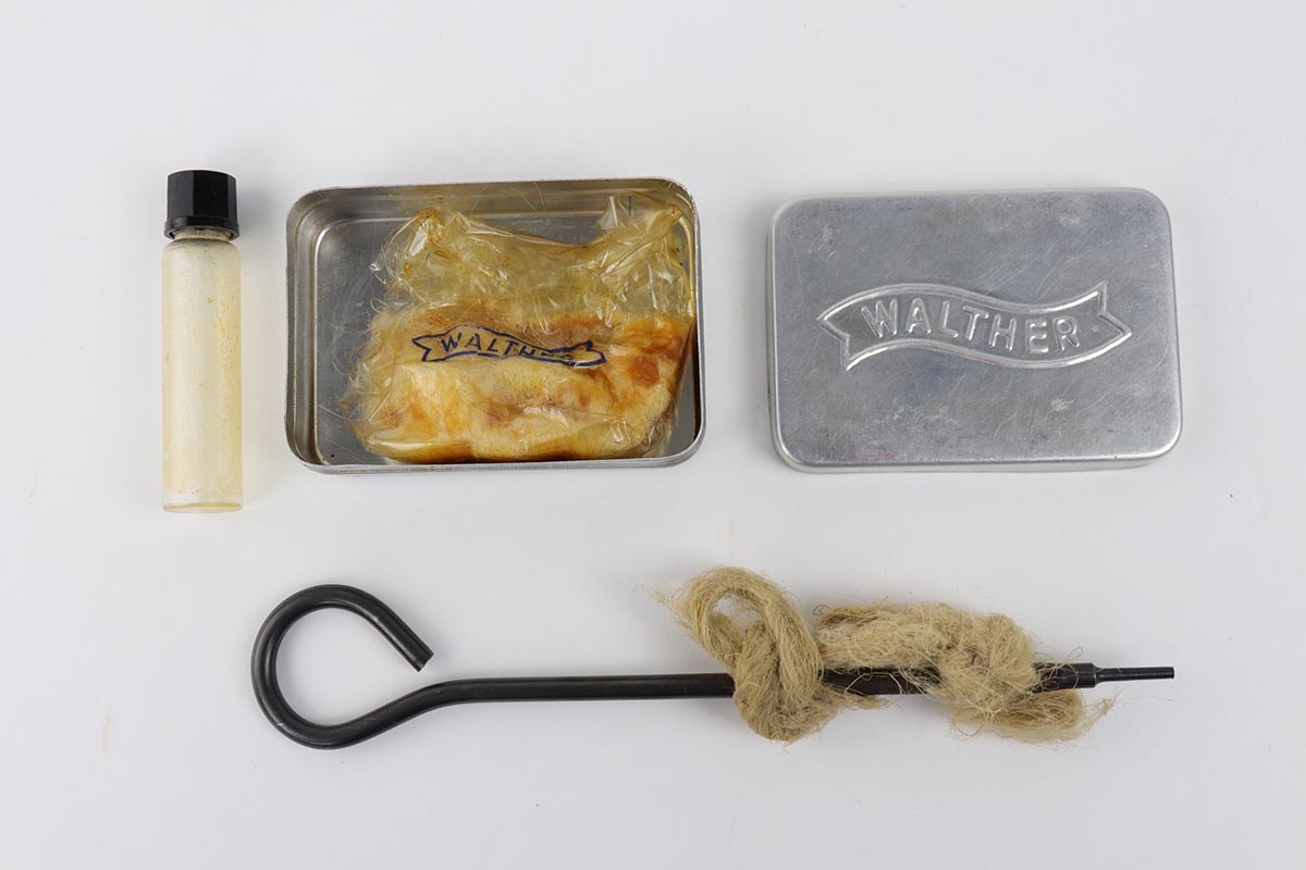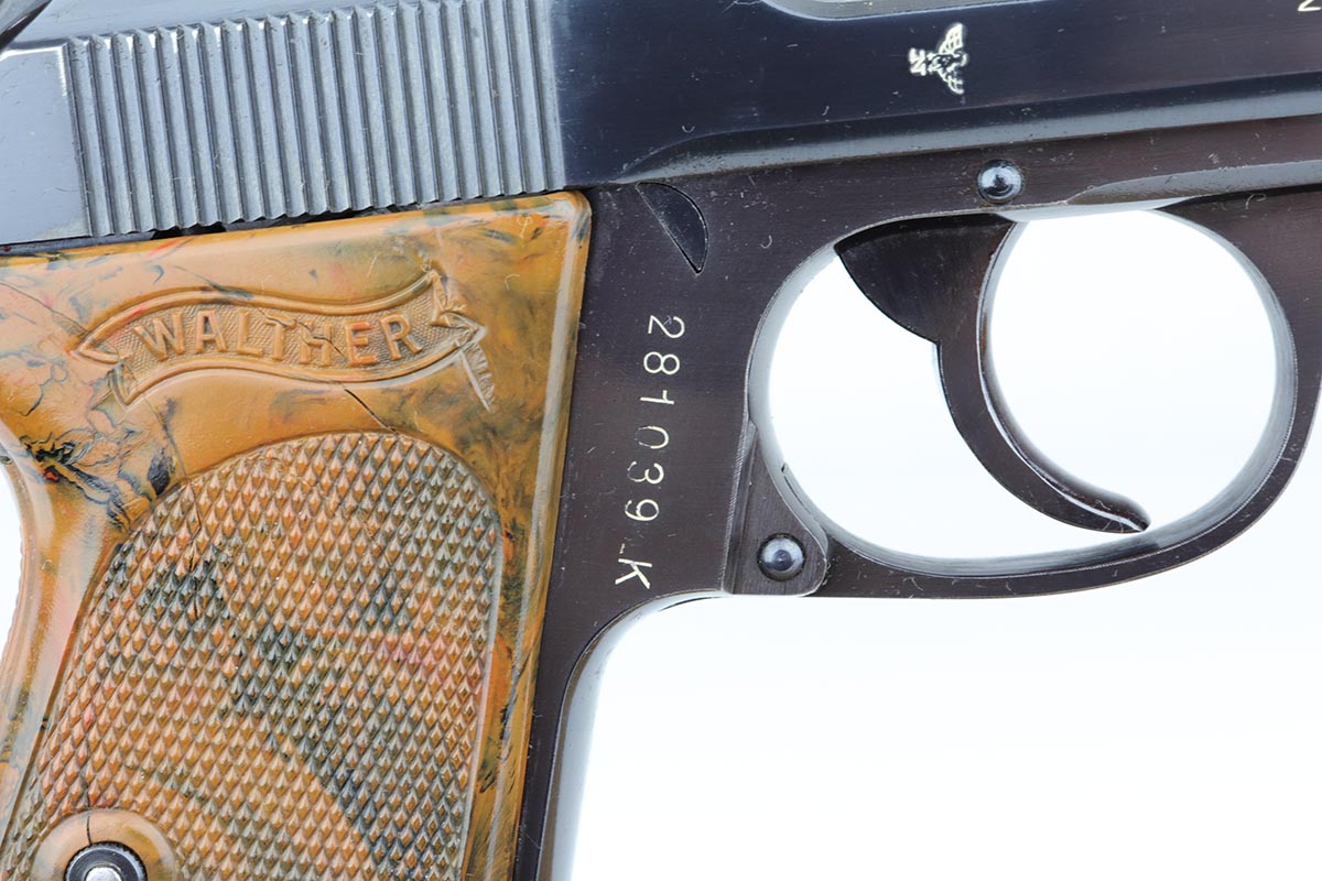5/30/19 – Listed here is an exceptional find, and the first we’ve offered in some time. It is a 4th variation SS-issued Walther PPK in its original matching box, with one of the original matching magazines, and a second that is only one digit off! The box also includes the original cleaning rod, horse hair, spare magazine, manual and cleaning tin. The pistol is in near-mint condition with just tiny hints of box wear on the edges. Terrific bore and finger extension magazine, though the grip does show a couple small cracks. Gun is in the proper SS contract serial range for the numbered slide (280xxxk-281xxxk). Manual is dated to April of 1939. All other extras are in excellent condition.