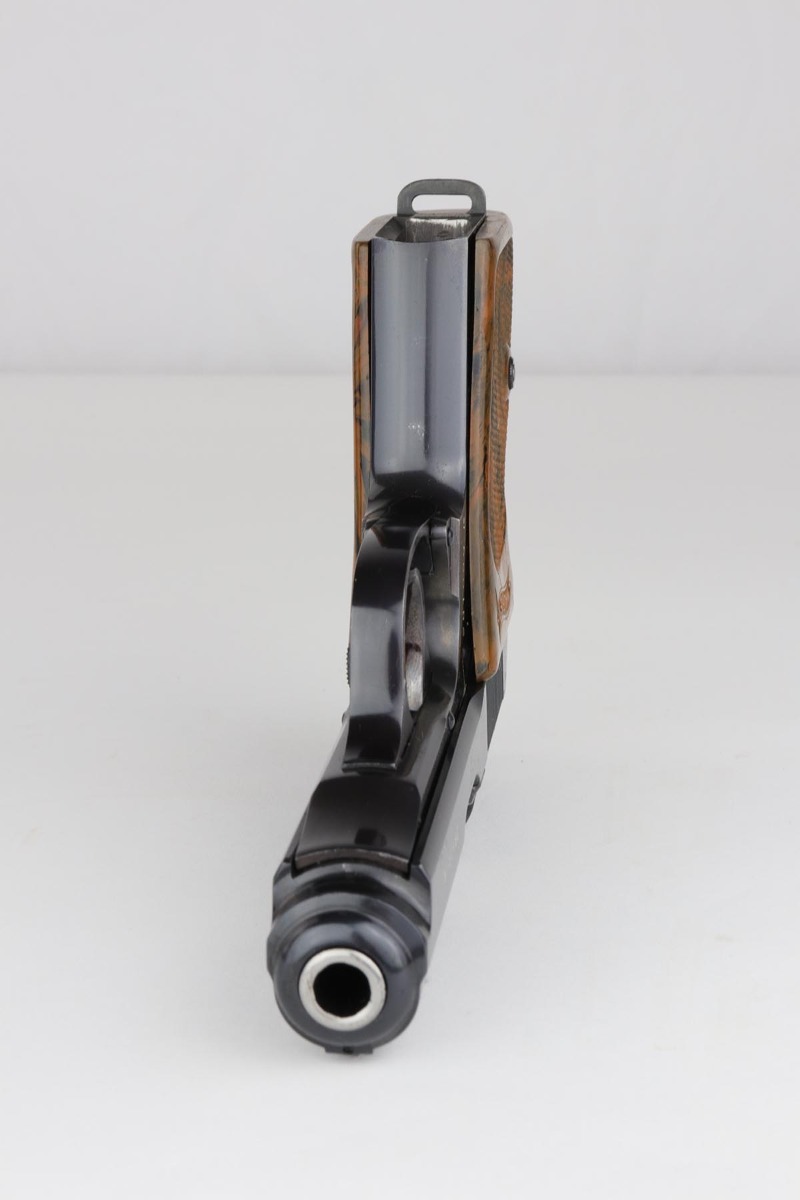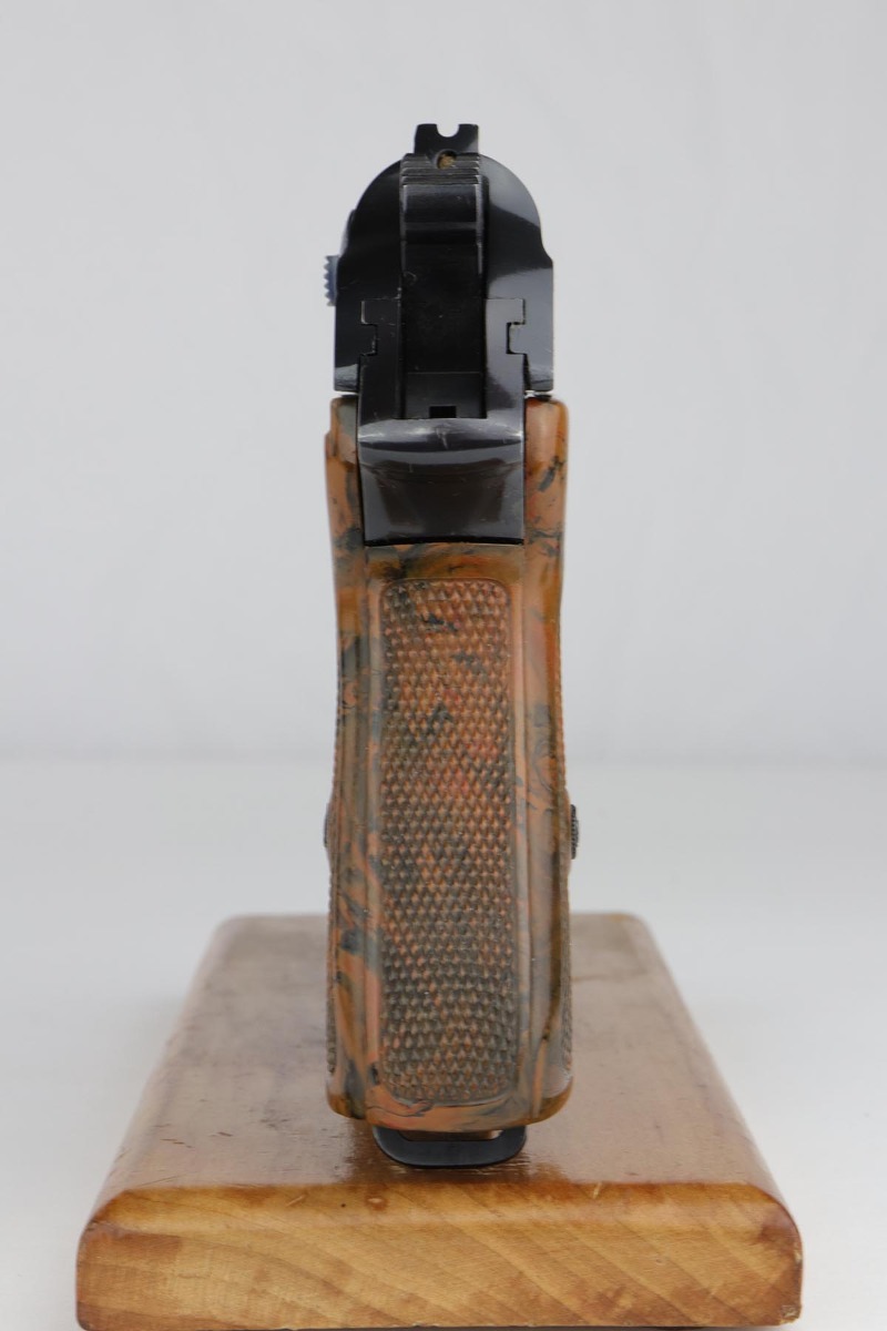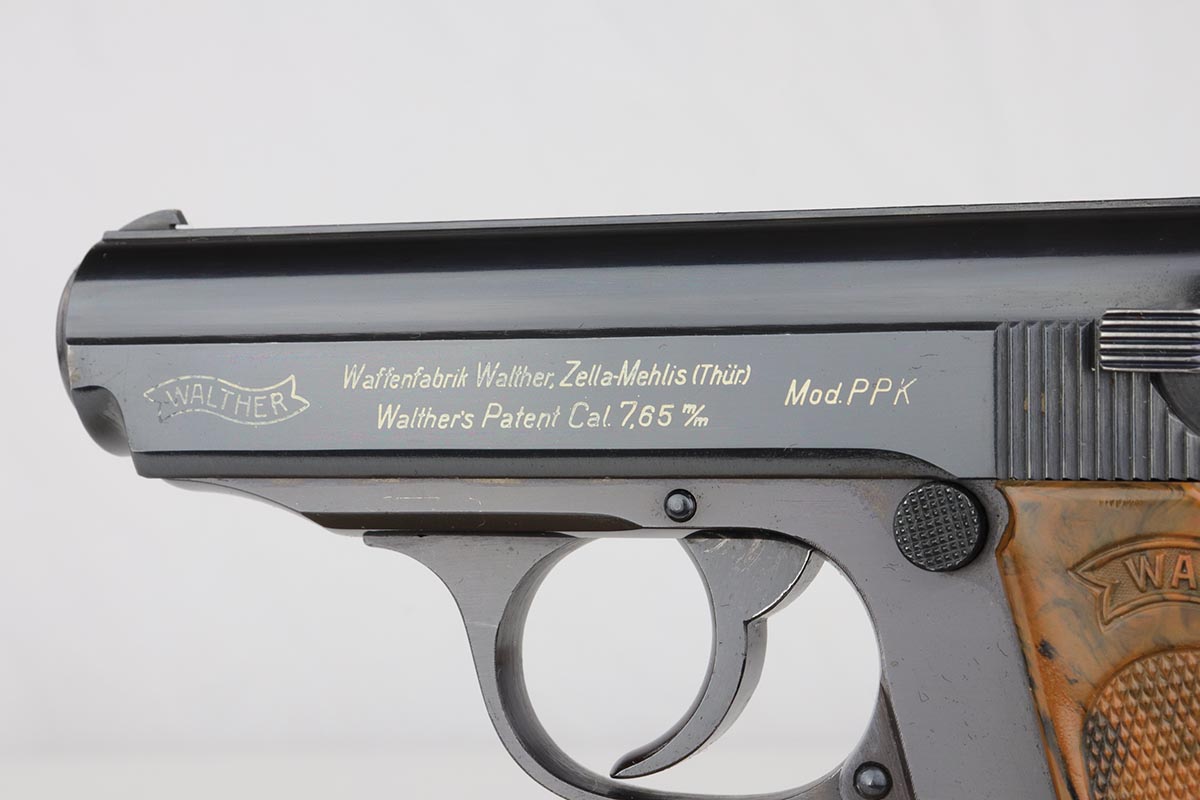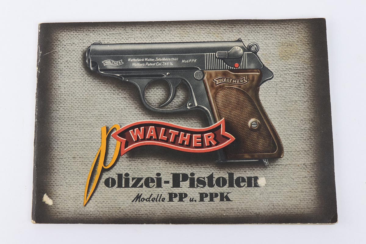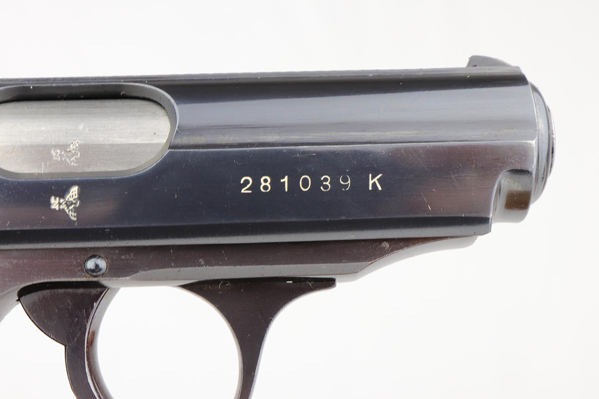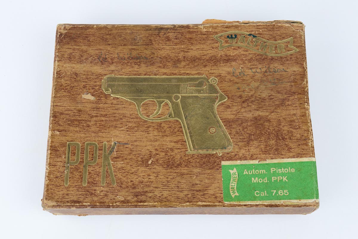 5/30/19 – Listed here is an exceptional find, and the first we’ve offered in some time. It is a 4th variation SS-issued Walther PPK in its original matching box, with one of the original matching magazines, and a second that is only one digit off! The box also includes the original cleaning rod, horse hair, spare magazine, manual and cleaning tin. The pistol is in near-mint condition with just tiny hints of box wear on the edges. Terrific bore and finger extension magazine, though the grip does show a couple small cracks. Gun is in the proper SS contract serial range for the numbered slide (280xxxk-281xxxk). Manual is dated to April of 1939. All other extras are in excellent condition.
