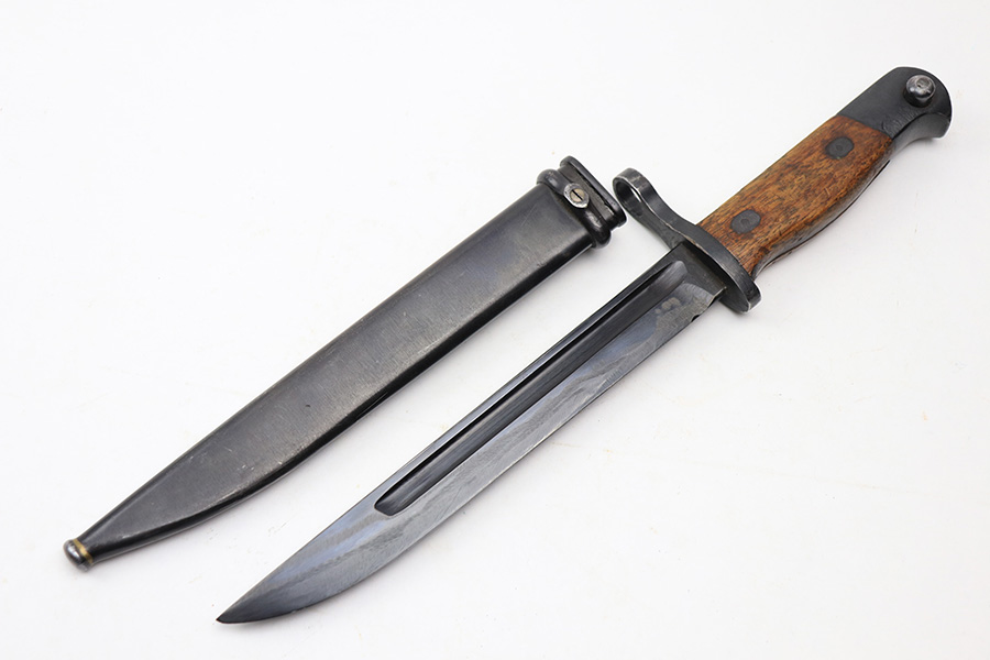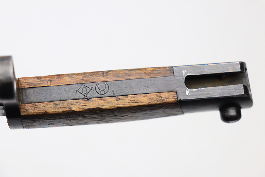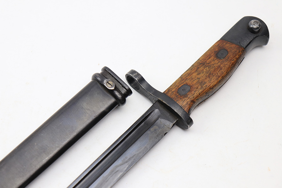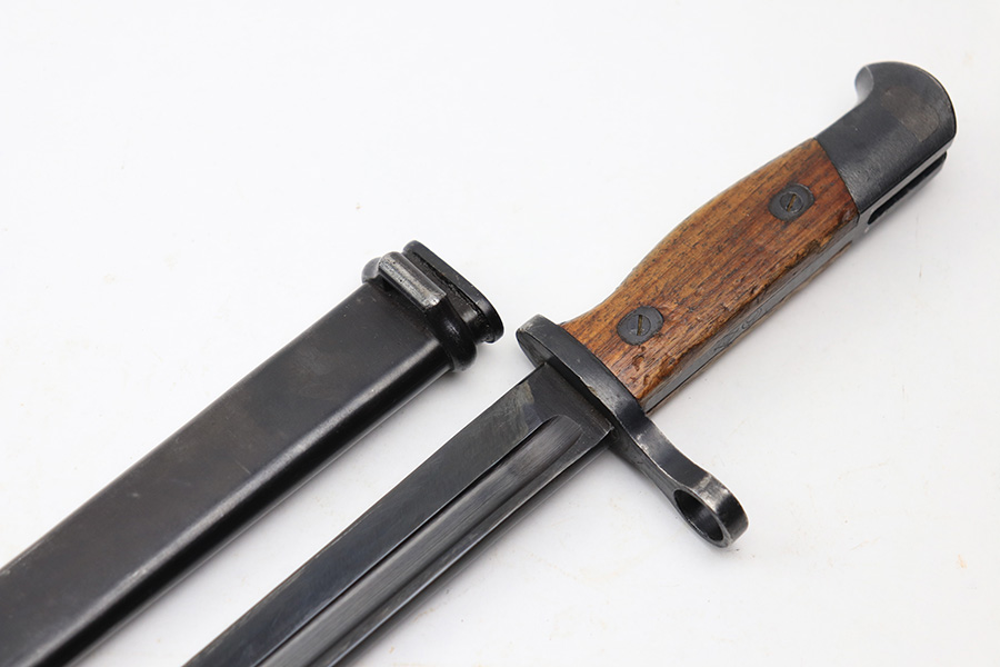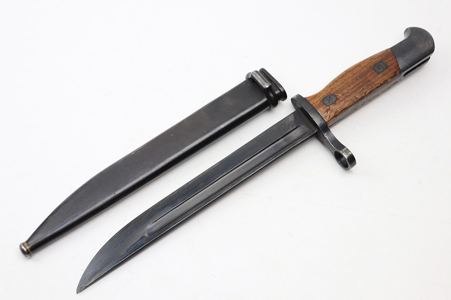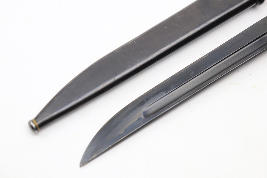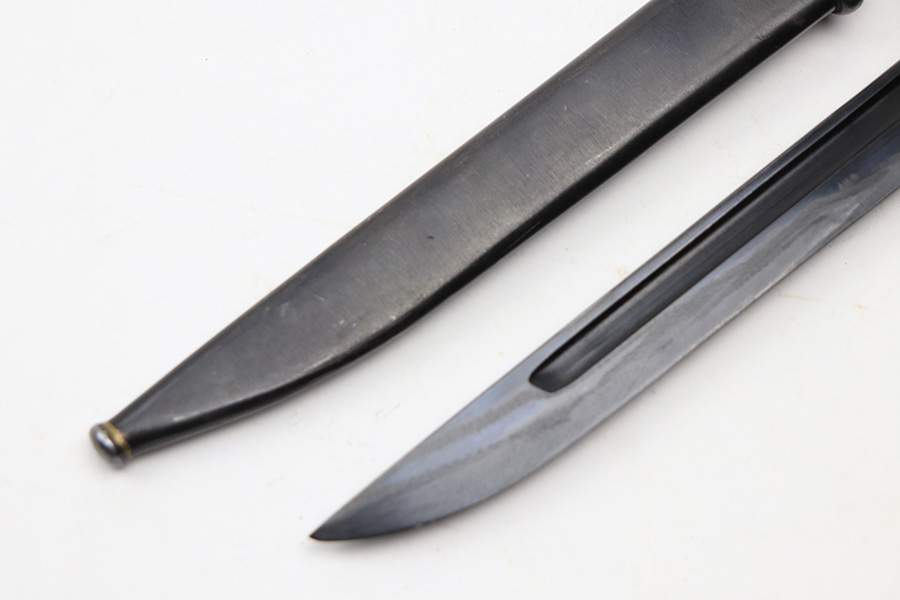 3/3/22 – This is an original, rare variation WW2 Japanese paratrooper bayonet with the original scabbard. The bayonet is in excellent condition with the original finish in tact throughout the blade, hilt, and sheath. The spine of the hilt is maker stamped by Nagoya Arsenal. Serial numbered 2647 on the pommel. No markings on the blade, though it does show light signs of sharpening. No cracks or chips in the wood handle, and no dents in the scabbard. These were issued with the Type 100 Submachine Gun, and various Paratrooper rifles.