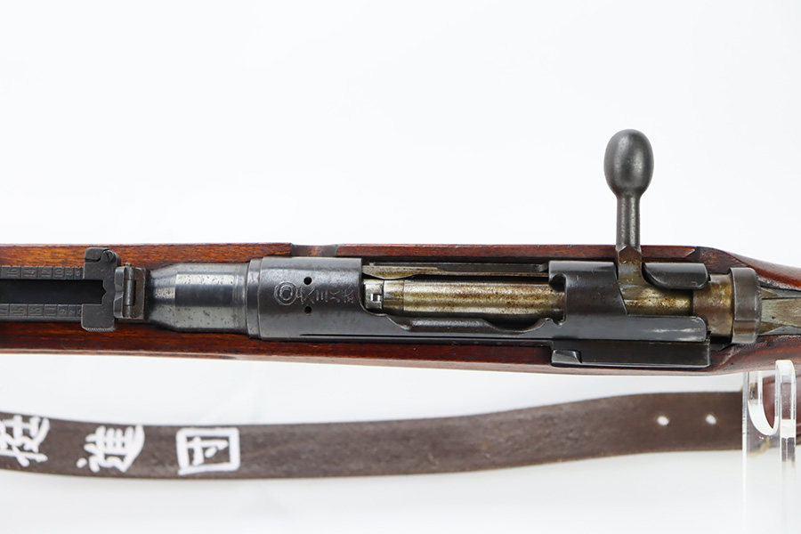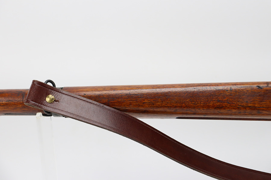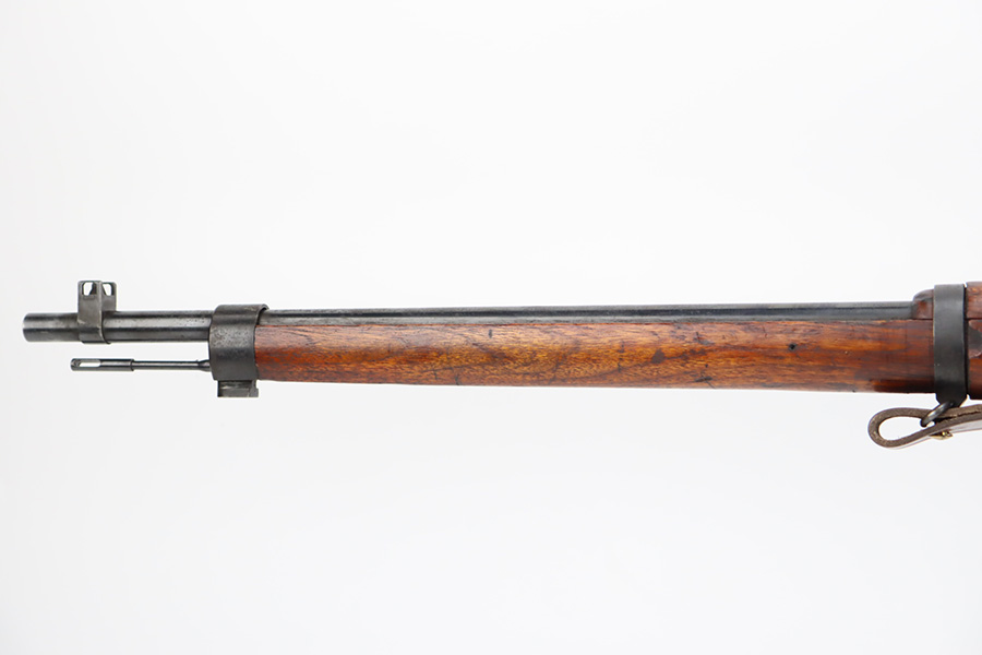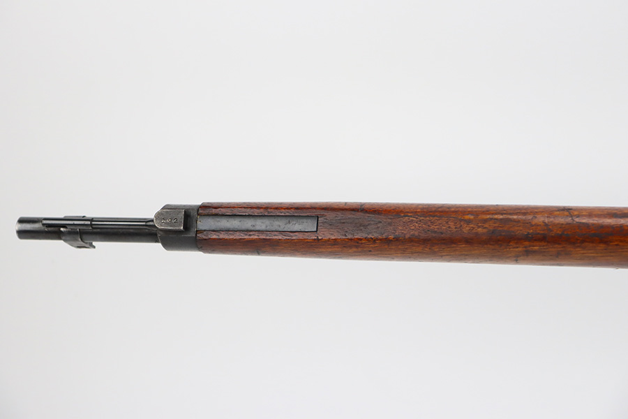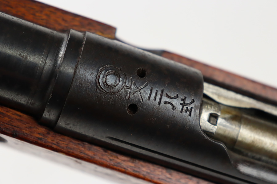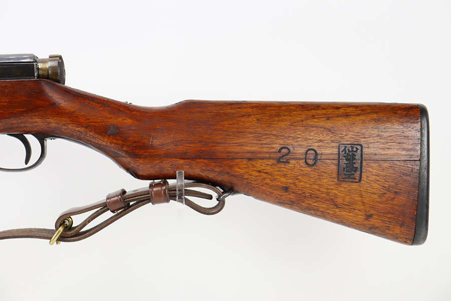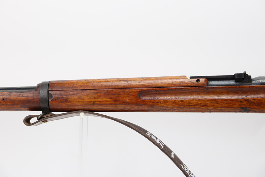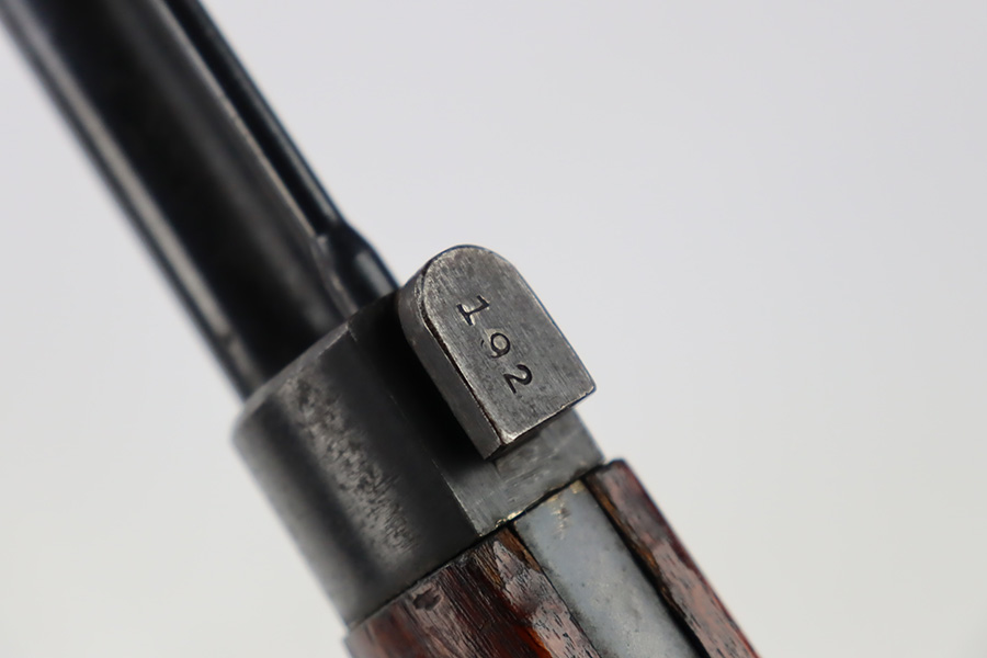 10/10/23 – This is an excellent example of a a rare Arisaka Type 38 rifle that has a concentric circle crest on the receiver in place of the Imperial mum stamp. This indicates issue to a Non-military Institution of the Japanese Government. Organizations that this rifle was issued to could have been the Police or Prison Guards or some possibly the Railroads. This one is mismatched, but has retained nearly all of its bluing. While there is next-to-no bluing loss on the metal parts, there is light spotty oxidation throughout. There is no major damage to the stock, but it shows a normal degree of wear-and-tear. There is what appears to be a rack or unit number on the left side of the butt stock. Comes with a cleaning rod and repro sling. Mint bore.