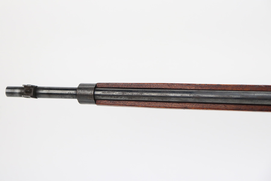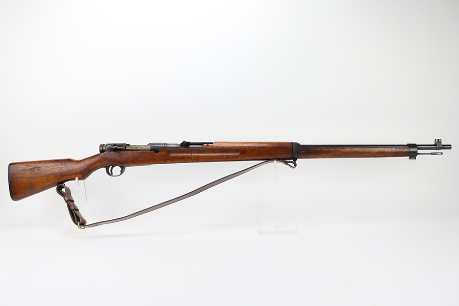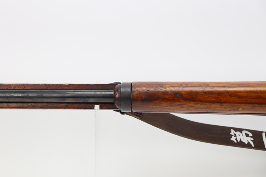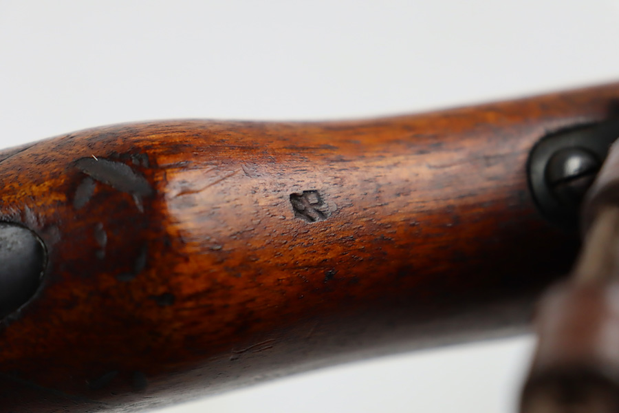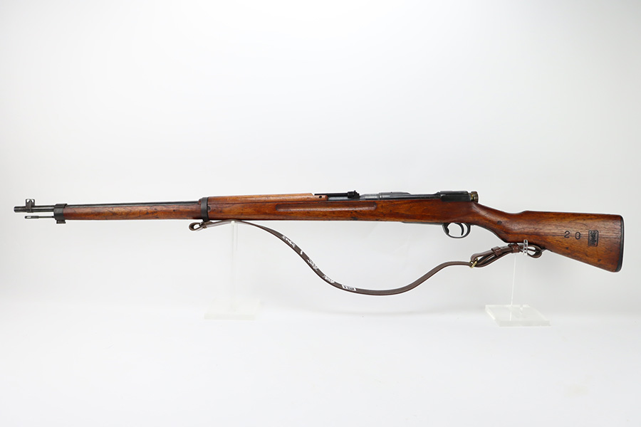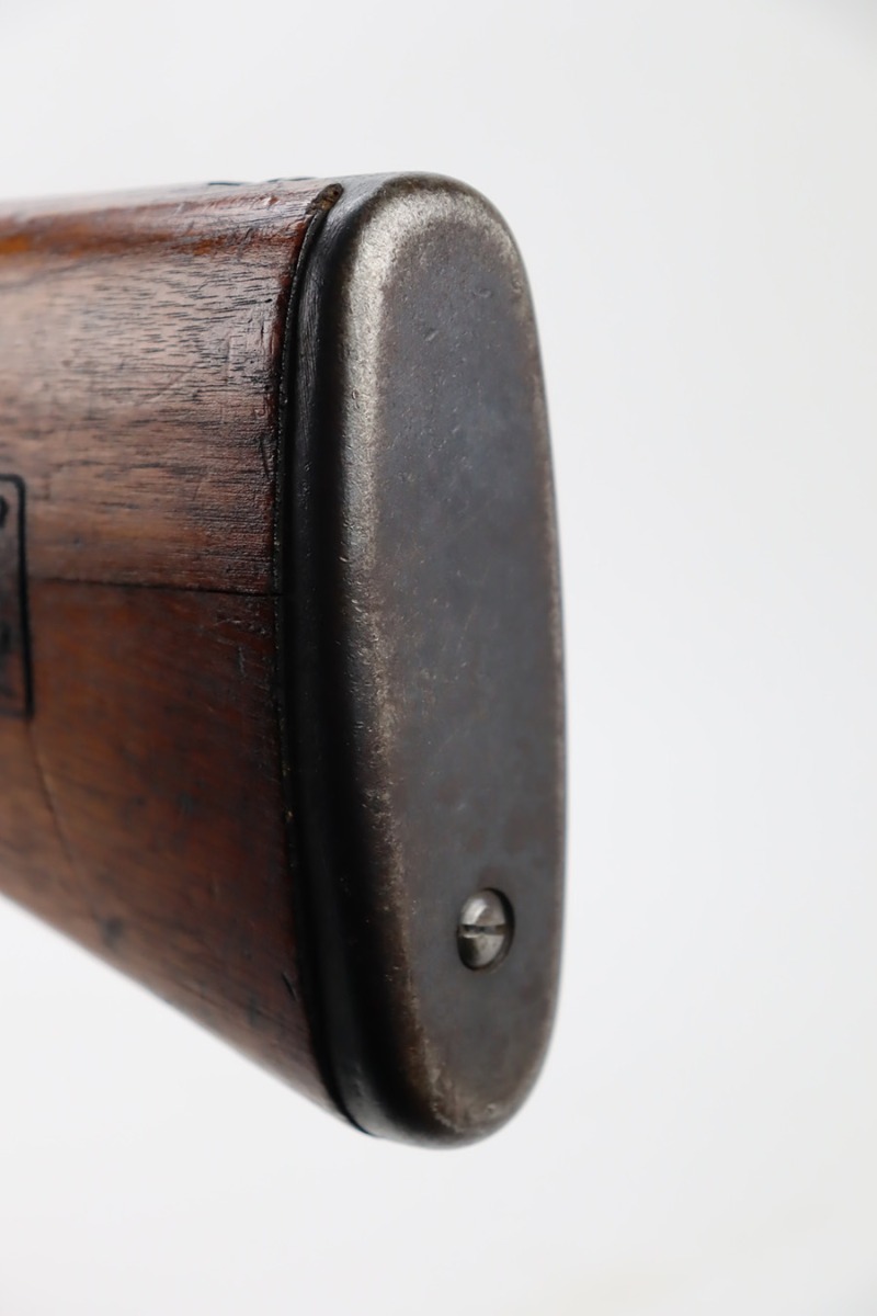 10/10/23 – This is an excellent example of a a rare Arisaka Type 38 rifle that has a concentric circle crest on the receiver in place of the Imperial mum stamp. This indicates issue to a Non-military Institution of the Japanese Government. Organizations that this rifle was issued to could have been the Police or Prison Guards or some possibly the Railroads. This one is mismatched, but has retained nearly all of its bluing. While there is next-to-no bluing loss on the metal parts, there is light spotty oxidation throughout. There is no major damage to the stock, but it shows a normal degree of wear-and-tear. There is what appears to be a rack or unit number on the left side of the butt stock. Comes with a cleaning rod and repro sling. Mint bore.