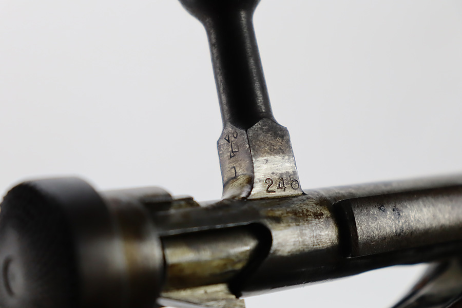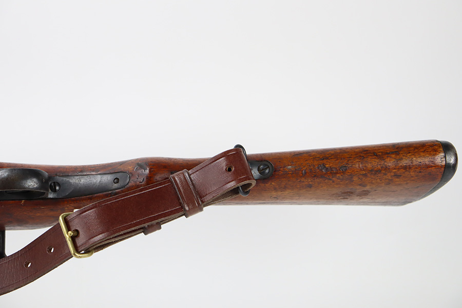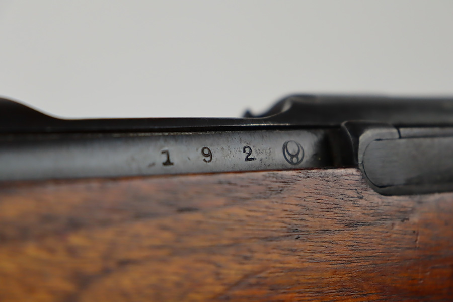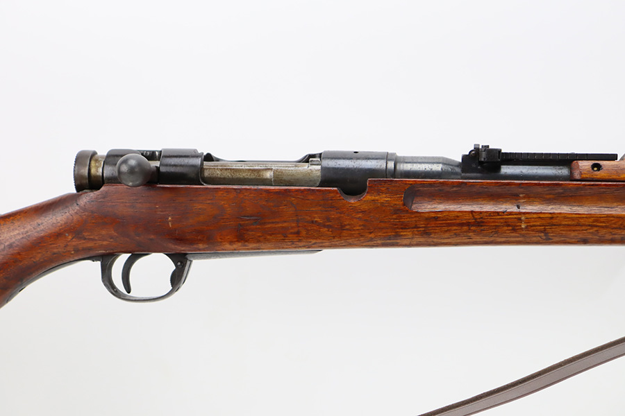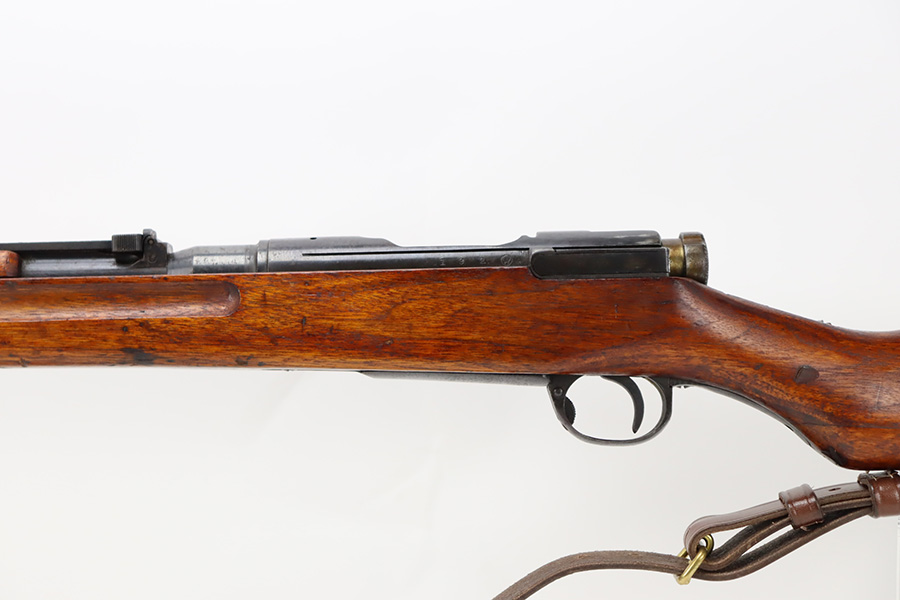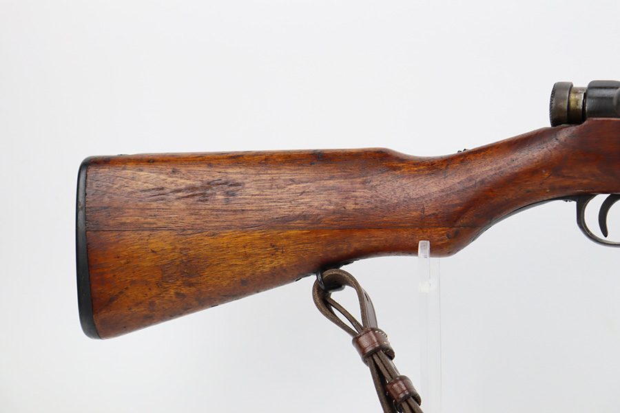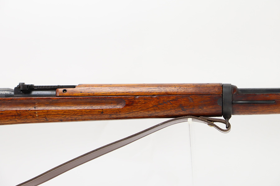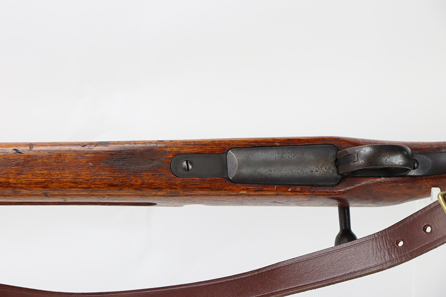 10/10/23 – This is an excellent example of a a rare Arisaka Type 38 rifle that has a concentric circle crest on the receiver in place of the Imperial mum stamp. This indicates issue to a Non-military Institution of the Japanese Government. Organizations that this rifle was issued to could have been the Police or Prison Guards or some possibly the Railroads. This one is mismatched, but has retained nearly all of its bluing. While there is next-to-no bluing loss on the metal parts, there is light spotty oxidation throughout. There is no major damage to the stock, but it shows a normal degree of wear-and-tear. There is what appears to be a rack or unit number on the left side of the butt stock. Comes with a cleaning rod and repro sling. Mint bore.