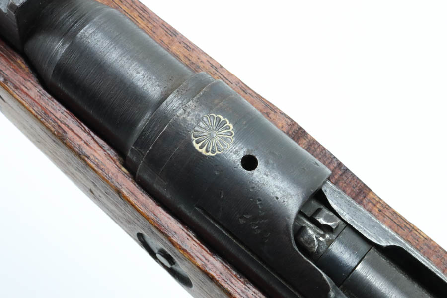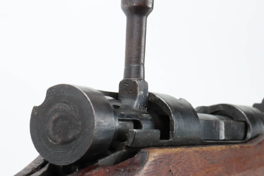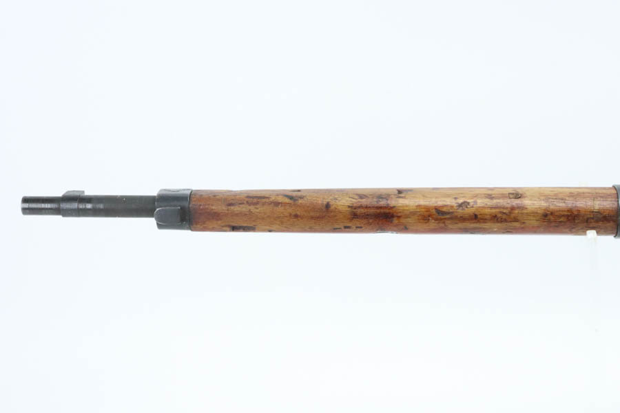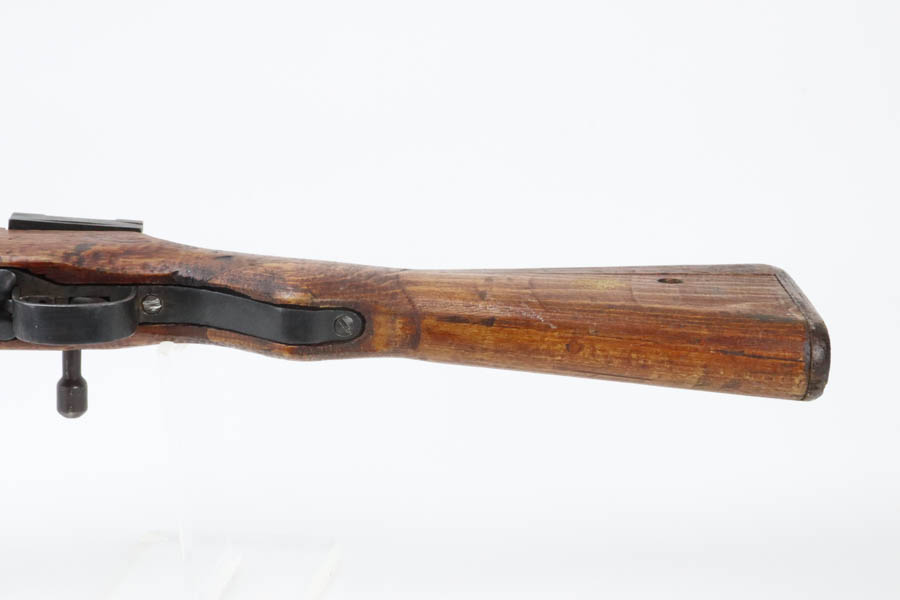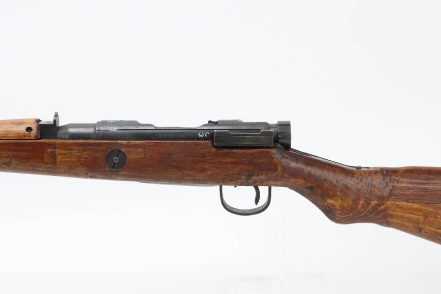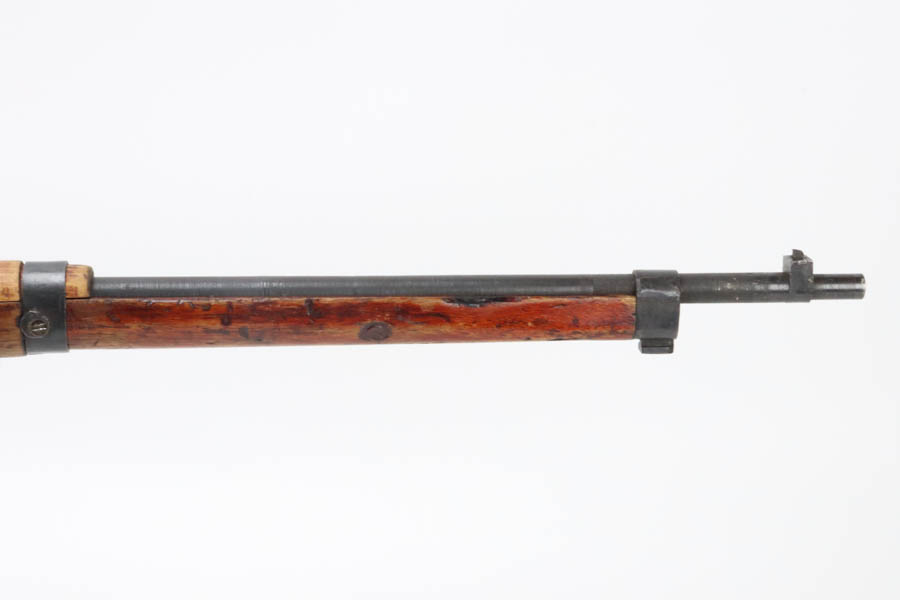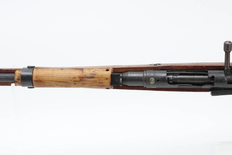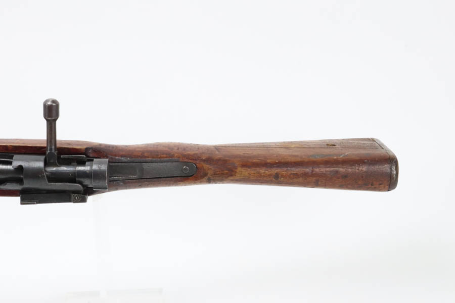 06/25/2024 – For sale is a very late “Last Ditch” Type 99 Arisaka that was likely a factory incomplete model. Many very late Type 99’s made by Tokyo Juki Kogyo have been documented as incomplete rifles put together. Many were missing parts or not finished. This example Is in great condition with the metal parts retaining much of their bluing. There are specks of oxidation throughout. The stock features a rope hole for a rope sling instead of traditional leather slings. There is no front sling swivel. The stock is correct as it is a 3 piece stock being held together by the barrel bands. The bore is fairly bright but it is darkening. There is no serial number stamped on the receiver. The bolt release lever is loose and does not hold the bolt in place. Examples of these rifles were found without bolts and this rifle has a bolt mismatch. The stock is properly proofed for TJK.