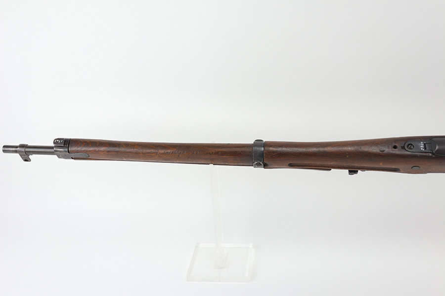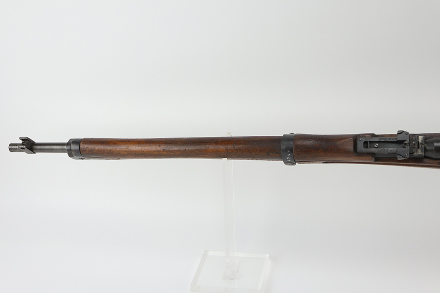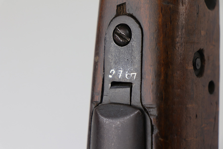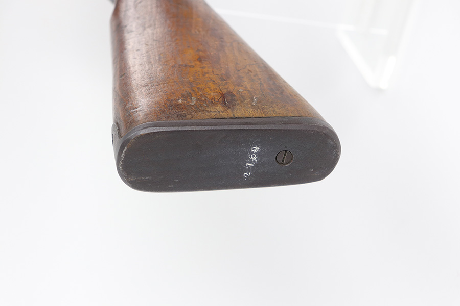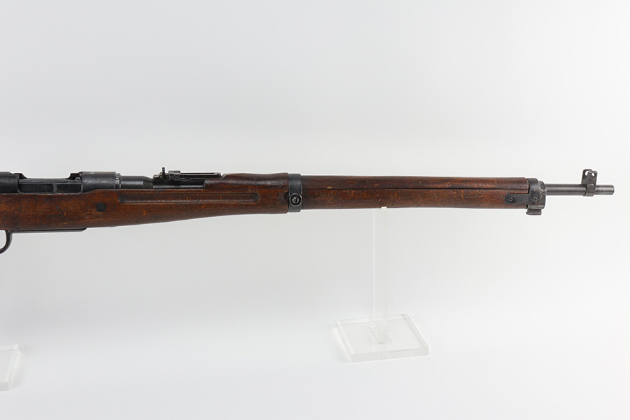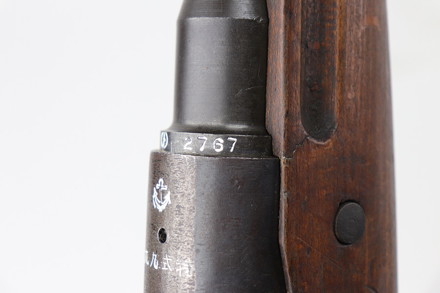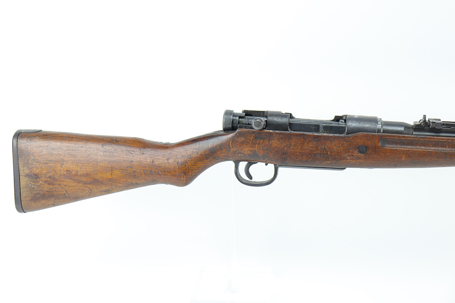 10/25/21 – This is a rare Japanese Arisaka Type 99 Special Navy rifle from World War II. There were only about 14,000 of these manufactured at Yokosuka Naval Arsenal, and they feature a cast iron receiver and small parts (only barrel and bolt are steel). It is numbered with an assembly number, and is matching throughout (receiver, barrel, bayo lug, barrel band, buttplate and trigger group). These are crudely designed and finished rifles, and this one shows some thinning/patina on the metal parts. Bore is excellent and shiny though. Stock has some dings and handling wear, and a small chip on left side along the barrel.