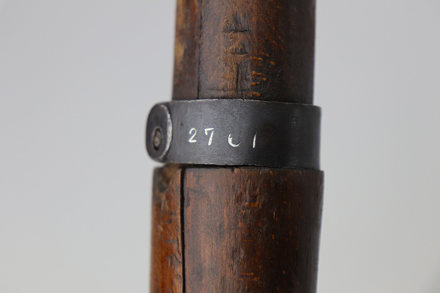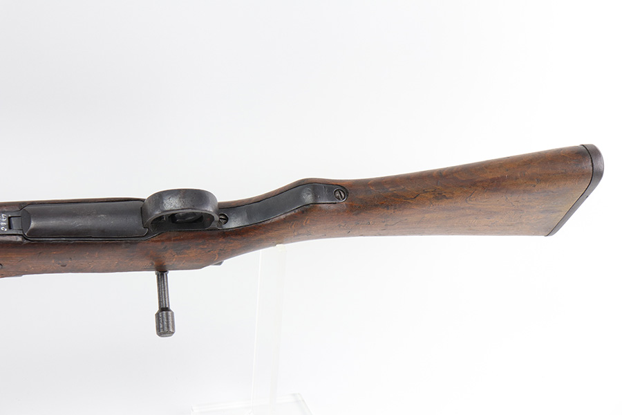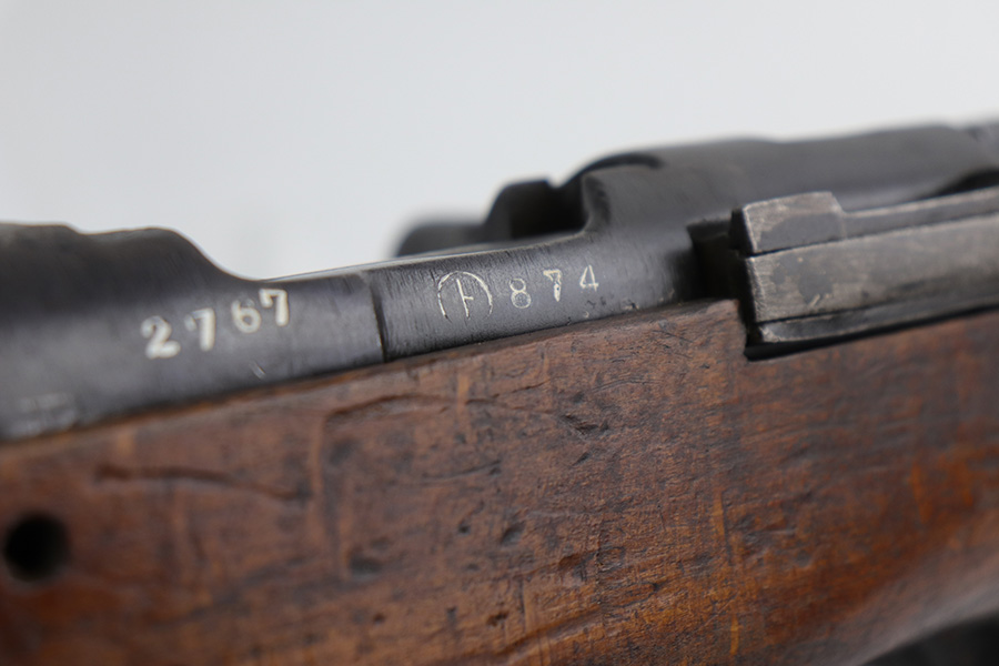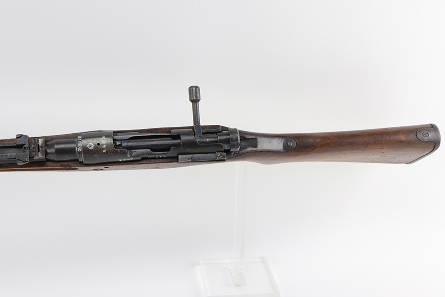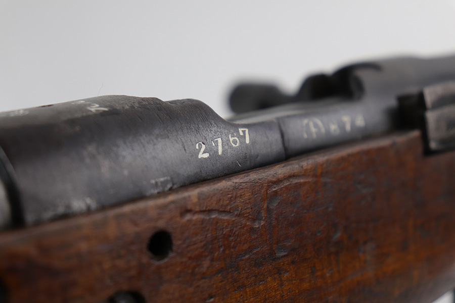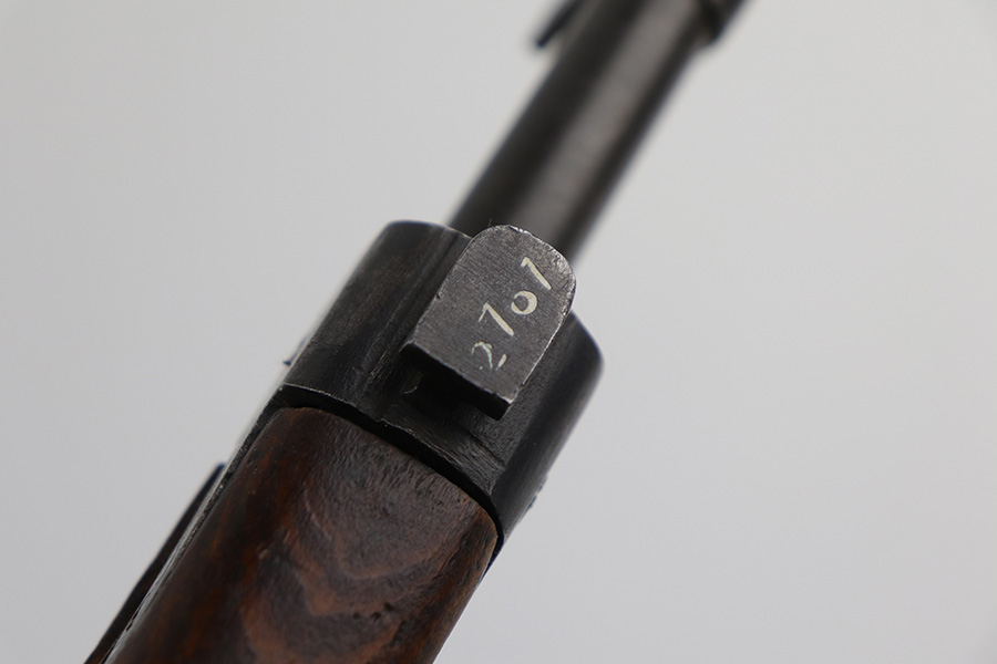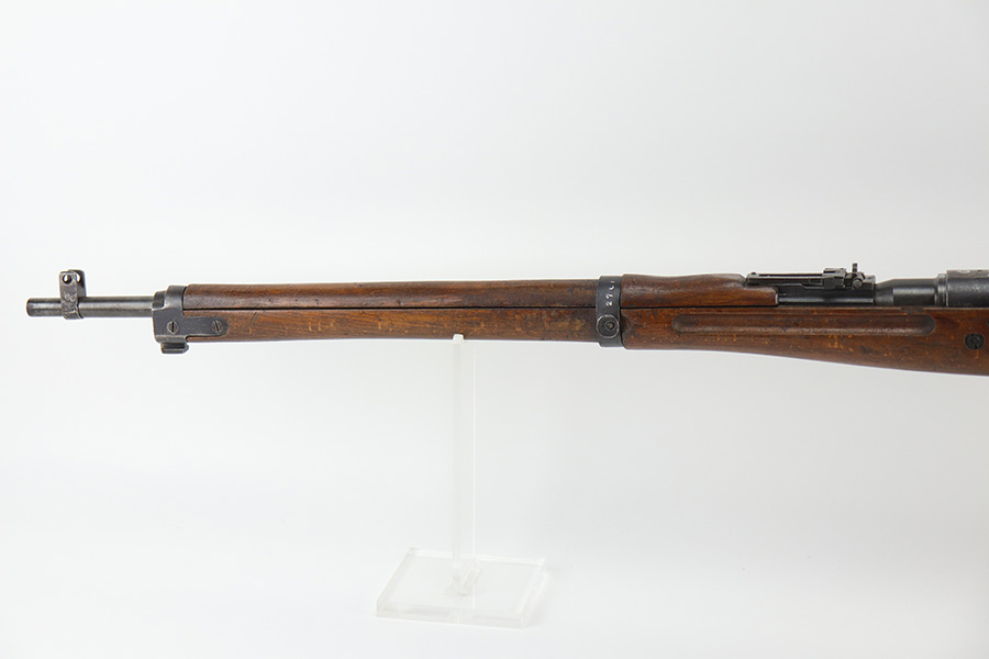 10/25/21 – This is a rare Japanese Arisaka Type 99 Special Navy rifle from World War II. There were only about 14,000 of these manufactured at Yokosuka Naval Arsenal, and they feature a cast iron receiver and small parts (only barrel and bolt are steel). It is numbered with an assembly number, and is matching throughout (receiver, barrel, bayo lug, barrel band, buttplate and trigger group). These are crudely designed and finished rifles, and this one shows some thinning/patina on the metal parts. Bore is excellent and shiny though. Stock has some dings and handling wear, and a small chip on left side along the barrel.
