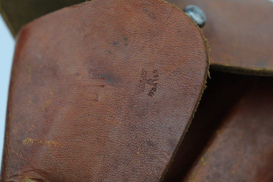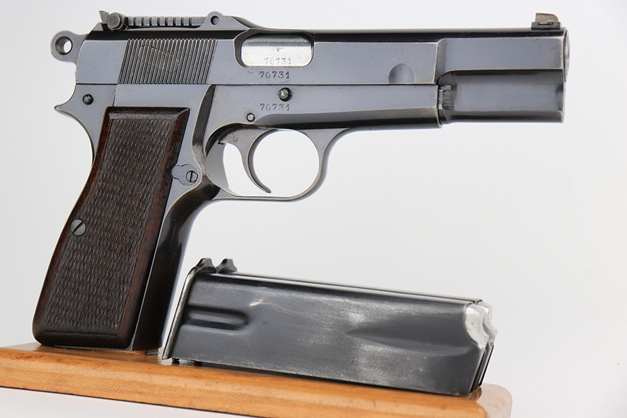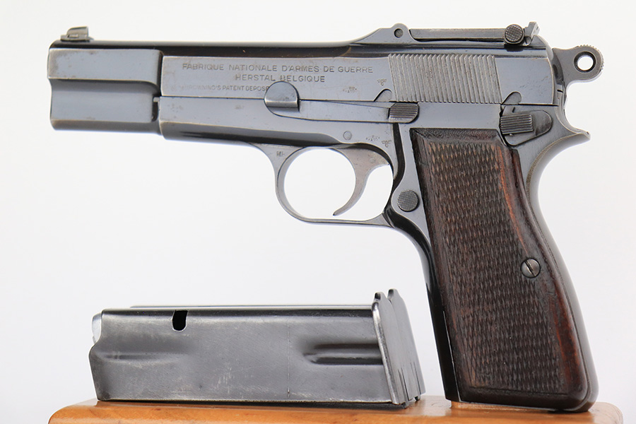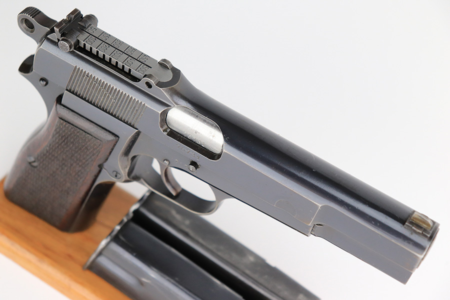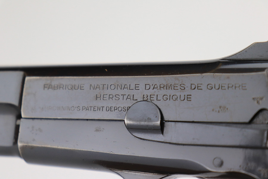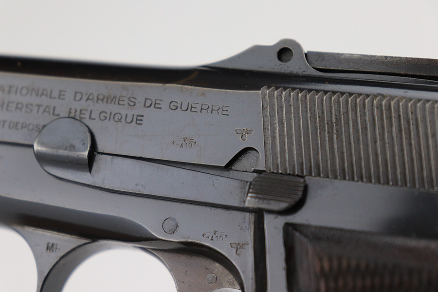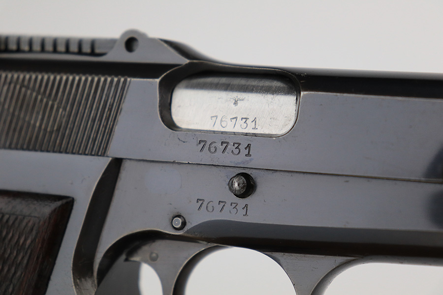 5/25/23 – This is a scarce and desirable FN Browning High Power rig with WaA103 acceptance proofs and tangent rear sight. All matching and original with 95+% of the blue remaining, there isn’t much finish loss on this pistol in general but there is some patina on the straps and some pitting along the left side of the pistol, especially on the muzzle. Terrific bore. Excellent grips with minor handling wear but no cracks. The rig has two magazines, both of which are also WaA103 proofed. It’s completed by a very nice ‘dla’ maker marked holster with sharp waffenamt.