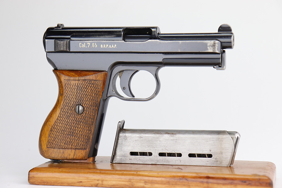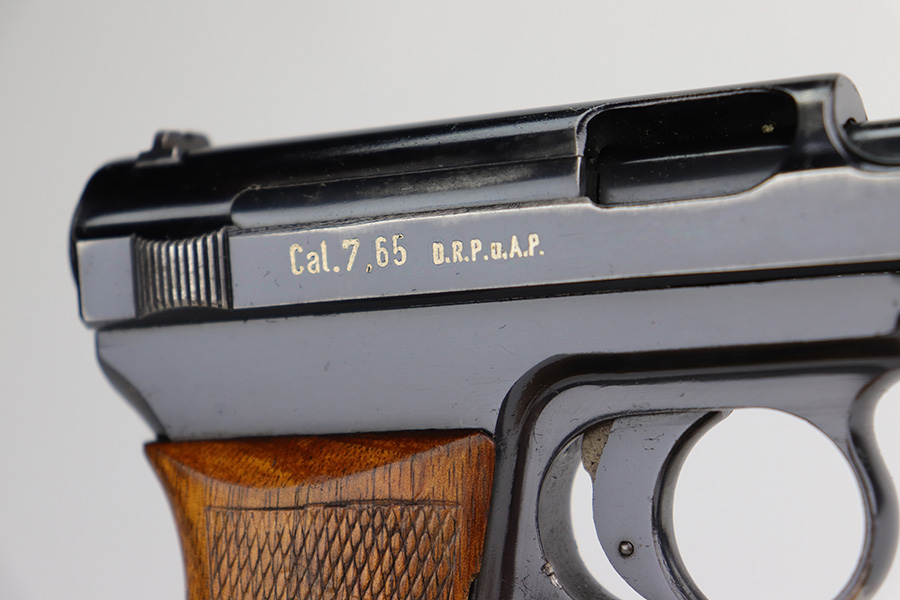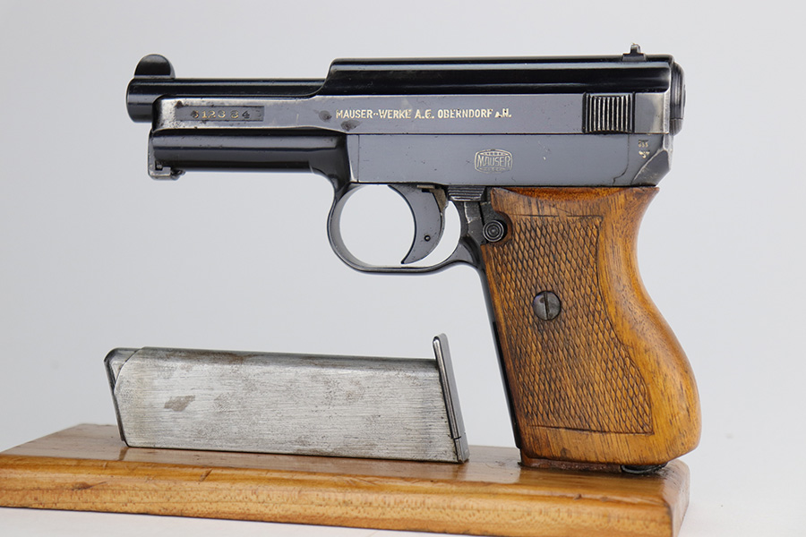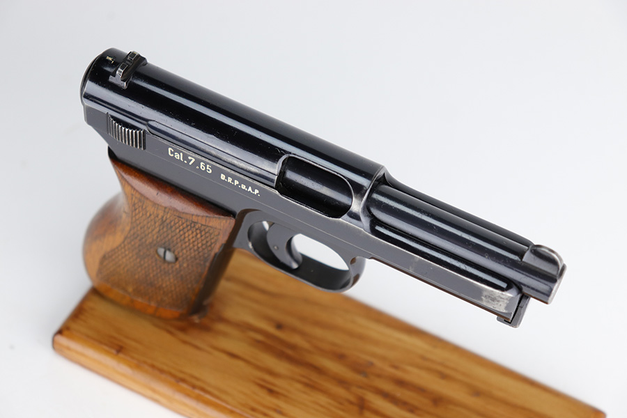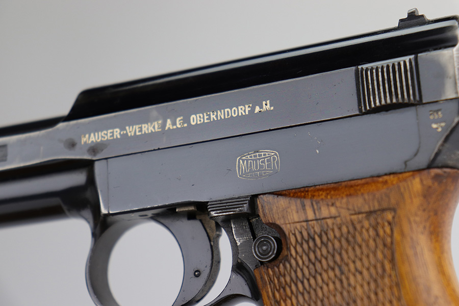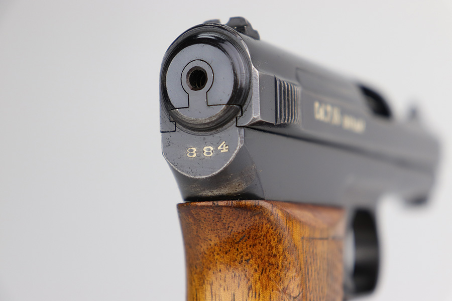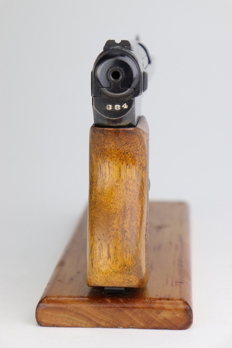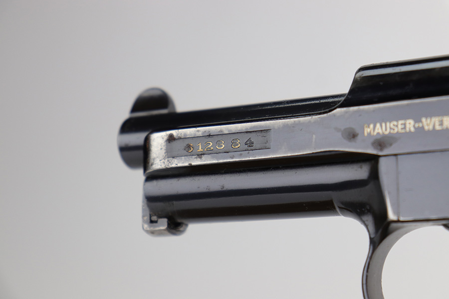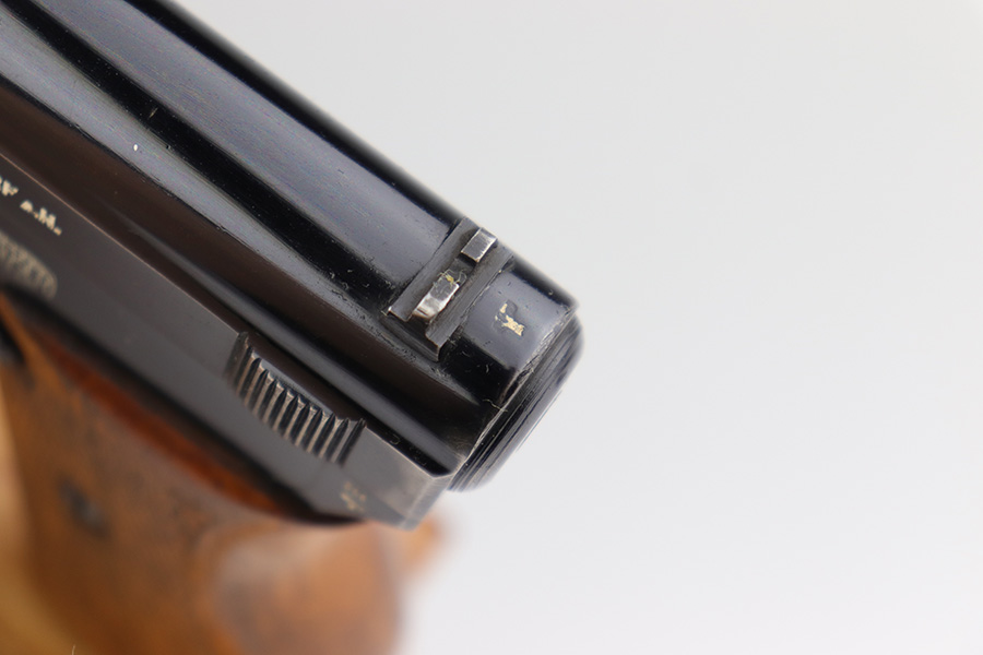 12/13/22 – This is a scarce variation Nazi army issued Mauser model 1934. This gun would have been produced just before the factory switched over to HSC production, around 1940-1941. The pistol is proofed on the back left side of the frame with Eagle/655 and a test-fire eagle stamp. There were only about 8,000 of these pistols issued in this way. It is all matching and has retained about 80-85% of its original high polish finish. Visible wear on both sides of the slide, and a spot of wear on the trigger guard and front strap. Also small areas of pitting on the left side of the slide. Comes with an excellent period-correct wood grip and one proper magazine. Strong, shiny bore.