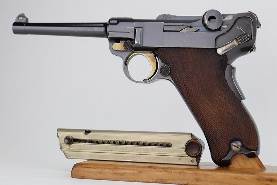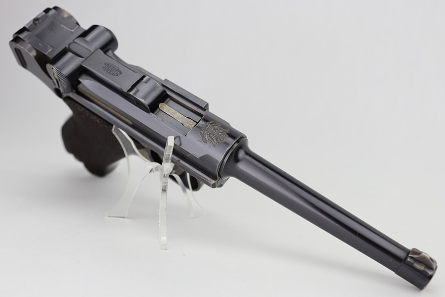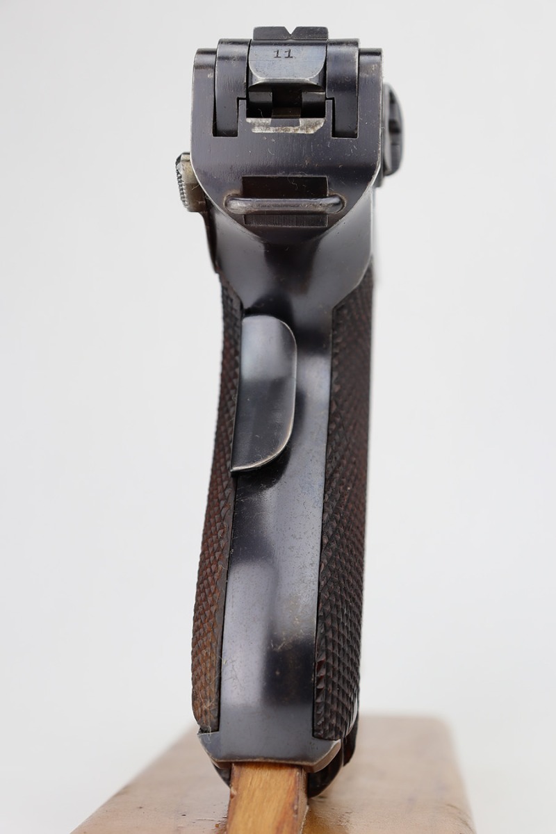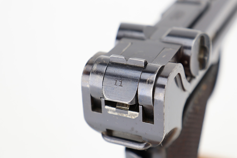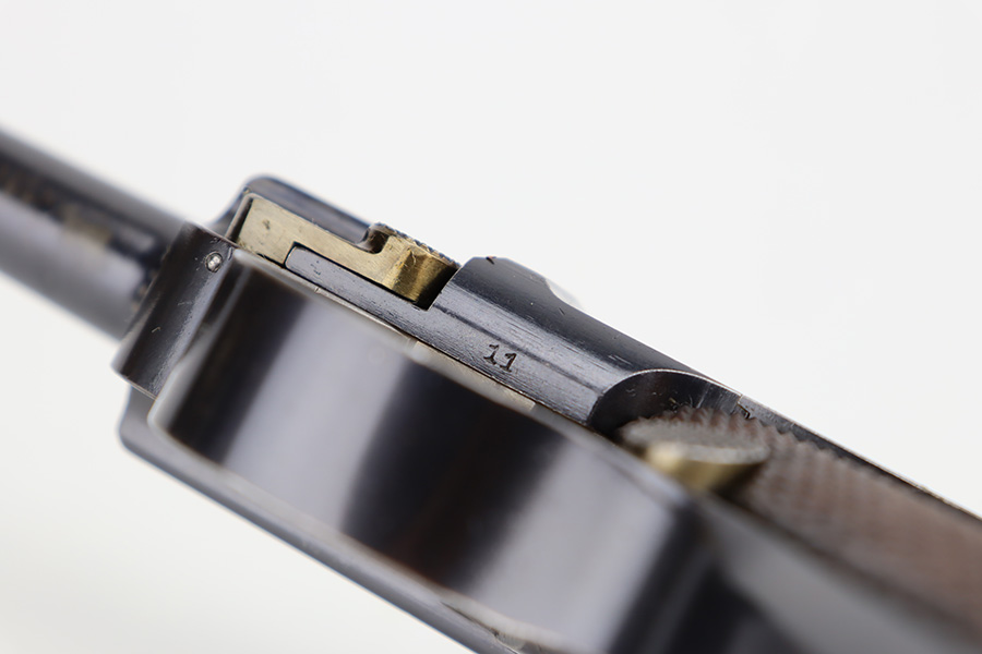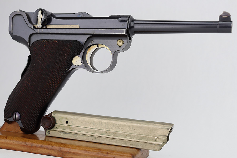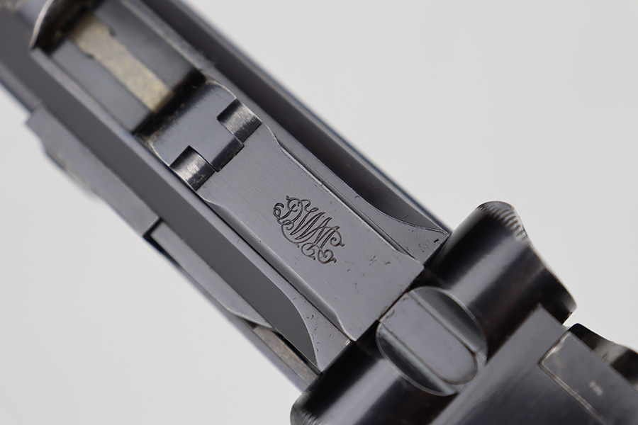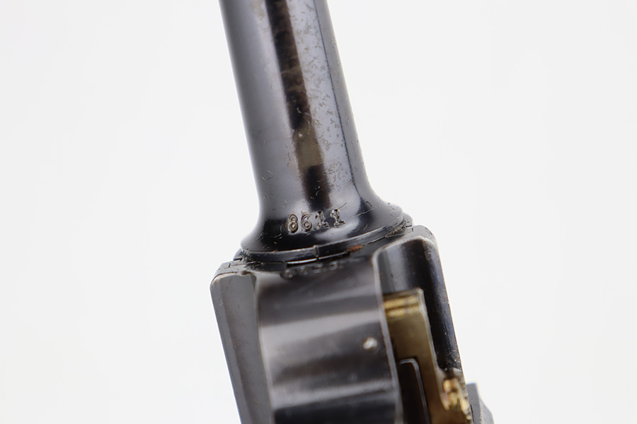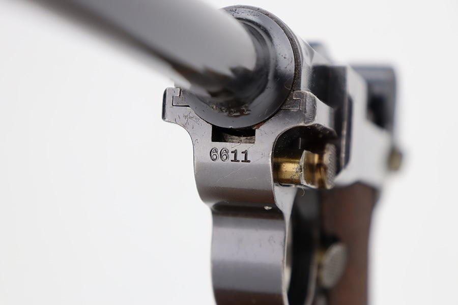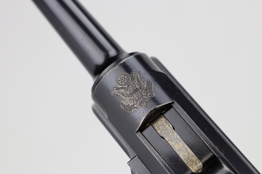 6/23/23 – This is a very rare American Eagle Army Test Luger rig produced by DWM. In April of 1901, the United States Board of Ordnance and Fortifications put in an order for 1,000 of these Lugers following test trials in which the model was fired 2,000 times under the harshest conditions possible. These Lugers feature the Great Seal over the chamber, which was not included upon request, but rather was found to be a great sales tool for the Swiss market by DWM following their initial sales of the same model but featuring the Swiss sunburst. The characteristics that separate these American Test Eagle Lugers from the other Model 1900 Lugers are the lack of proofs, the lack of a ‘GERMANY’ import stamp, and the last two digits of the serial number on the right end of the takedown lever. This particular pistol features grips that are unmarked and an unmarked mag with wood base. The left grip panel does have a chip under the safety that has a glue repair, and there’s a ding in the base of the mag. The bluing on this one is somewhat tough to rate, as there isn’t much actual finish loss but some oxidation and patina on the left side of the barrel, underside of the barrel and front strap. There is also a few thin surface scratches on the left side of the frame, and a spot of pinpricking on the right rail. The bore shows minor frost but is generally shiny with nice rifling. As of the printing of Michael Reese’s book, there was only about 100 of these known and identified in the accepted serial range (6099-7098)!