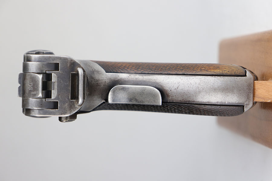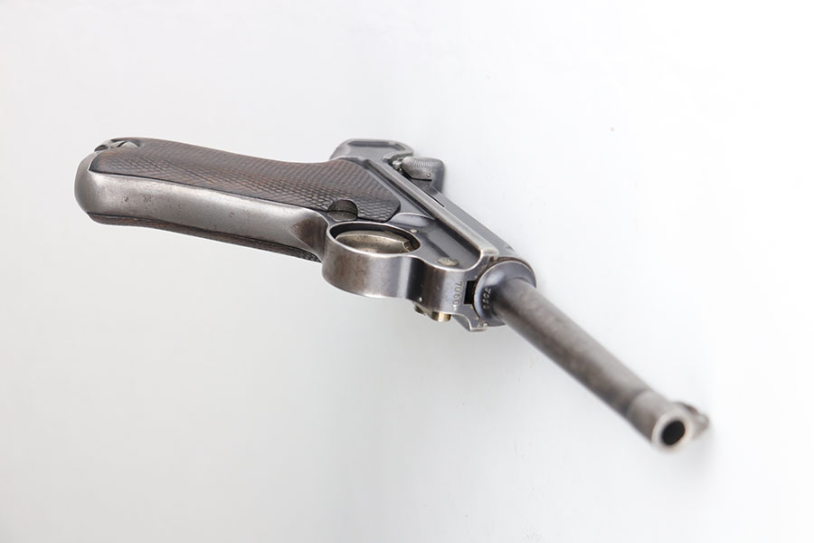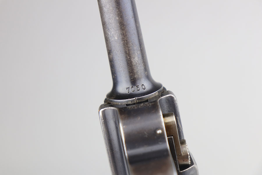 7/17/20 – Here we have an extremely rare and correct American Eagle Army Test Luger produced by DWM. In April of 1901, the United States Board of Ordnance and Fortifications put in an order for 1,000 of these Lugers following test trials in which the model was fired 2,000 times under the harshest conditions possible. These Lugers feature the Great Seal over the chamber, which was not included upon request, but rather was found to be a great sales tool for the Swiss market by DWM following their initial sales of the same model but featuring the Swiss sunburst. The characteristics that separate these American Test Eagle Lugers from the other Model 1900 Lugers are the lack of proofs, the lack of a ‘GERMANY’ import stamp, and the last two digits of the serial number on the right end of the takedown Lever. This particular pistol features grips that are numbered and matching to the gun, and a wood-bottom magazine that is unmarked. The grips do show considerable handling wear and the common chip under the safety, and there is a crack in the base of the magazine. The pistol has maybe 40-50% of the original blue remaining with especially worn straps. Bore is shiny but the rifling is worn. As of the printing of Michael Reese’s book on the subject, there was only about 100 of these known and identified in the accepted serial range (6099-7098)!