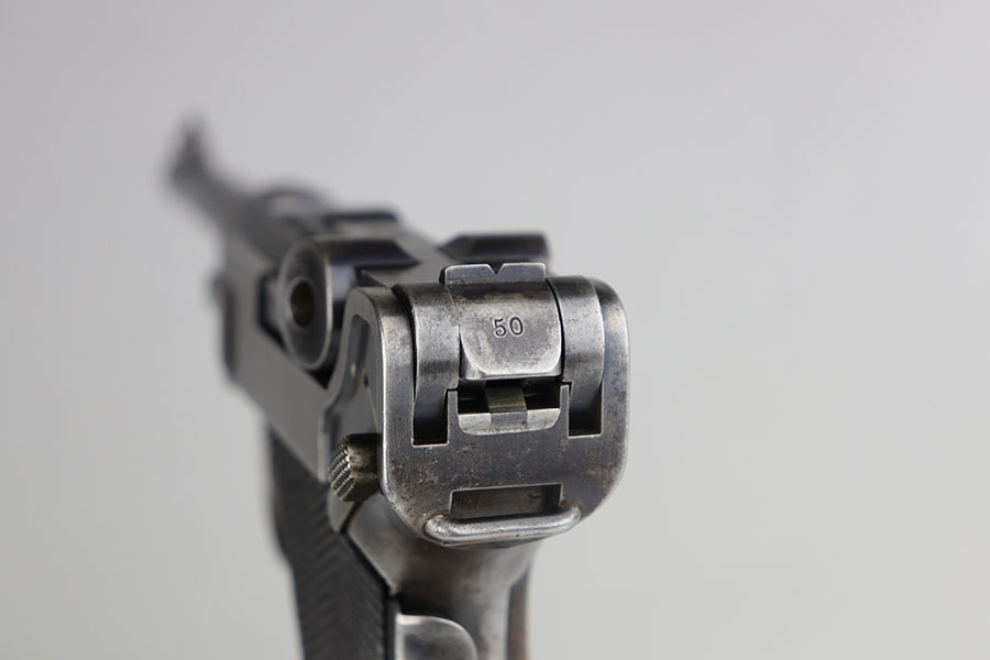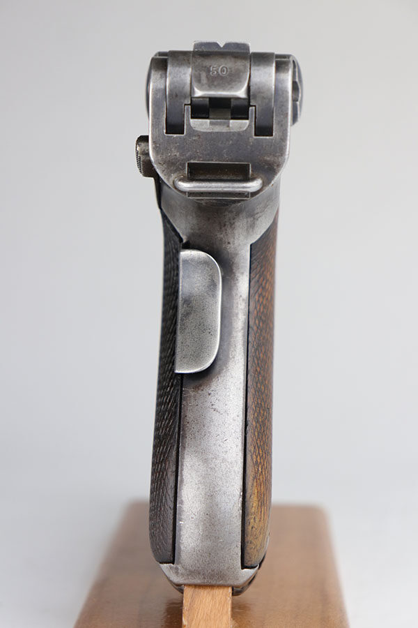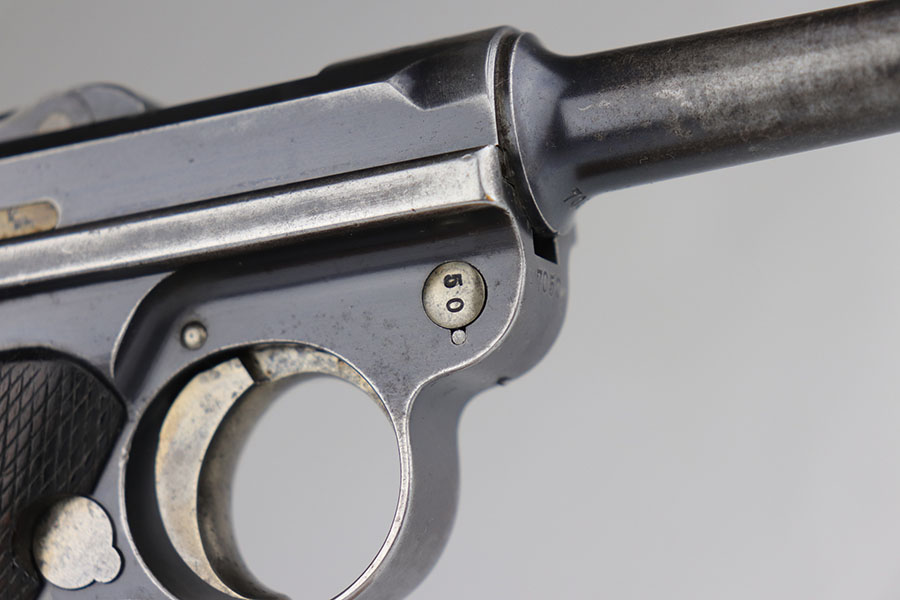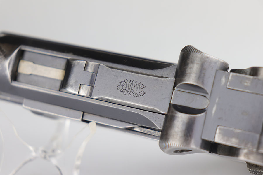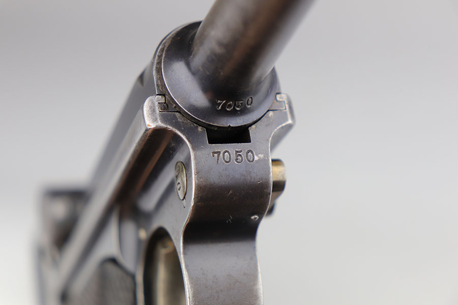 2/27/23 – Here we have an extremely rare and correct American Eagle Army Test Luger produced by DWM. In April of 1901, the United States Board of Ordnance and Fortifications put in an order for 1,000 of these Lugers following test trials in which the model was fired 2,000 times under the harshest conditions possible. These Lugers feature the Great Seal over the chamber, which was not included upon request, but rather was found to be a great sales tool for the Swiss market by DWM following their initial sales of the same model but featuring the Swiss sunburst. The characteristics that separate these American Test Eagle Lugers from the other Model 1900 Lugers are the lack of proofs, the lack of a ‘GERMANY’ import stamp, and the last two digits of the serial number on the right end of the takedown Lever. This particular pistol features grips that are numbered and matching to the gun, and a wood-bottom magazine that is unmarked. The grips do show considerable handling wear and the common chip under the safety, and there is a crack in the base of the magazine. The pistol has maybe 40-50% of the original blue remaining with especially worn straps. Bore is shiny but the rifling is worn. As of the printing of Michael Reese’s book on the subject, there was only about 100 of these known and identified in the accepted serial range (6099-7098)!