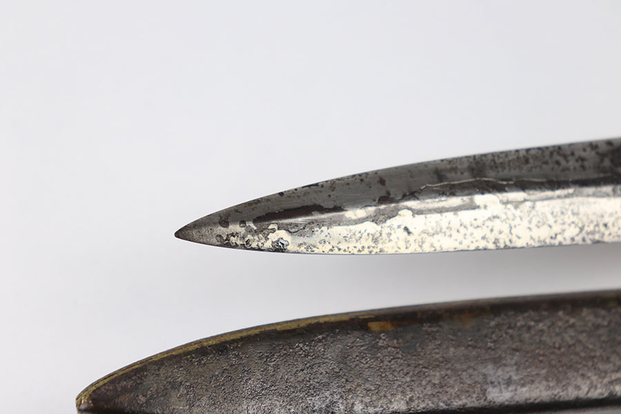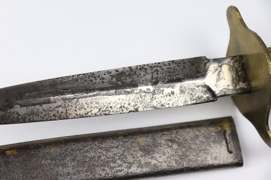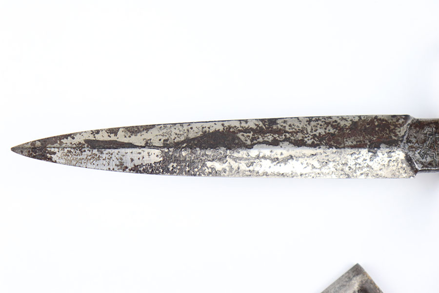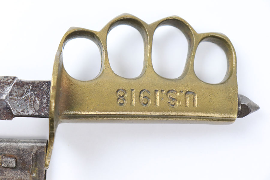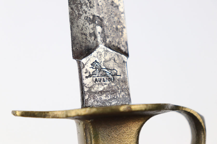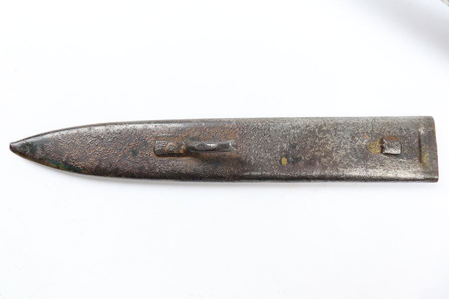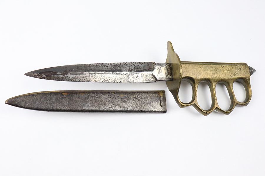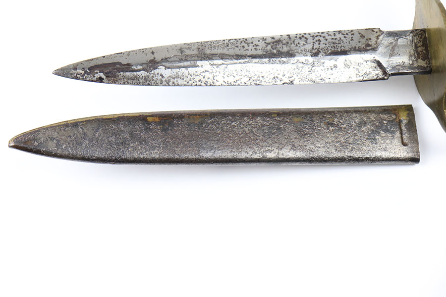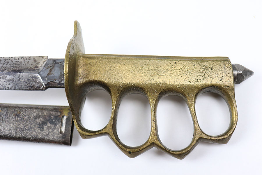 8/27/21 – This is an original, rare variation WW1 Trench knife. The blade is maker stamped by the French maker, Au Lion. This is a fairly scarce maker from this era. There’s surface wear and dark discoloration on both sides of the blade, as shown. The blade comes with an original scabbard, with one hook in tact and one hook has broken (as shown). There scabbard also has surface wear and discoloration throughout. Price reduced accordingly.