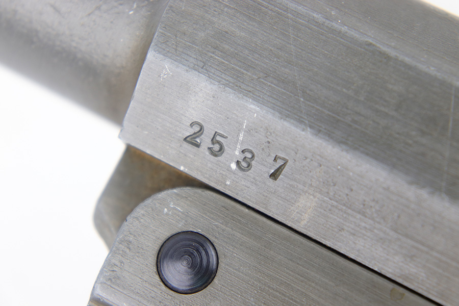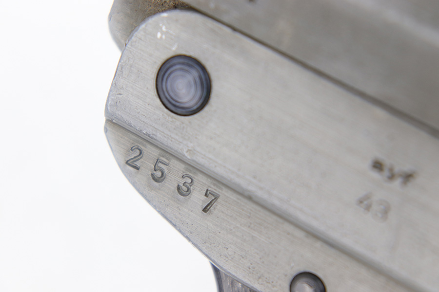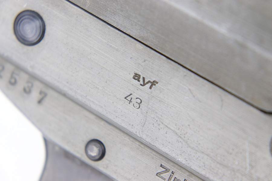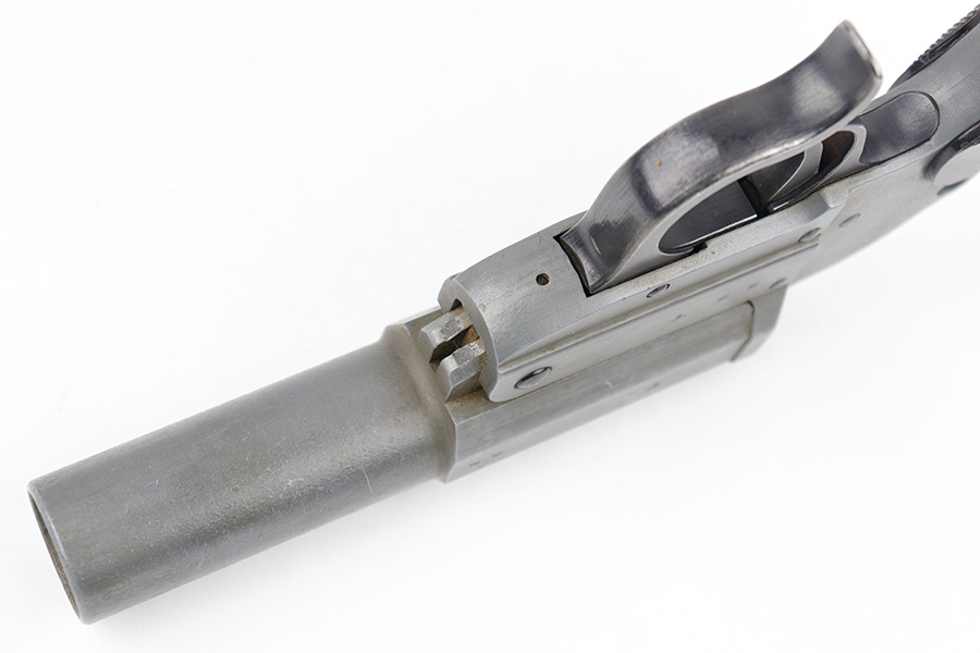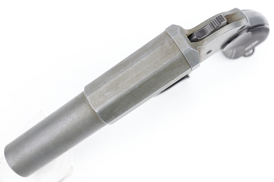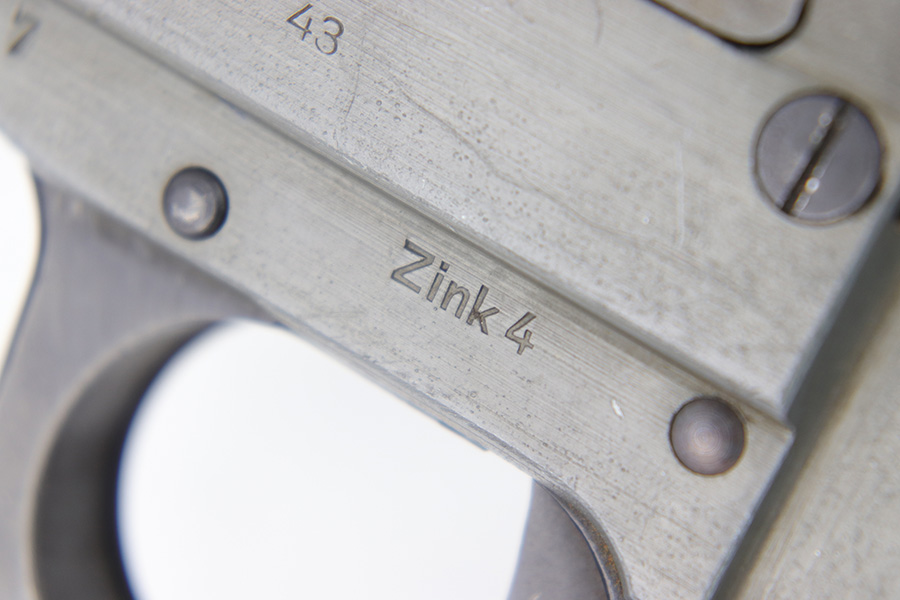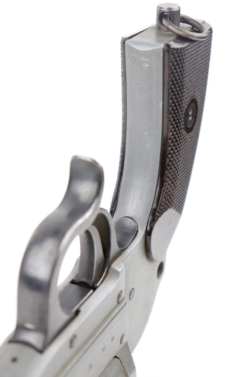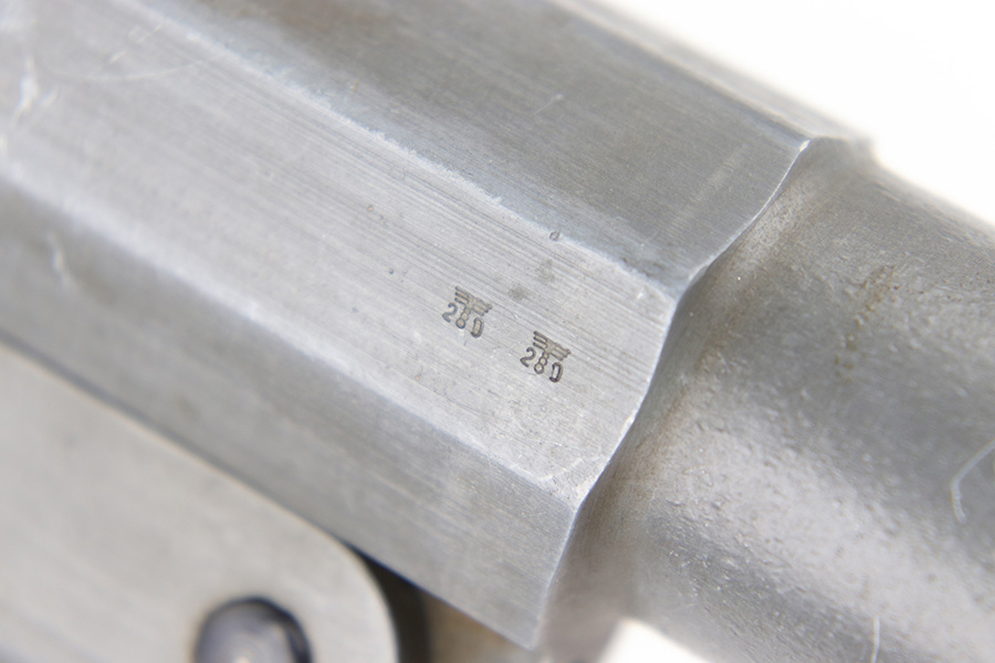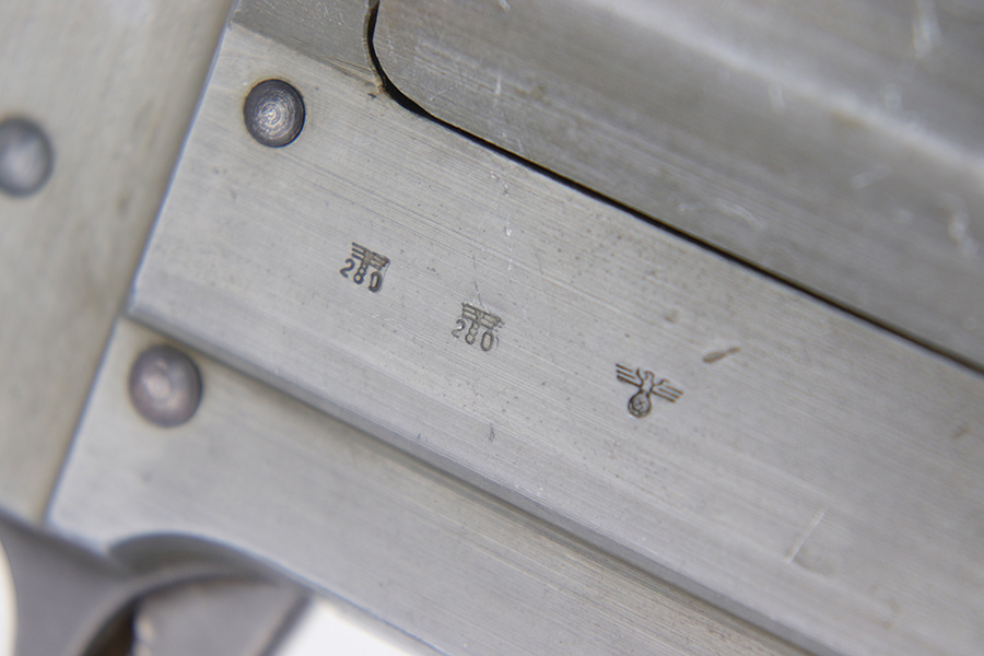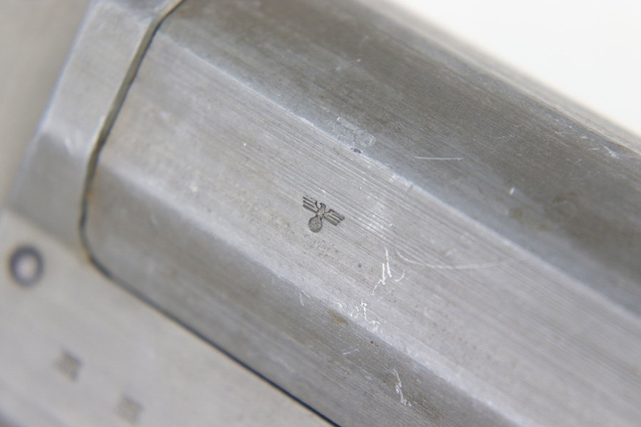 7/14/23 – This is an original, rare variation Erma ayf 43 LP34 Flare Pistol. The flare pistol is a later wartime example made from zinc alloy as the Germans were saving materials and testing other metals for production. Only around 12,800 zinc LP34 flare pistols were produced by Erma and Berlin Lubecker. This example is in great condition with bare zinc metal throughout the frame and barrel. There’s some mild machine marks and light discoloration throughout, but no corrosion or notable spots of wear. The small parts (trigger, trigger guard, release lever, and hammer) have been blued and are in excellent condition with very clean finish throughout. Original grips have no cracks or chips and a strong exterior diamond pattern. Mechanically sound with smooth functioning parts. The bore is in great condition with mild signs of use wear and aging.