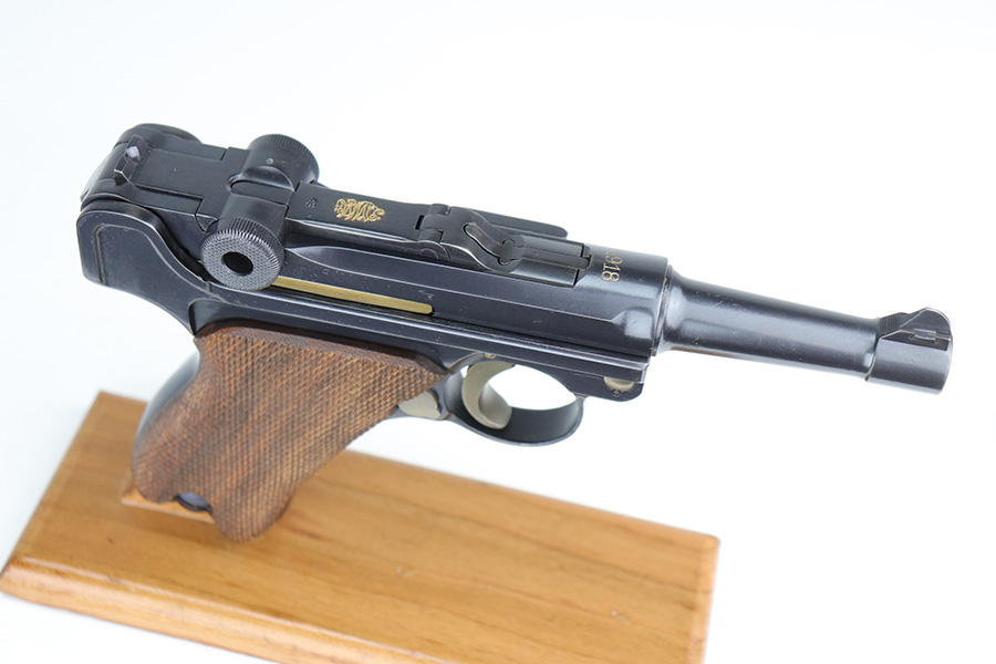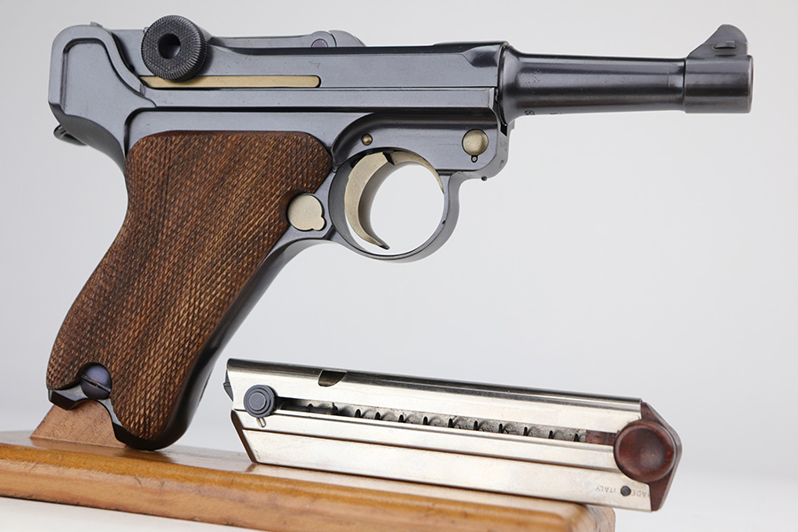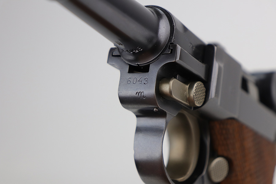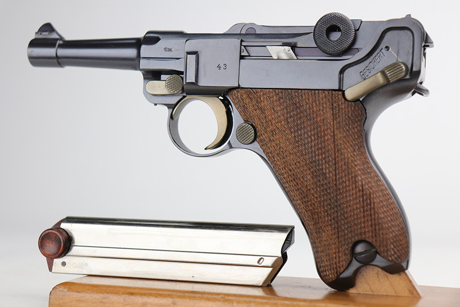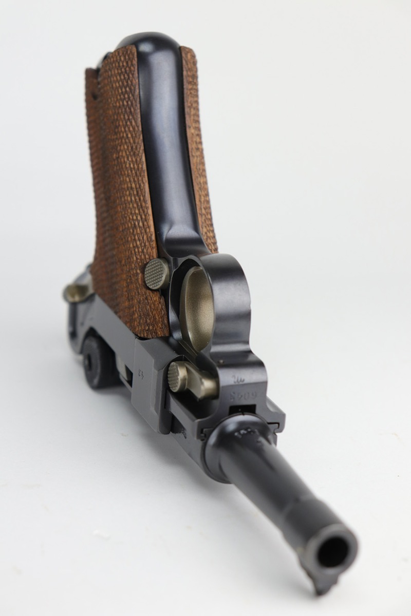 9/28/21 – This is a rare and desirable custom “Baby” Luger in beautiful, restored condition. We believe the work was done by Lugerman, and the pistol is built using some vintage parts, but requires custom modification as the frame, grips, magazine and receiver are all smaller than a standard, factory Luger. The rust blue finish is also restored during this work, as is the straw. Beautiful bore that hardly looks used. Sharply checkered grips and mint magazine. Presumably fewer than 1,000 custom ‘Baby’ Lugers have been made, as Michael Krause only ever made 100, for example.