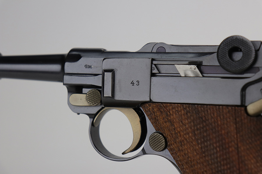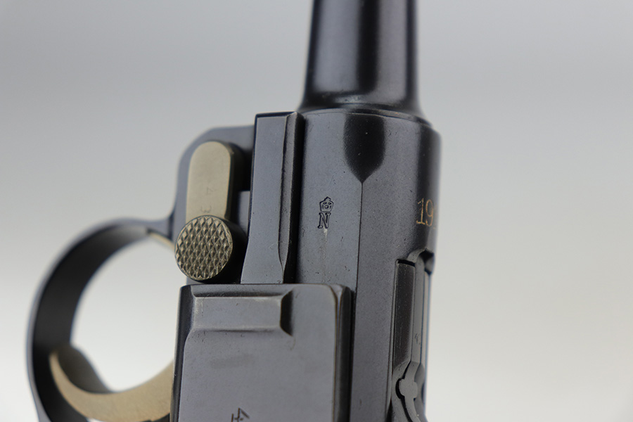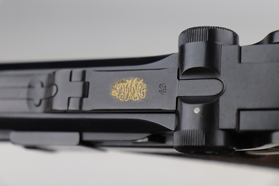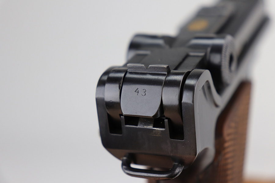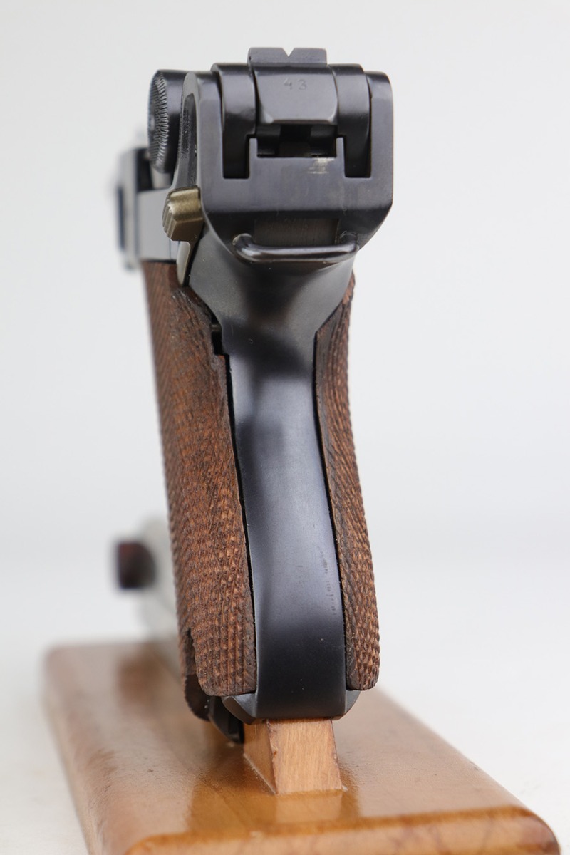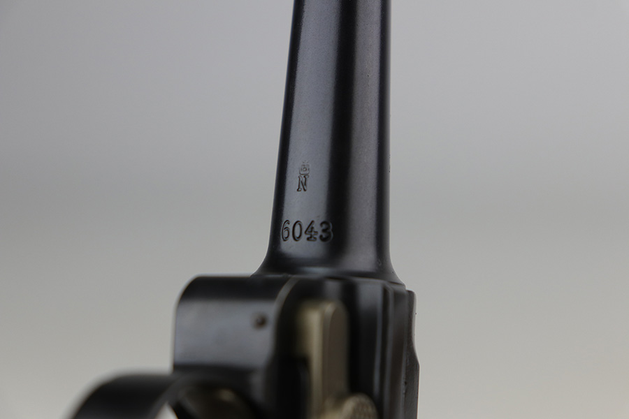 9/28/21 – This is a rare and desirable custom “Baby” Luger in beautiful, restored condition. We believe the work was done by Lugerman, and the pistol is built using some vintage parts, but requires custom modification as the frame, grips, magazine and receiver are all smaller than a standard, factory Luger. The rust blue finish is also restored during this work, as is the straw. Beautiful bore that hardly looks used. Sharply checkered grips and mint magazine. Presumably fewer than 1,000 custom ‘Baby’ Lugers have been made, as Michael Krause only ever made 100, for example.