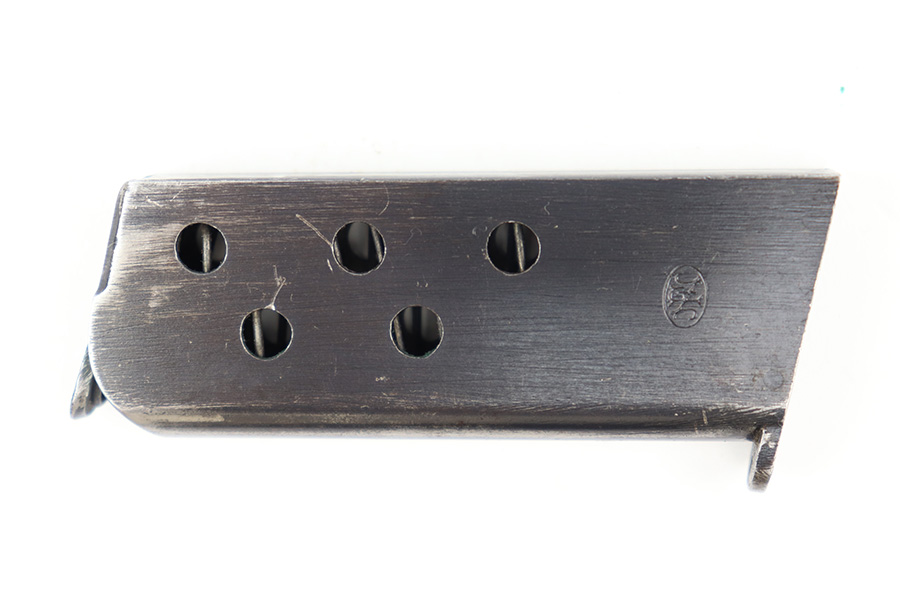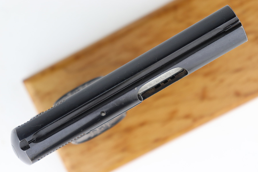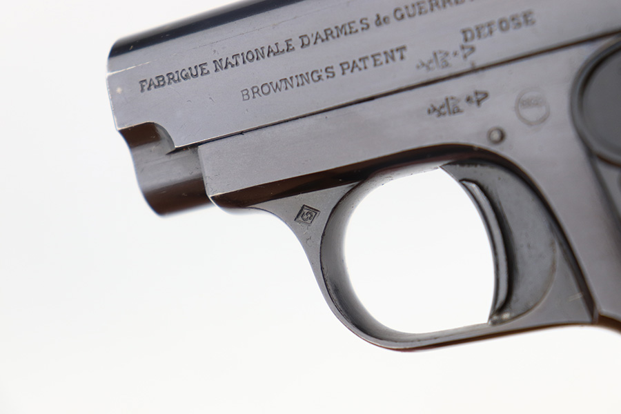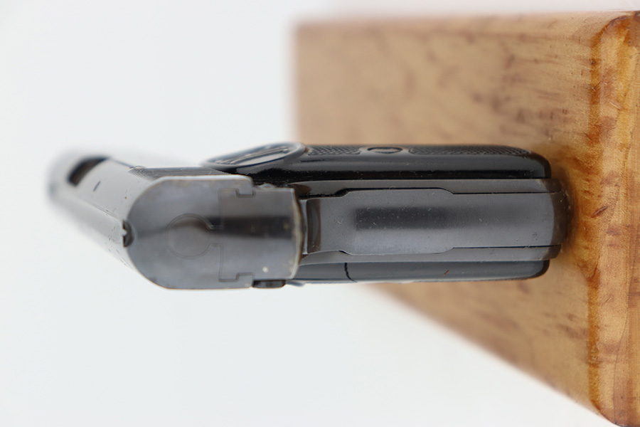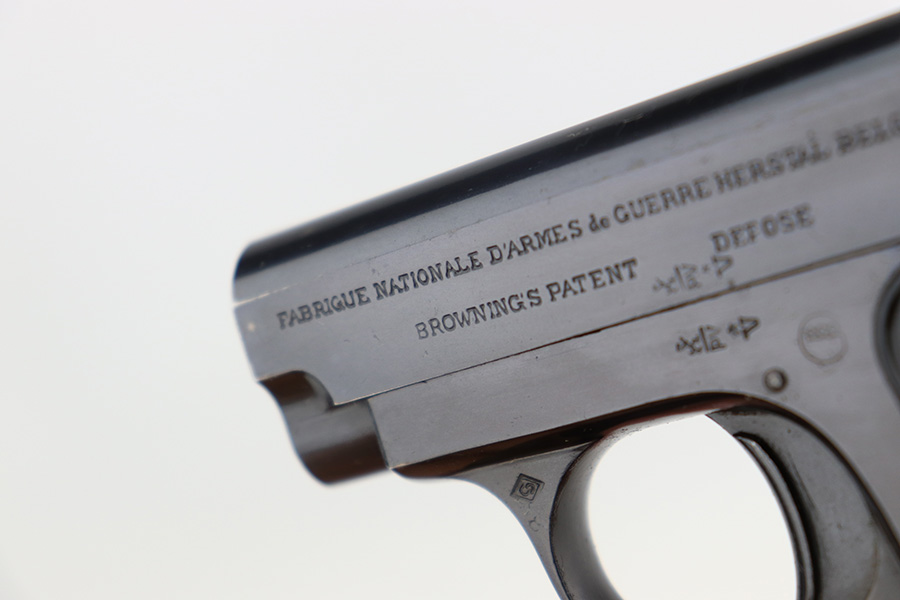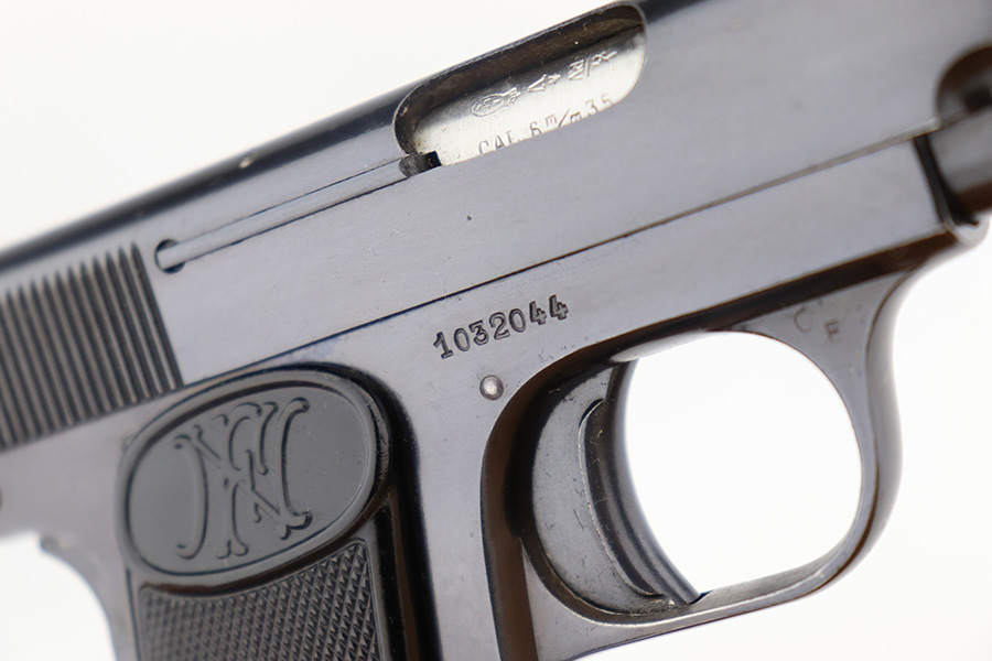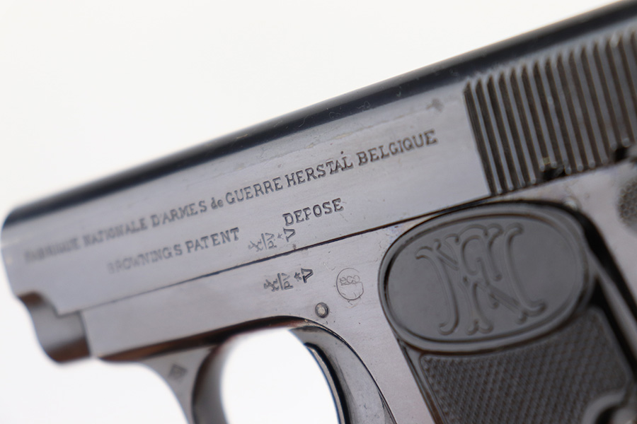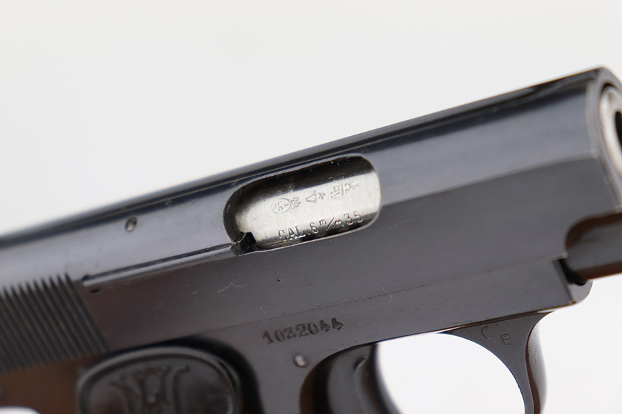 11/28/22 – This is a near-mint example of an FN Browning “Baby” Model 1906 pistol, sold in the commercial market in the 1930’s. This one is rare because it has a “Geco” retailer marking on the left side of the frame. It comes as a rig with a scarce maker marked black leather holster and two proper magazines. The gun has retained nearly all of its original bluing with very minor wear around the edges of the tang and along the high edge of the left side of the slide. Comes with excellent black plastic grips – a noticeable crack on the left side. Minty bore.