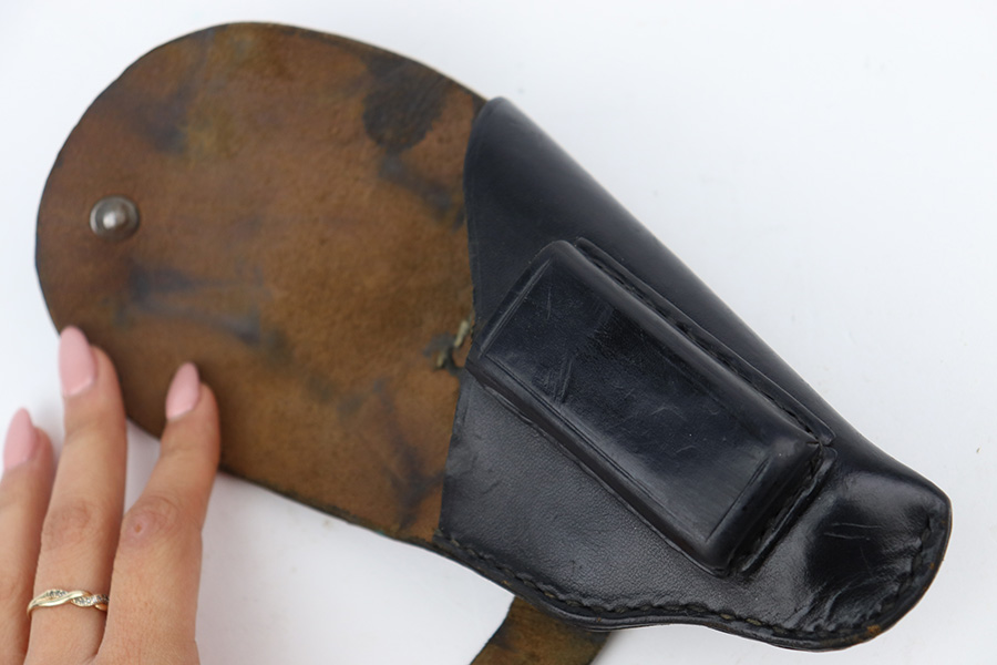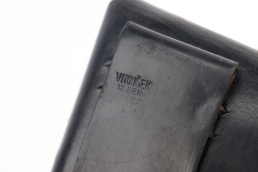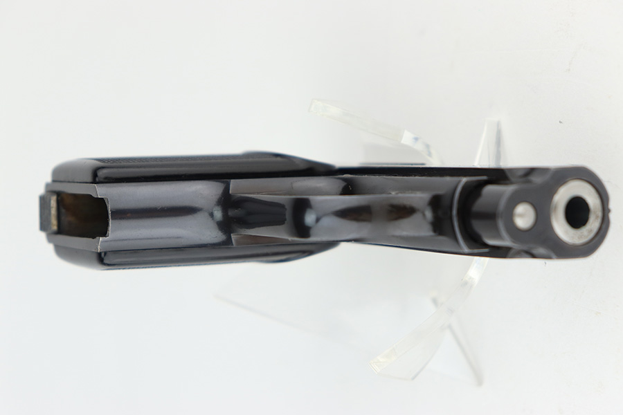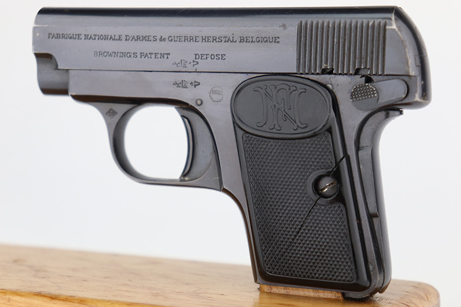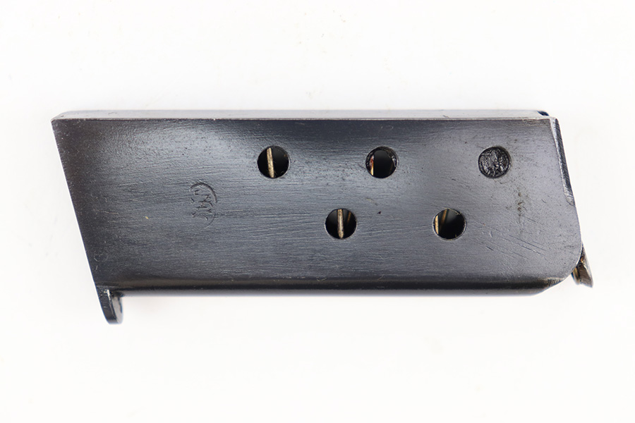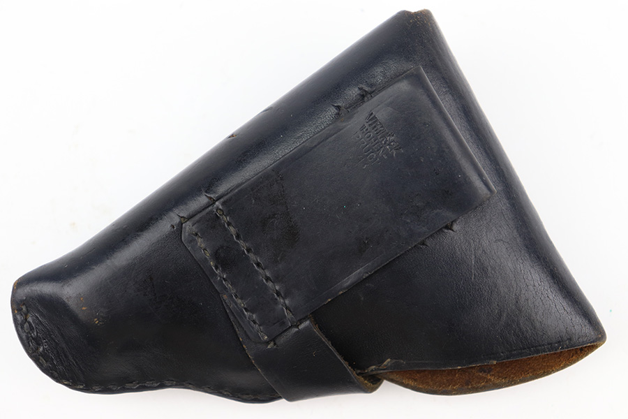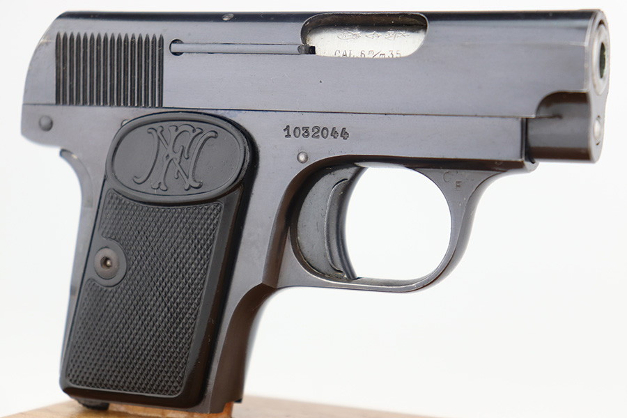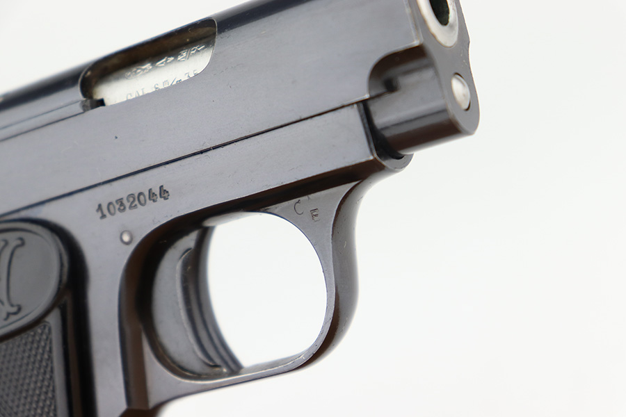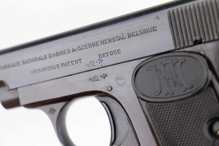 11/28/22 – This is a near-mint example of an FN Browning “Baby” Model 1906 pistol, sold in the commercial market in the 1930’s. This one is rare because it has a “Geco” retailer marking on the left side of the frame. It comes as a rig with a scarce maker marked black leather holster and two proper magazines. The gun has retained nearly all of its original bluing with very minor wear around the edges of the tang and along the high edge of the left side of the slide. Comes with excellent black plastic grips – a noticeable crack on the left side. Minty bore.