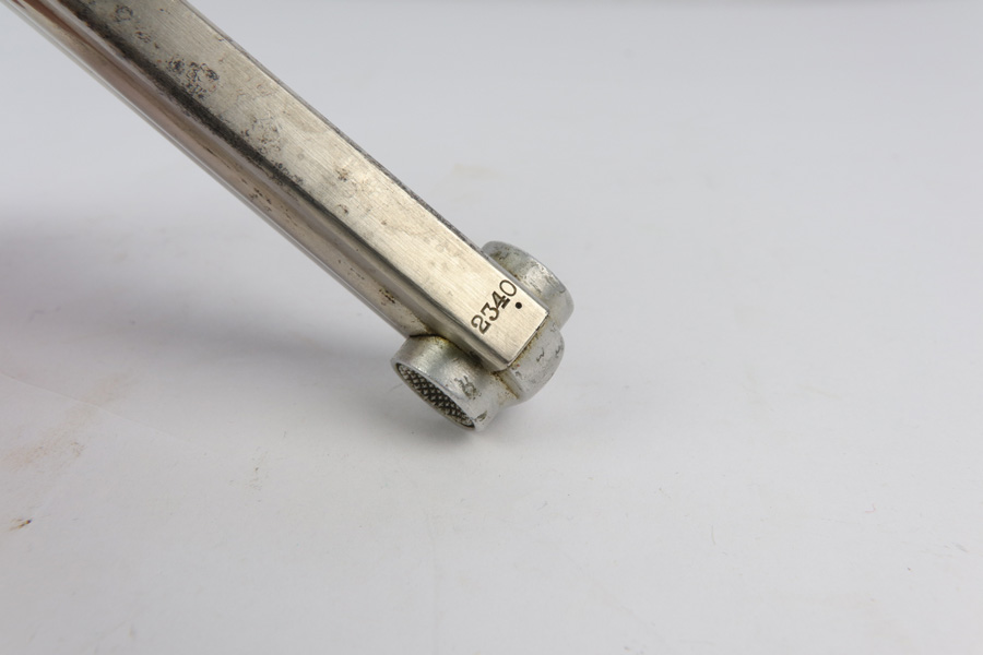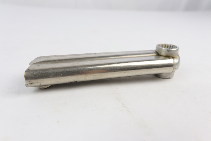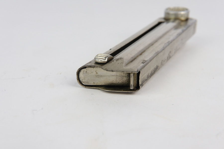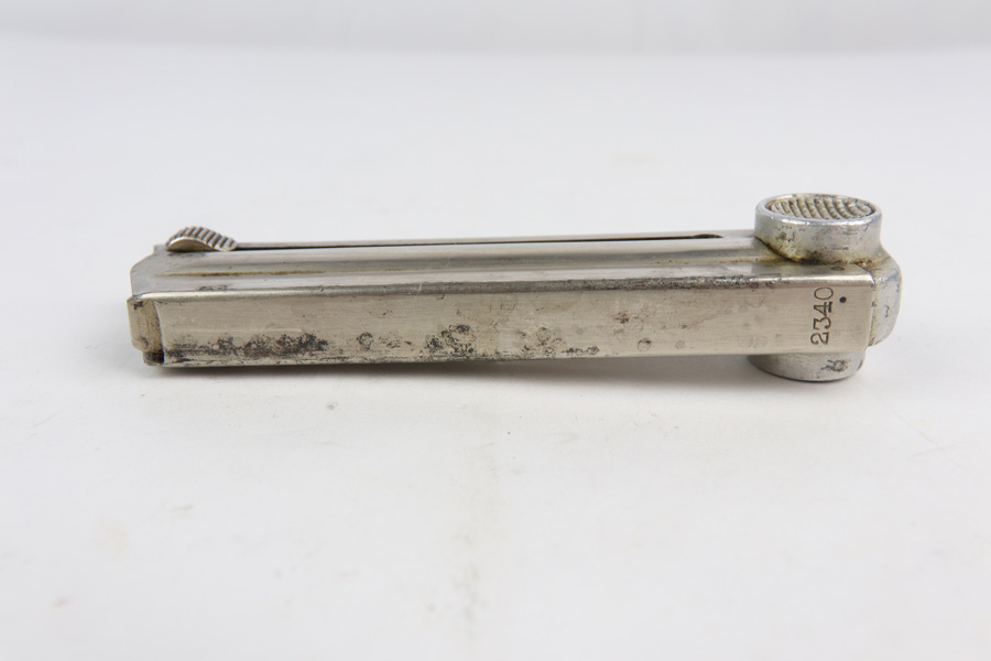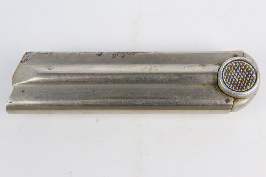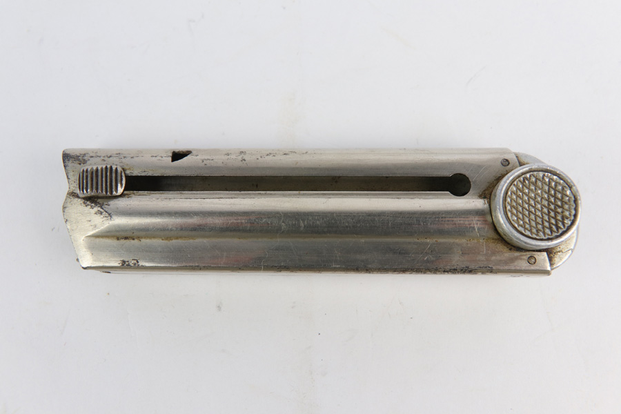 11/28/18 – This is an ultra-rare spare magazine for a Baby Nambu pistol. These magazines are extremely hard to find. The magazine has a nickled frame and aluminum base. The spine is serial numbered 2340. There’s some light oxidation on the spine, but overall this is in great shape with no rust or pitting. Fully functional spring. Guaranteed original and authentic.