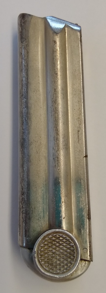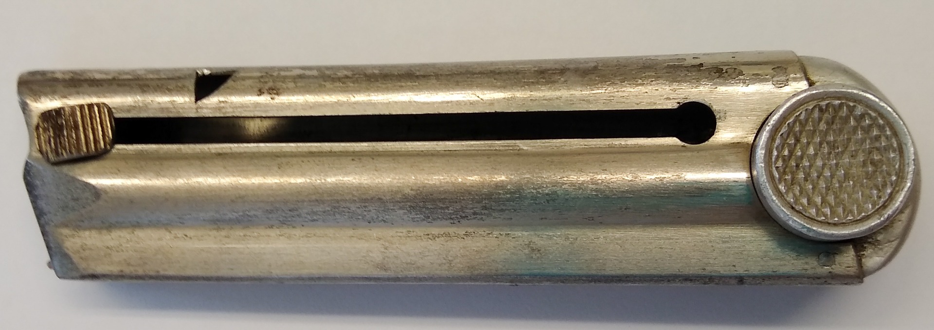10/1/20 – This is a rare Baby Nambu magazine. It is marked 3022. It is in very good condition with visible wear from age and use. The true value of this item comes from its scarcity. The magazine fits a Baby Nambu pistol and is sized for a 7mm cartridge.