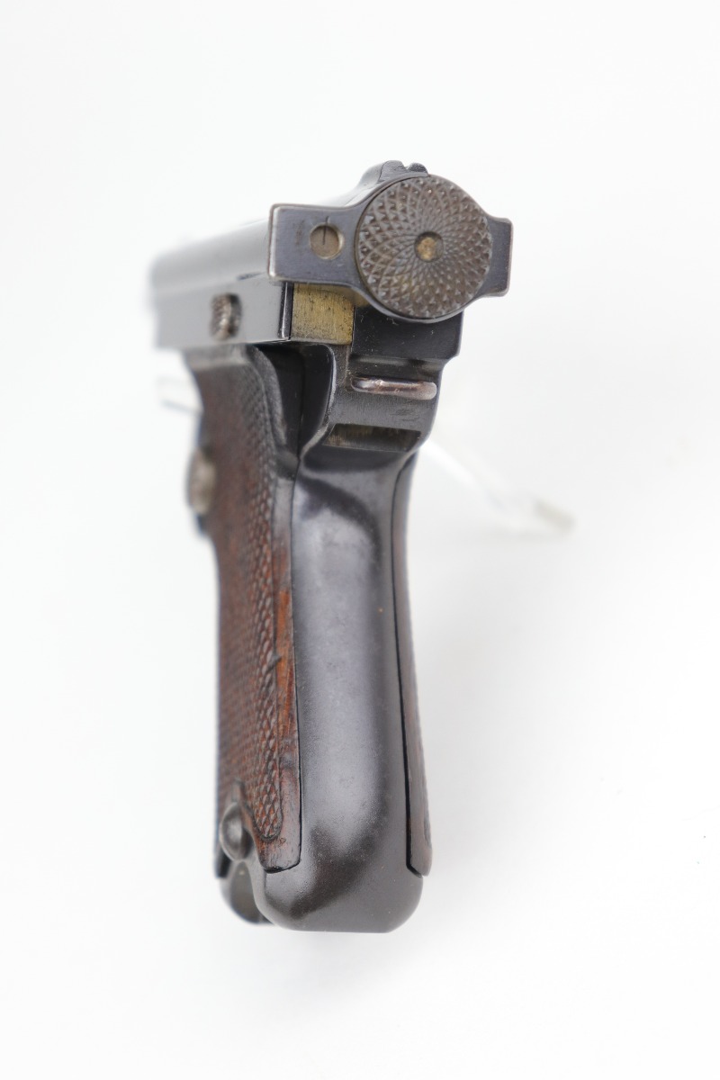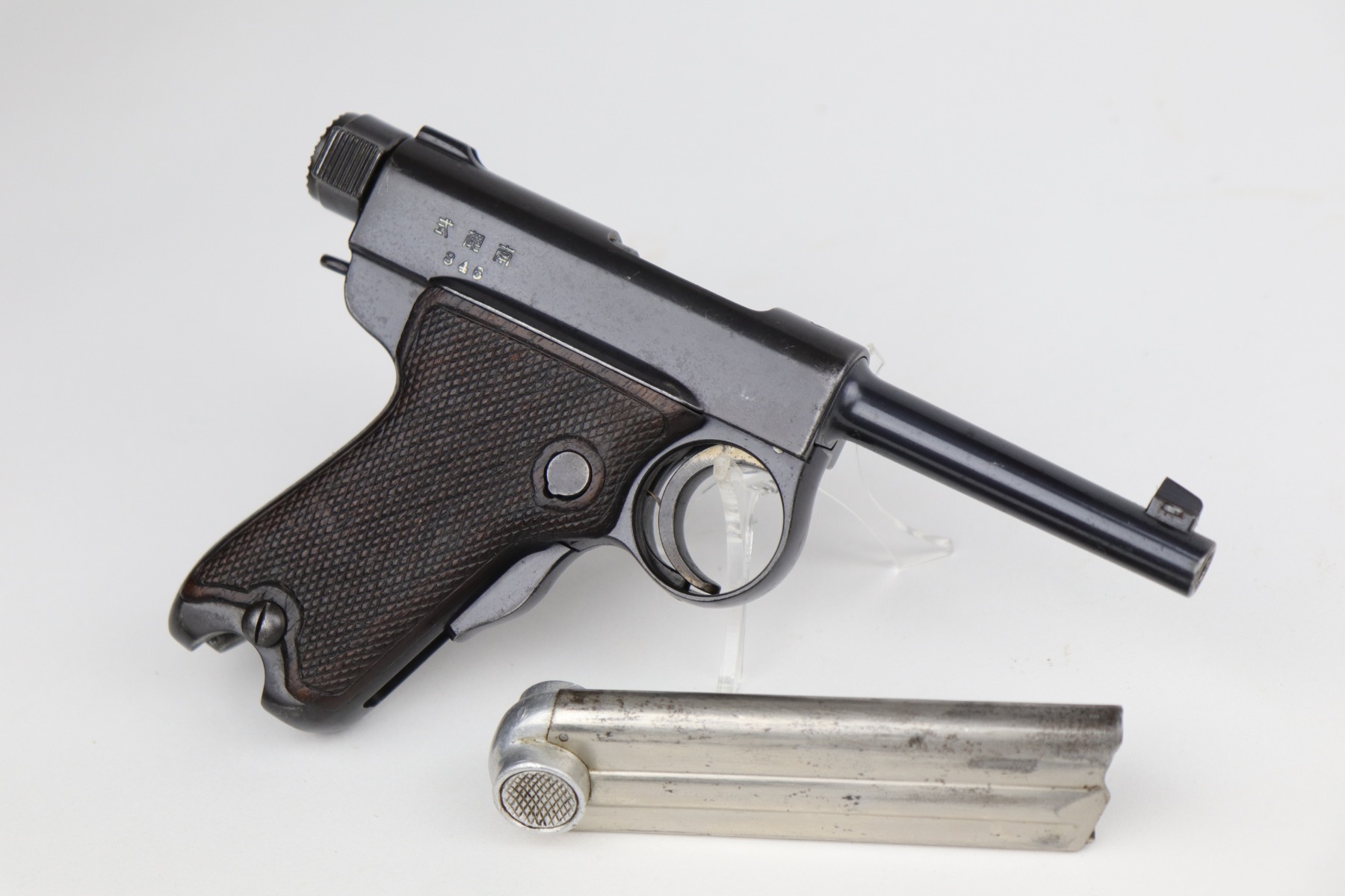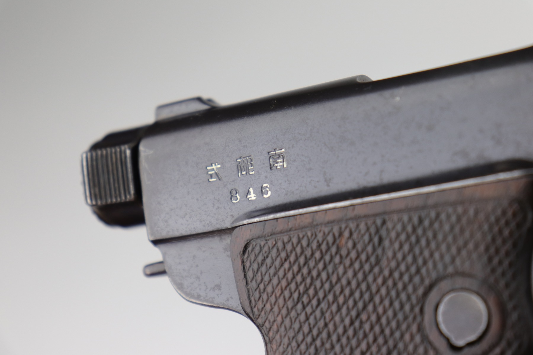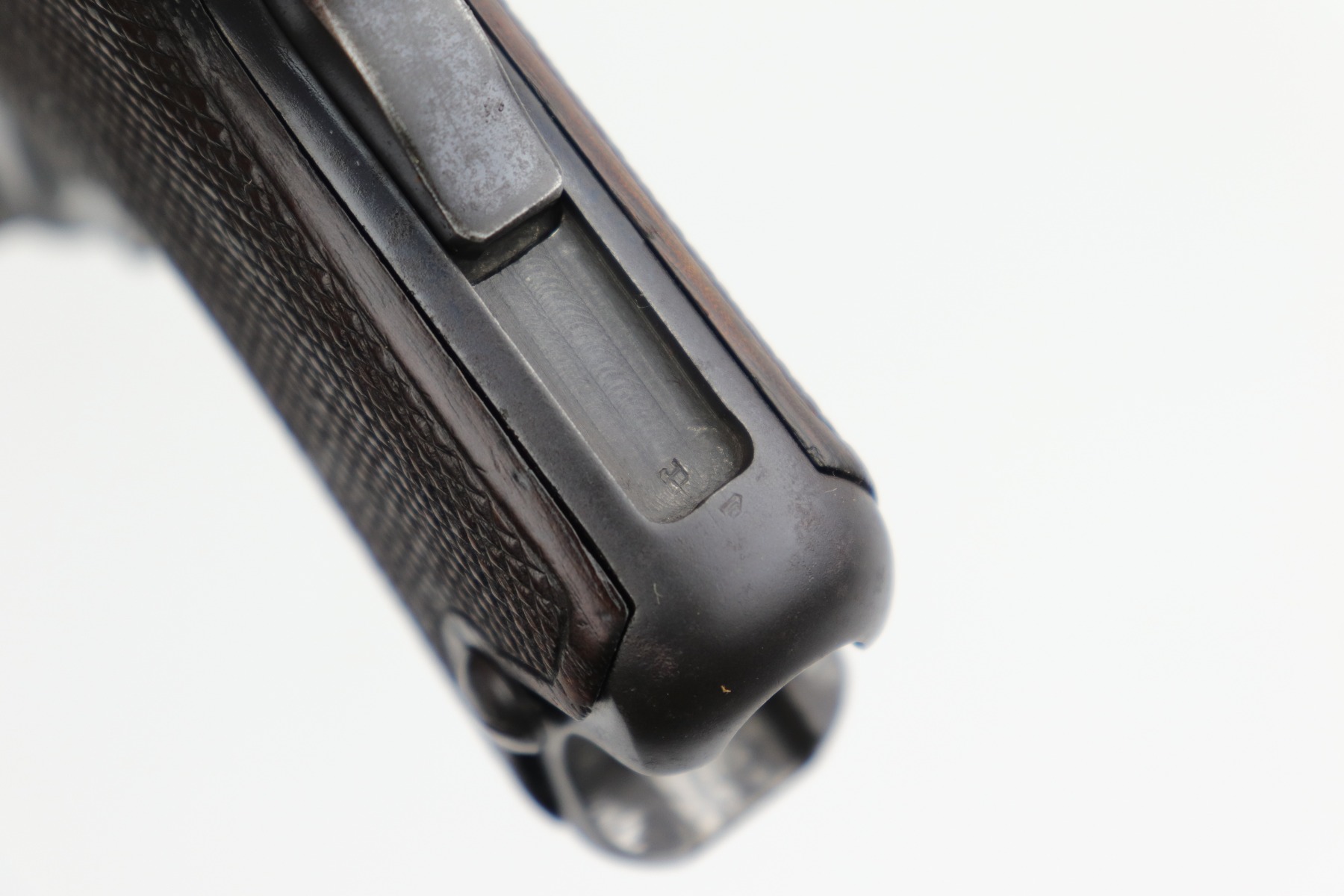 12/11/23 – This is a nice example of a Baby Nambu that was likely part of a private purchase for a Japanese officer of either the Army or Navy. The marking on the top of the chamber indicates it was manufactured in the Tokyo Arsenal. The gun is all matching and comes with one original matching magazine. The gun has retained roughly 90% of its original bluing. The most obvious sign of wear is pin-pricking and spotty oxidation in the metal throughout. This is typical for these guns since they were used mostly around salt water. There is also minor wear on the high edges of the slide. Excellent grips. The bore is fairly shiny but the rifling shows some wear and there’s some freckling in the grooves.
