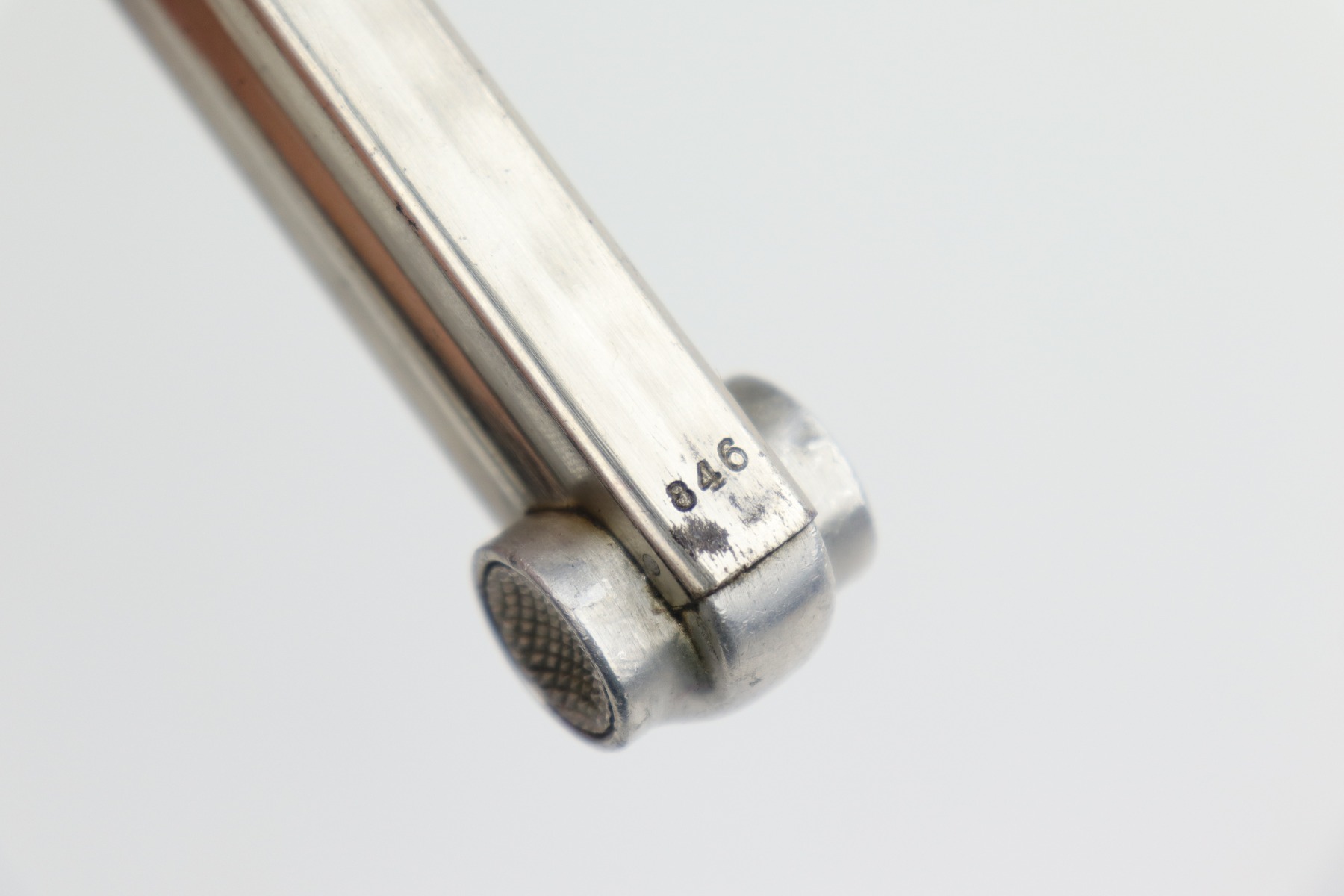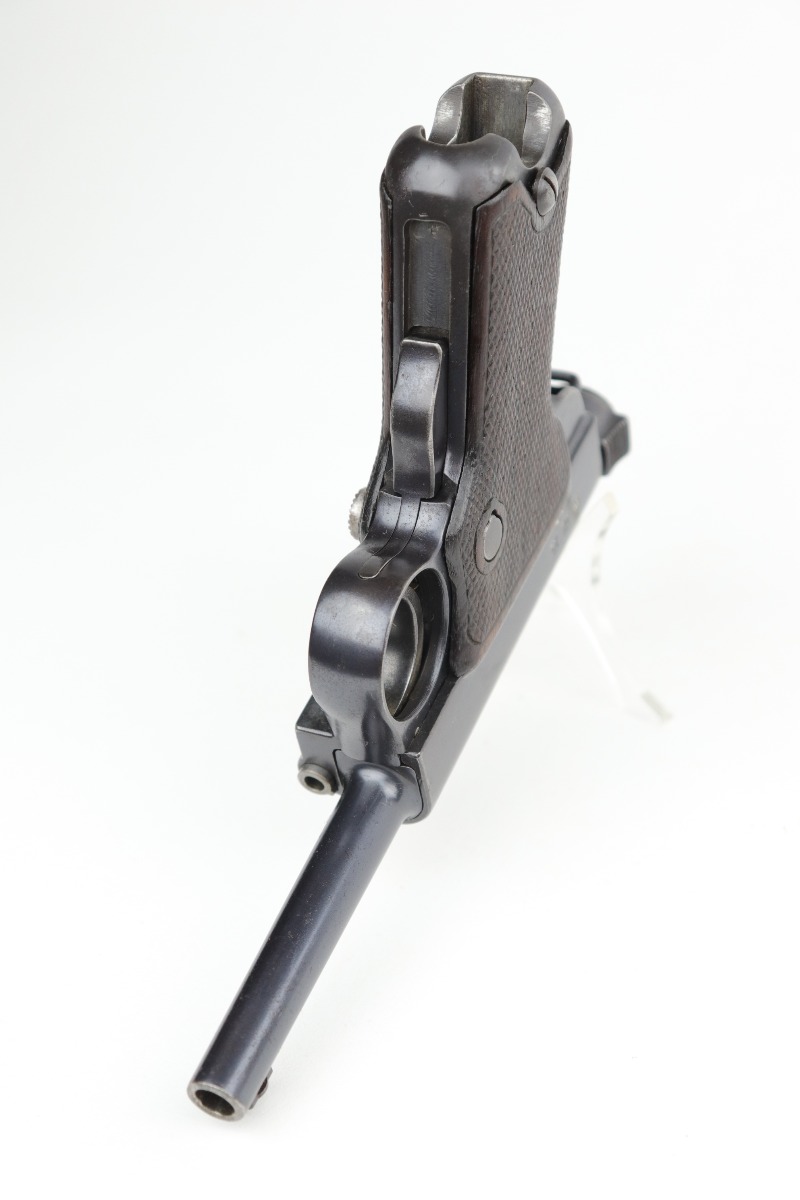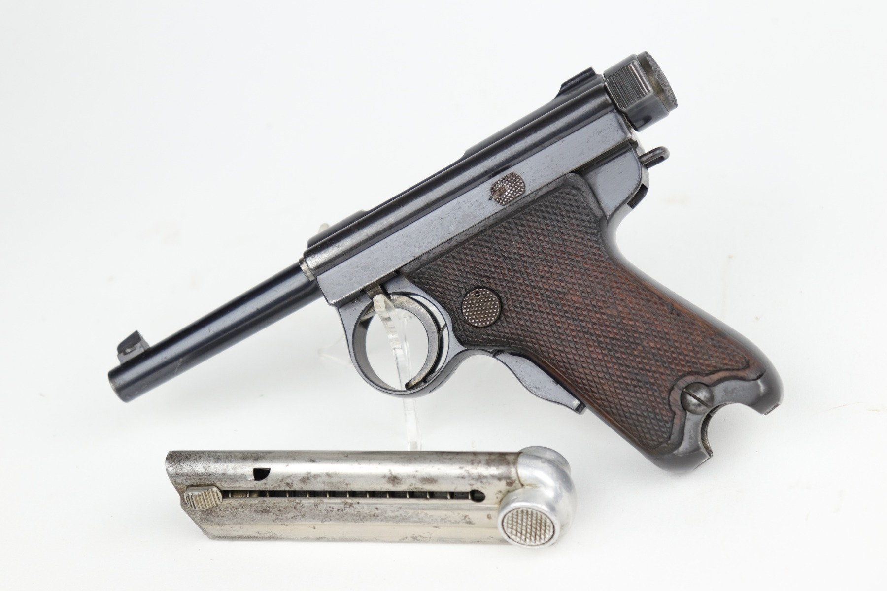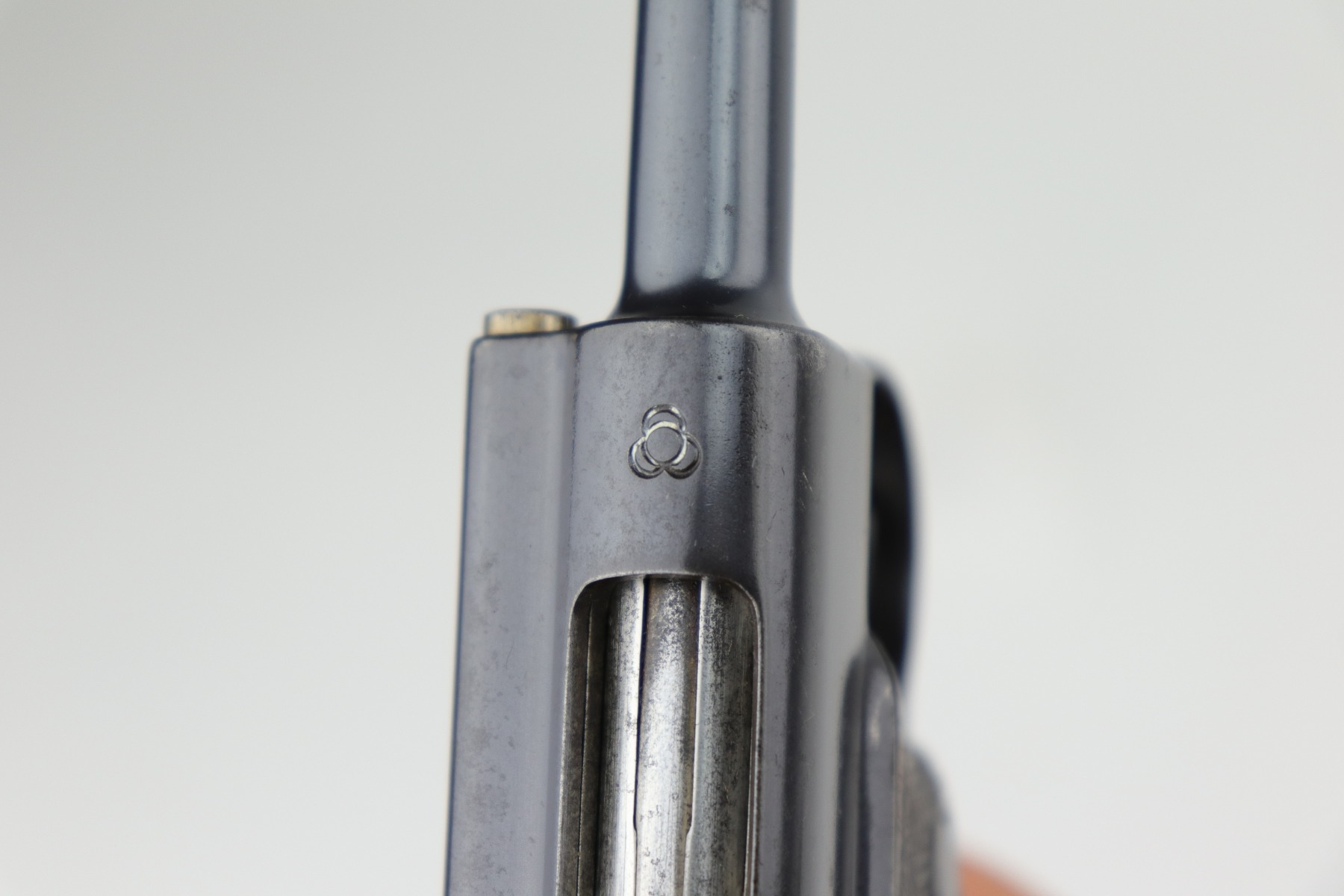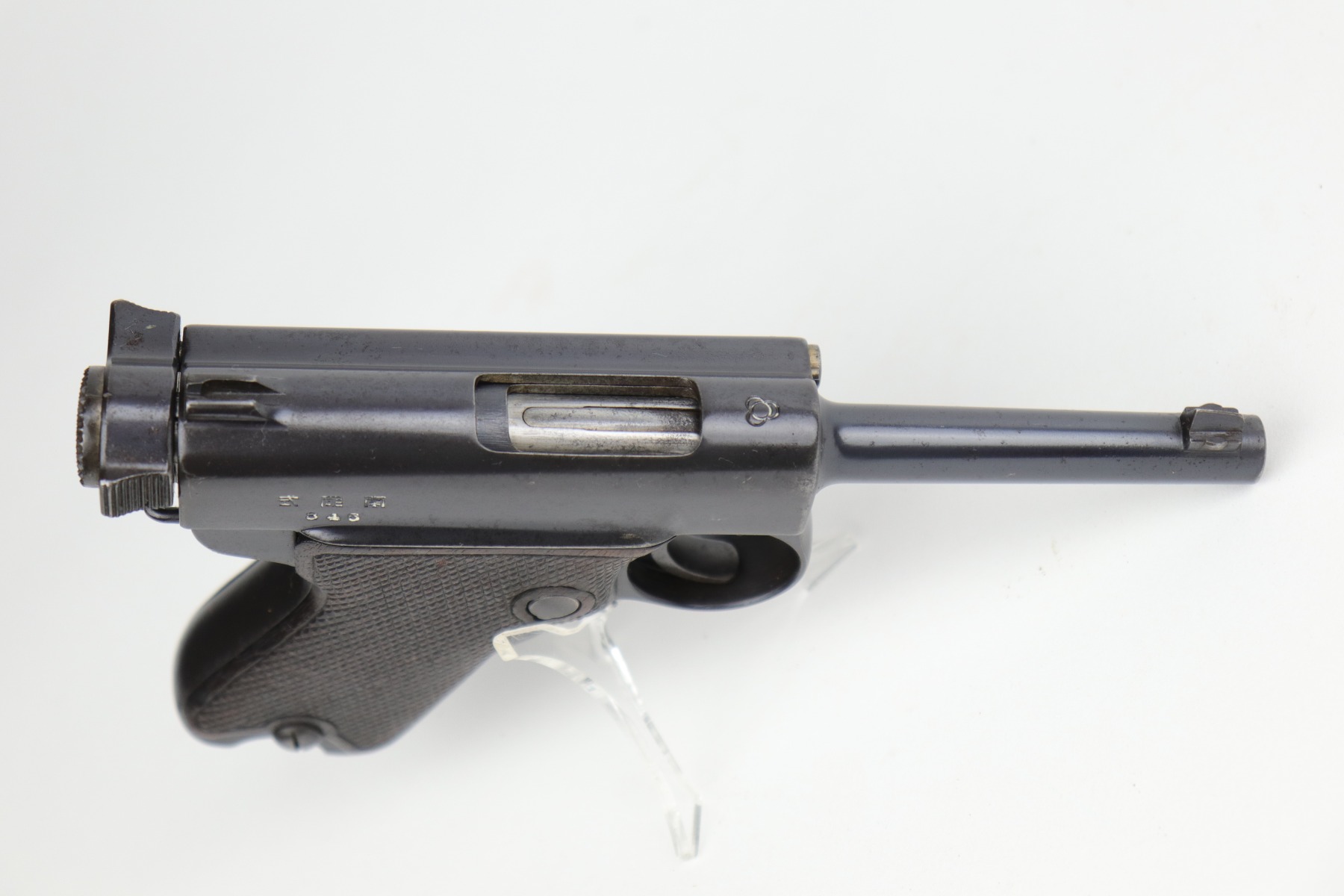 12/11/23 – This is a nice example of a Baby Nambu that was likely part of a private purchase for a Japanese officer of either the Army or Navy. The marking on the top of the chamber indicates it was manufactured in the Tokyo Arsenal. The gun is all matching and comes with one original matching magazine. The gun has retained roughly 90% of its original bluing. The most obvious sign of wear is pin-pricking and spotty oxidation in the metal throughout. This is typical for these guns since they were used mostly around salt water. There is also minor wear on the high edges of the slide. Excellent grips. The bore is fairly shiny but the rifling shows some wear and there’s some freckling in the grooves.