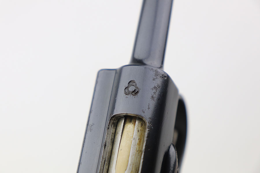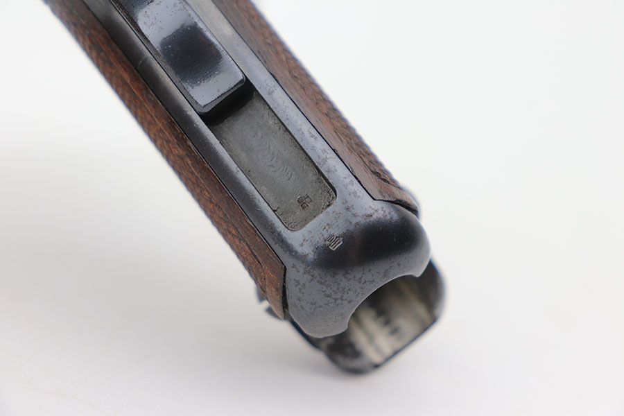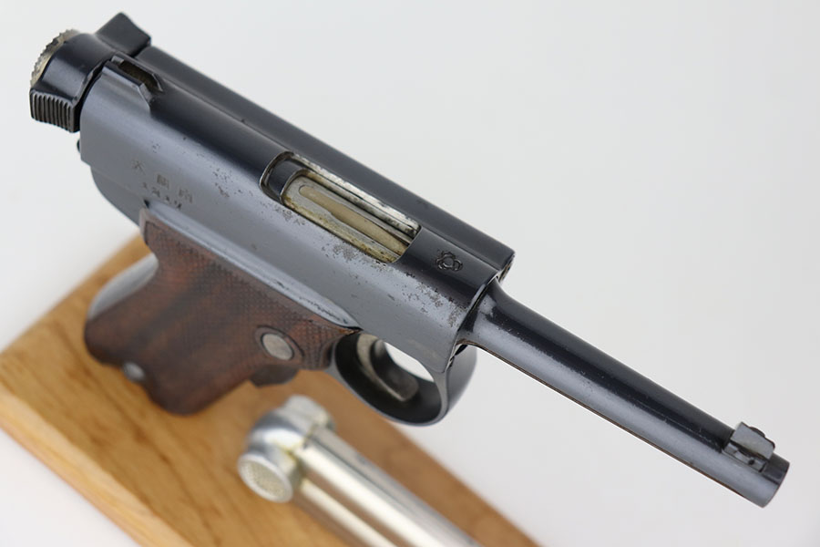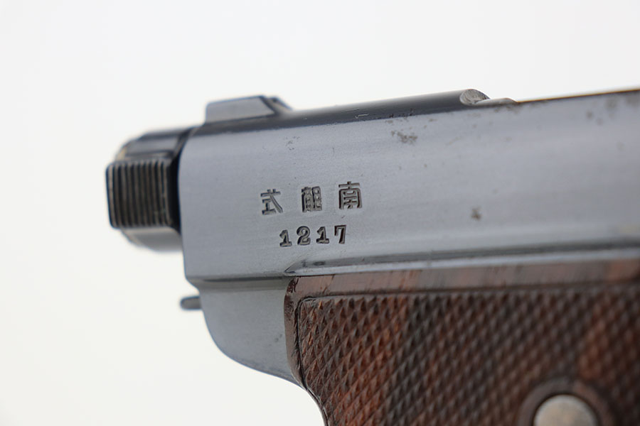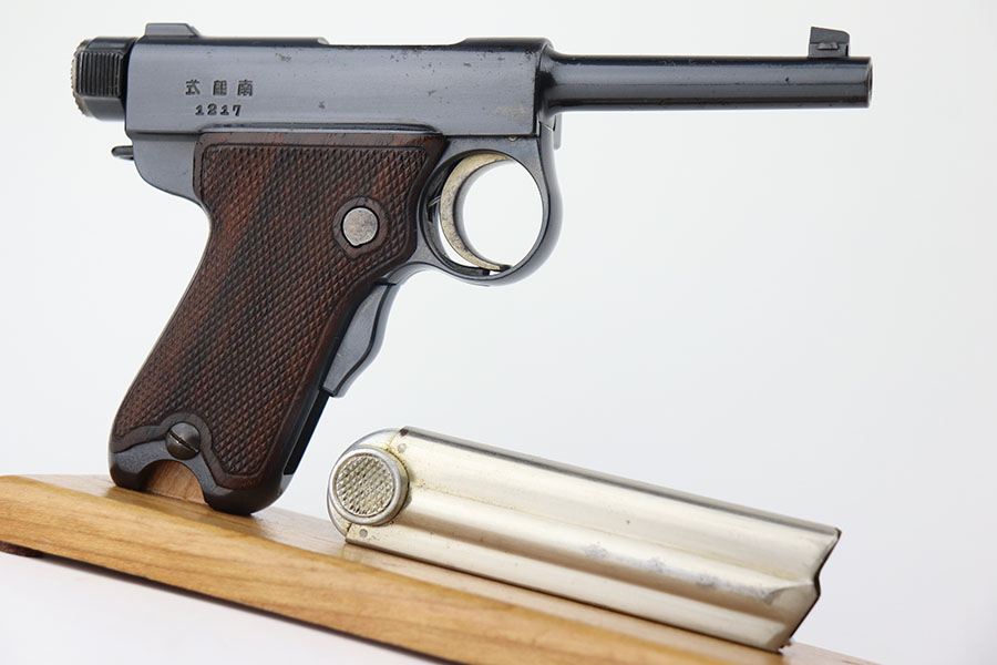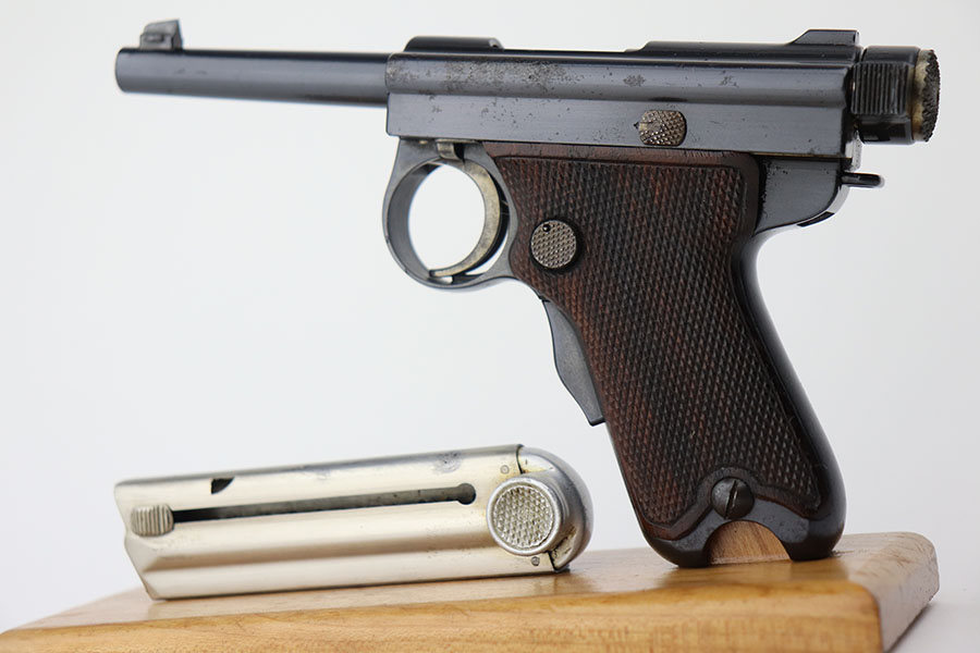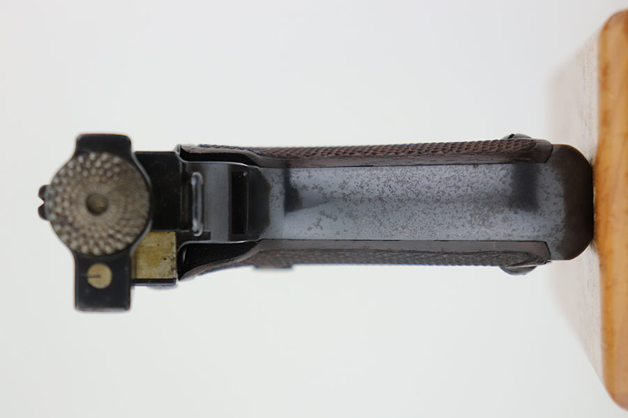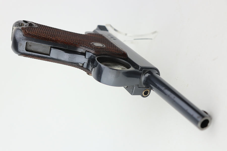 3/14/23 – This is a minty example of a Baby Nambu pistol issued to a Japanese officer. The gun is matching and was made in the Tokyo Arsenal. It has retained about 95-98% of its original bluing. There is minor freckling on the straps and areas minor pitting on the high edges of the frame. It comes with original matching grips and one original matching magazine. The bore is excellent – shiny with strong rifling.