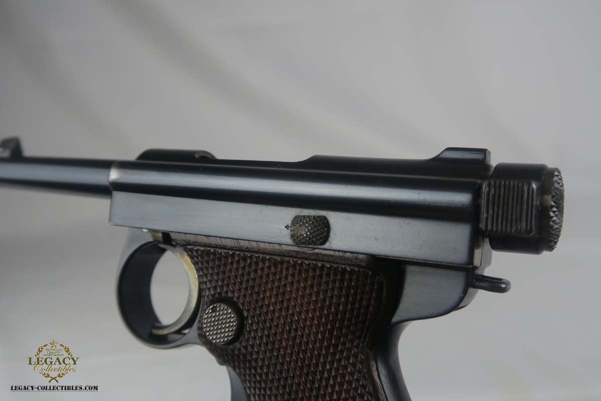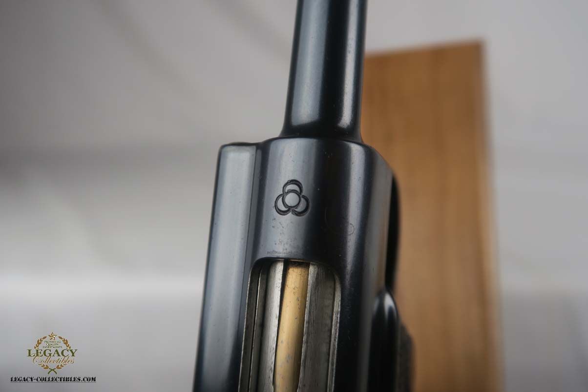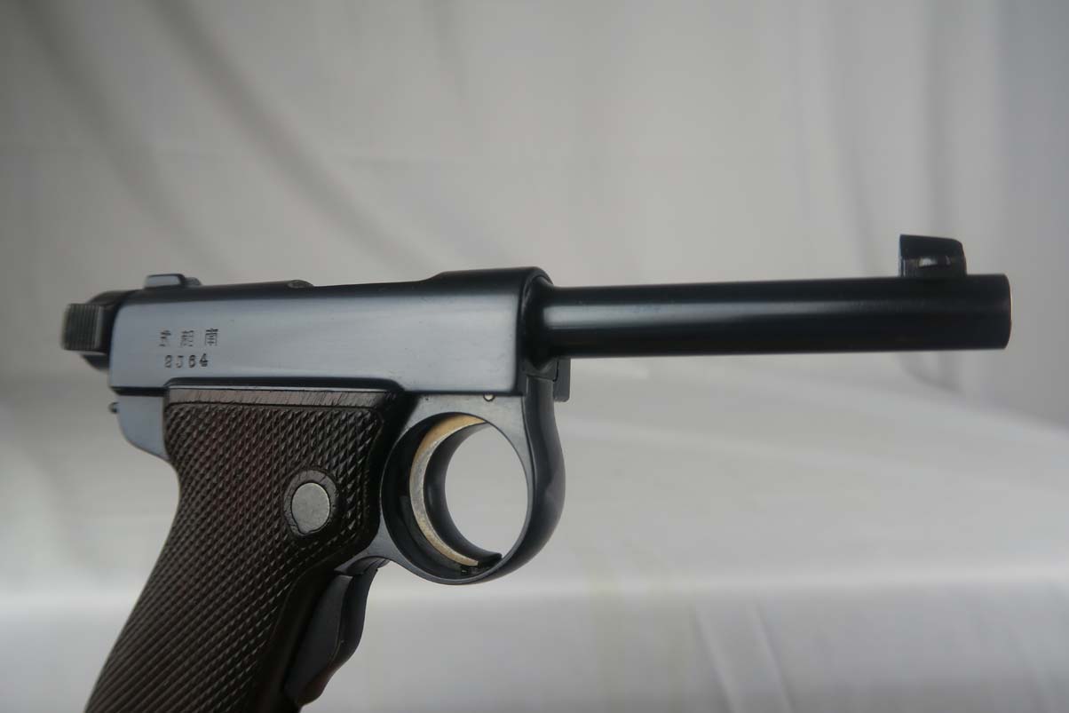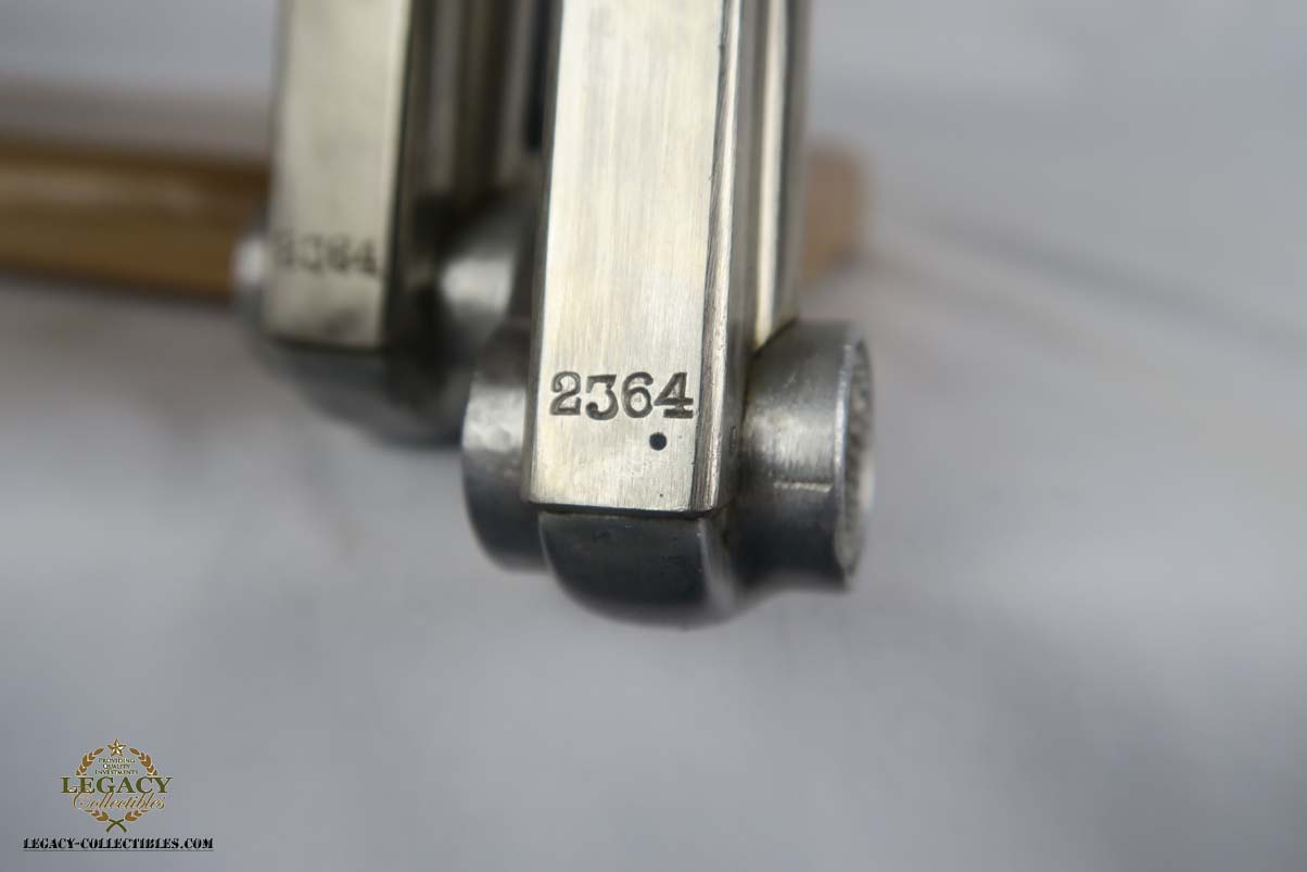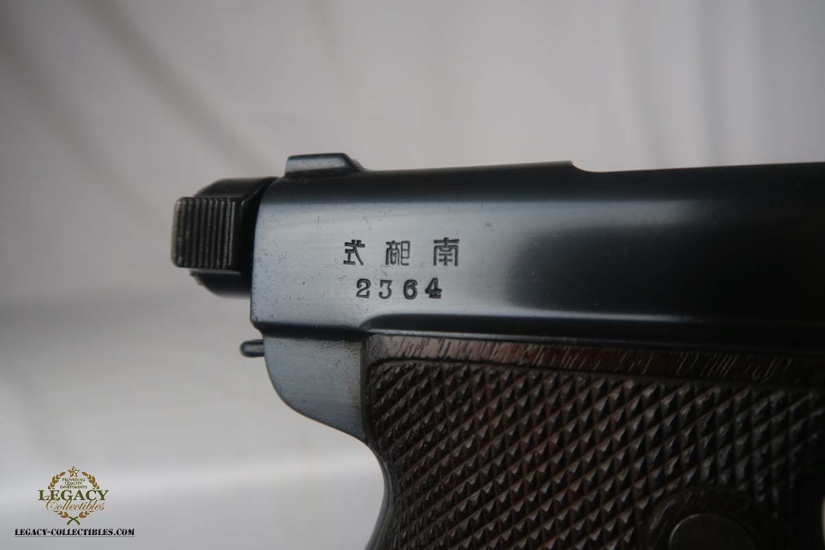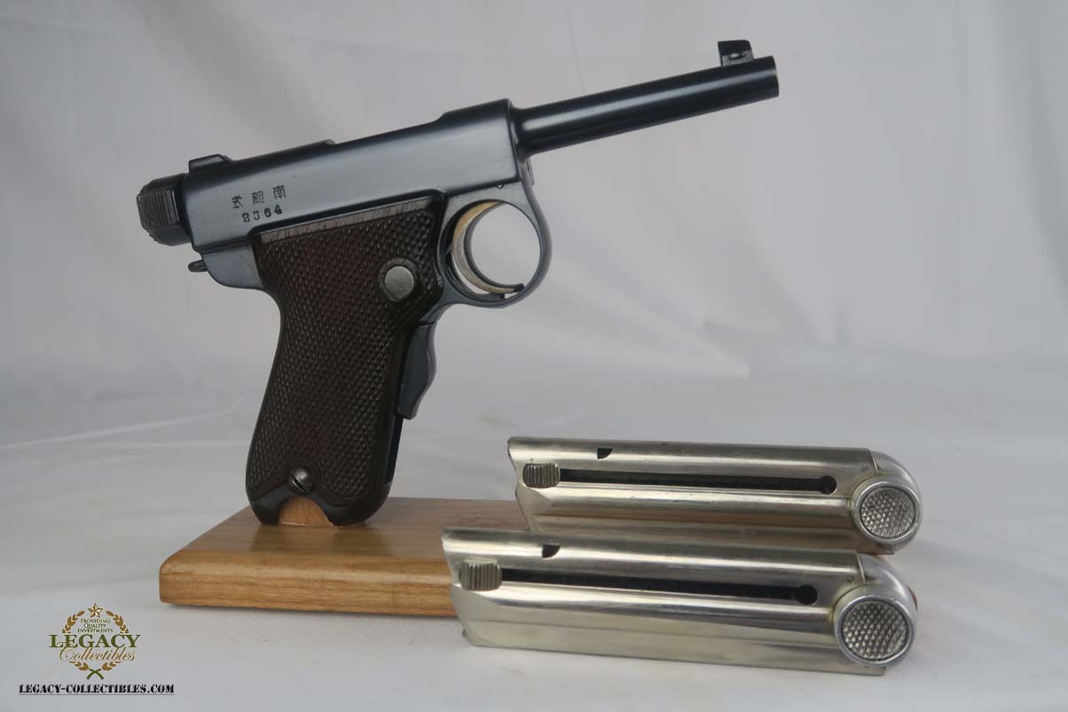 7/18/17 – This is a full rig Baby Nambu in 98% condition.  Not only is it one of the nicest we’ve ever listed, it is the first that includes BOTH factory original numbered magazines as well as the original holster and cleaning rod.   I’ve sold the holsters in the past for about 2500 and I’m told the original cleaning rod is worth about 1k.   This baby is from the Tokyo Arsenal where only about 6500 were ever produced.   This one is in about the middle of the range and most likely made around 1925.  These guns were only issued to officers, and few survived the Pacific war.  This rig would rank up there with the Party Leader PPK rig in terms of desirability and I would guess finding a rig like this will be increasingly rare.   It is already rarer that the Party Leader.  To summarize this rig would be a GREAT investment for the high end collector.    The original bluing is excellent with only a little oxidation on the straps, which is pretty typical.  In fact, most have lots of pinpricking due to the salt air encountered by overseas missions.  All matching serial numbers as well as an excellent baby holster. Mirror bore.