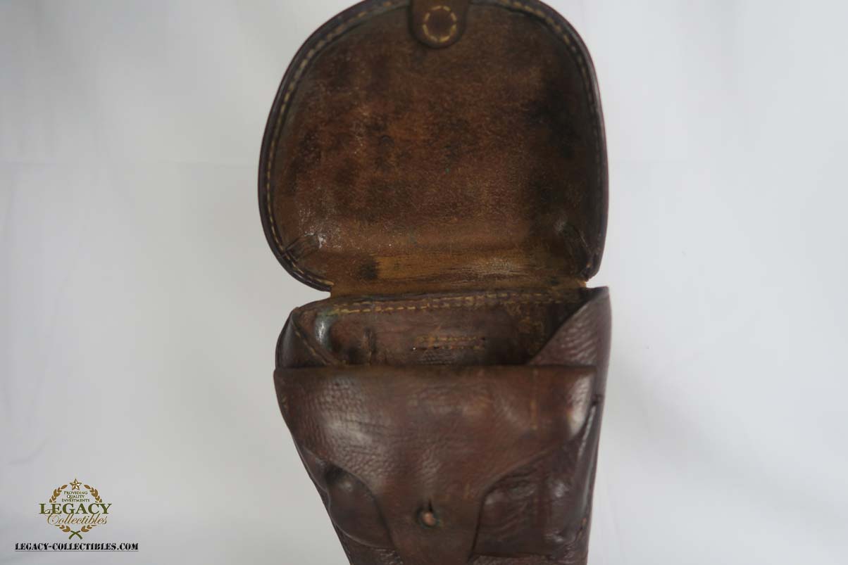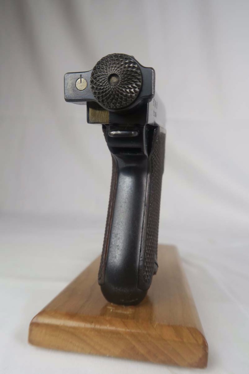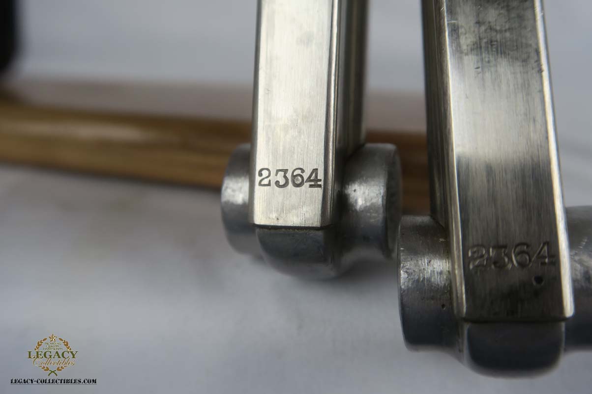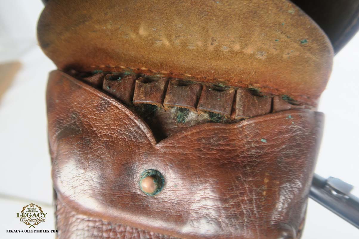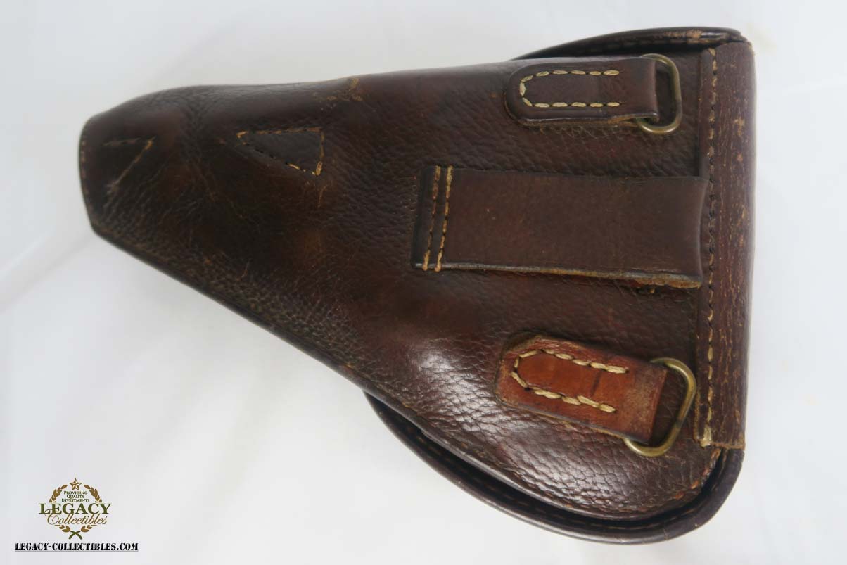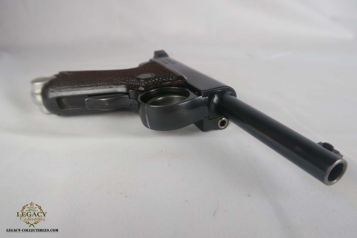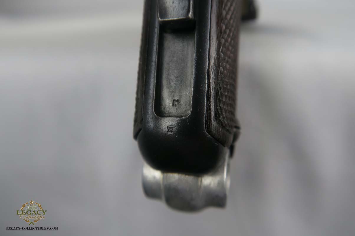 7/18/17 – This is a full rig Baby Nambu in 98% condition.  Not only is it one of the nicest we’ve ever listed, it is the first that includes BOTH factory original numbered magazines as well as the original holster and cleaning rod.   I’ve sold the holsters in the past for about 2500 and I’m told the original cleaning rod is worth about 1k.   This baby is from the Tokyo Arsenal where only about 6500 were ever produced.   This one is in about the middle of the range and most likely made around 1925.  These guns were only issued to officers, and few survived the Pacific war.  This rig would rank up there with the Party Leader PPK rig in terms of desirability and I would guess finding a rig like this will be increasingly rare.   It is already rarer that the Party Leader.  To summarize this rig would be a GREAT investment for the high end collector.    The original bluing is excellent with only a little oxidation on the straps, which is pretty typical.  In fact, most have lots of pinpricking due to the salt air encountered by overseas missions.  All matching serial numbers as well as an excellent baby holster. Mirror bore.
