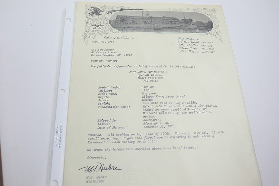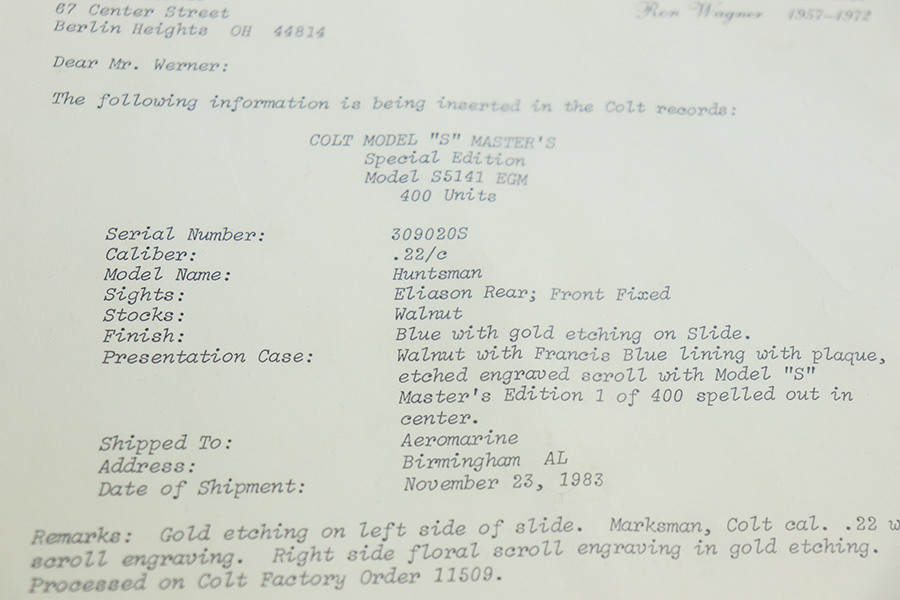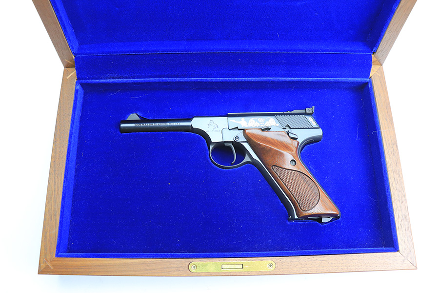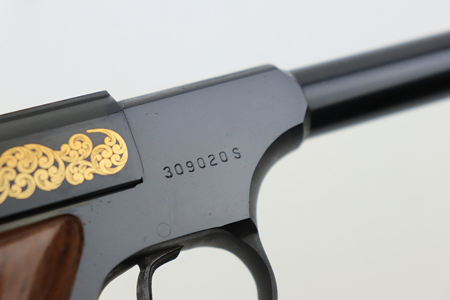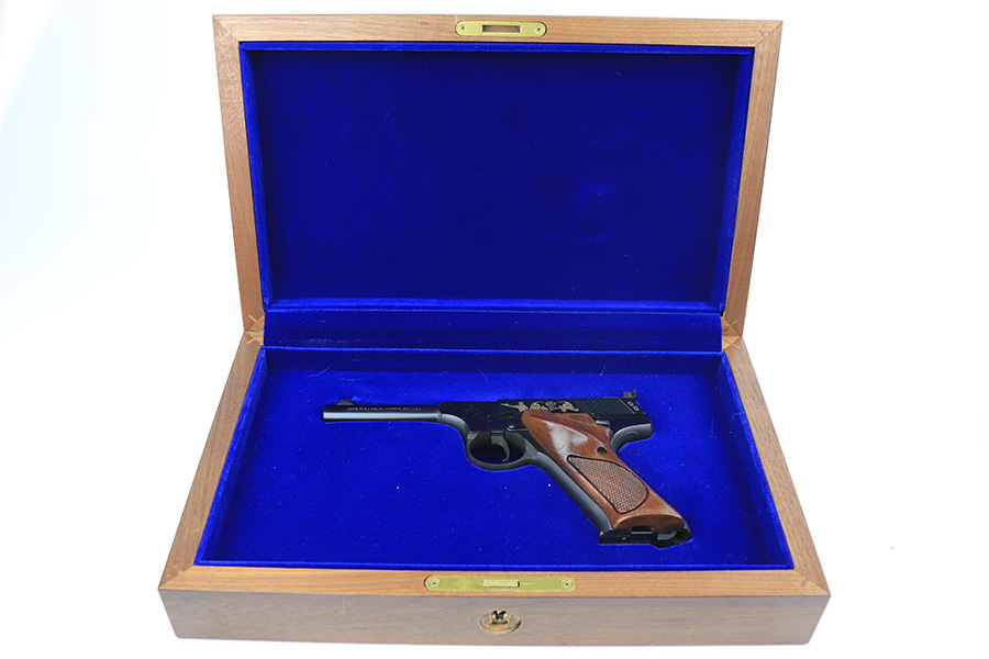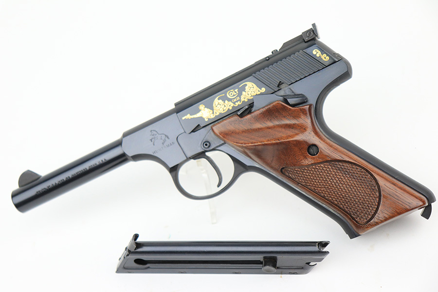 12/2/21 – This is a rare, gorgeous Colt Huntsman Model “S” Master’s Special Edition pistol, one of only 400 produced. It comes with Colt factory letter, indicating this pistol was shipped to a sporting goods retailer in Alabama in 1983. It features gold etching on the slide with floral scroll engraving. The pistol is in mint condition, and looks like it has only ever been used for display purposes. It has just a single spot of “box wear” along the top of the slide. It comes in a walnut presentation case that has Francis Blue lining with external plaque and Colt custom shop medallion.