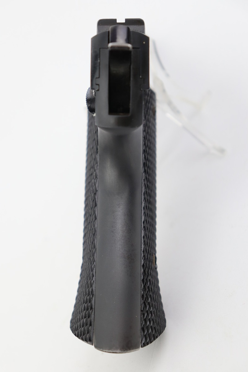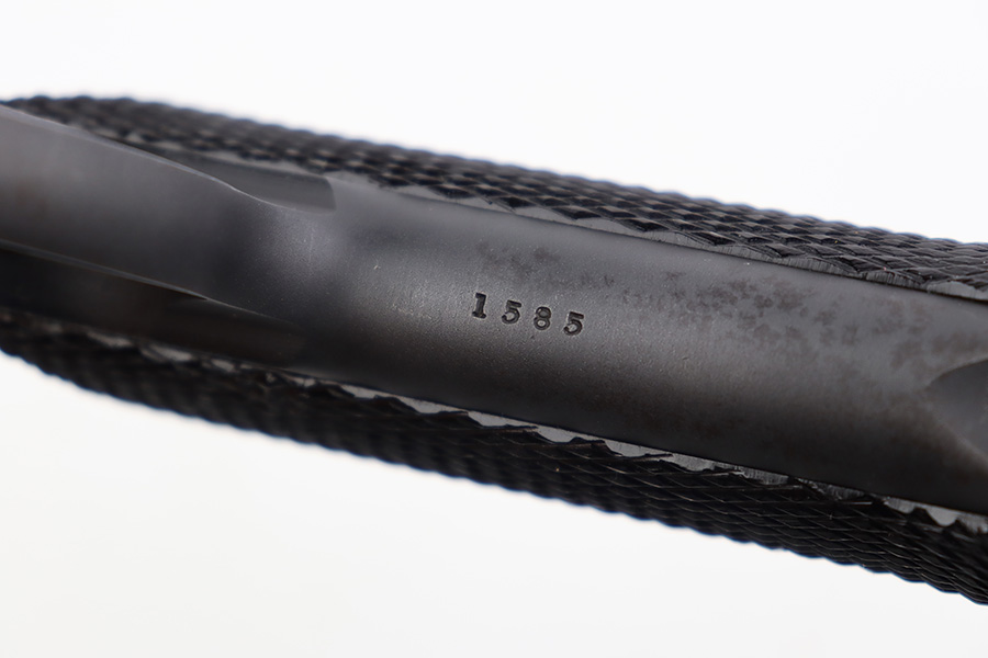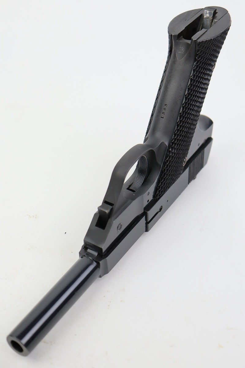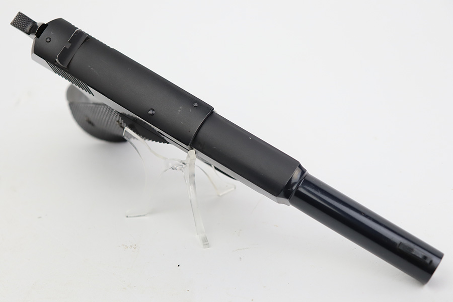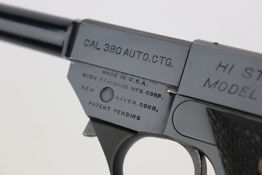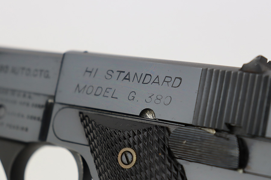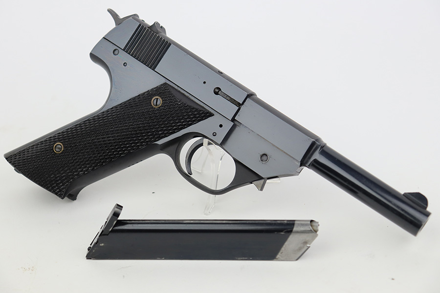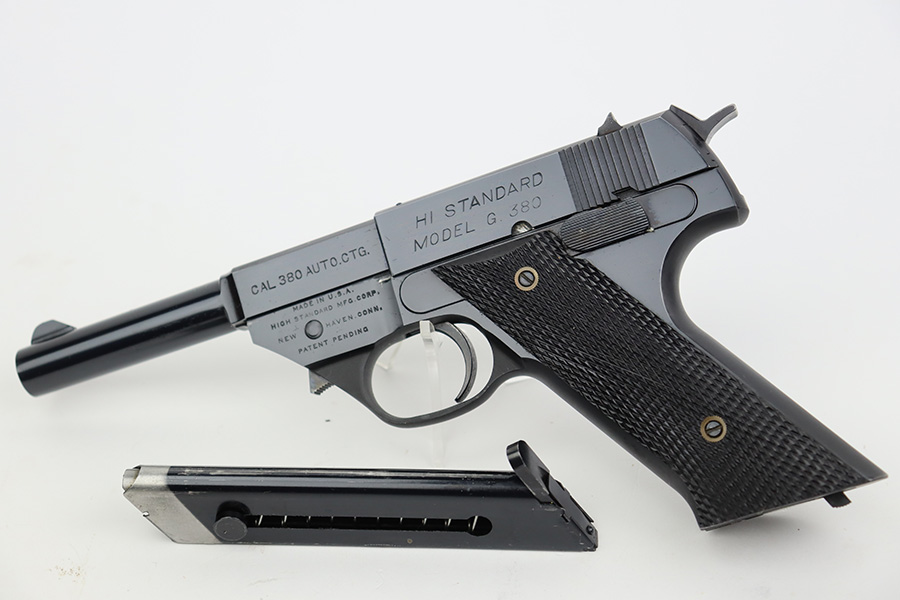 6/22/23 – This is a rare Hi Standard Model G in terrific condition, the first we’ve offered. One of only 7,400 produced, this one was made in ~1950 and has a beautiful profile with just a bit of thinning/discoloration on the straps. These were the only in-house production of a center-fire pistol, and a transition model to the G-series using a lever takedown, exposed hammer, fixed sights, checkered black plastic grips, external safety, 5 in. barrel only, 6 shot mag. This one ha a mint bore and grips.