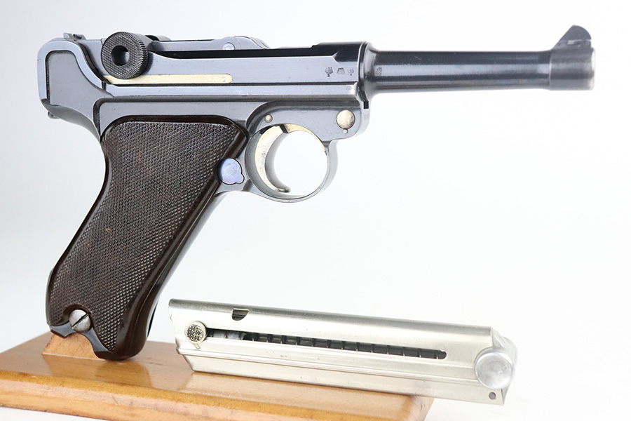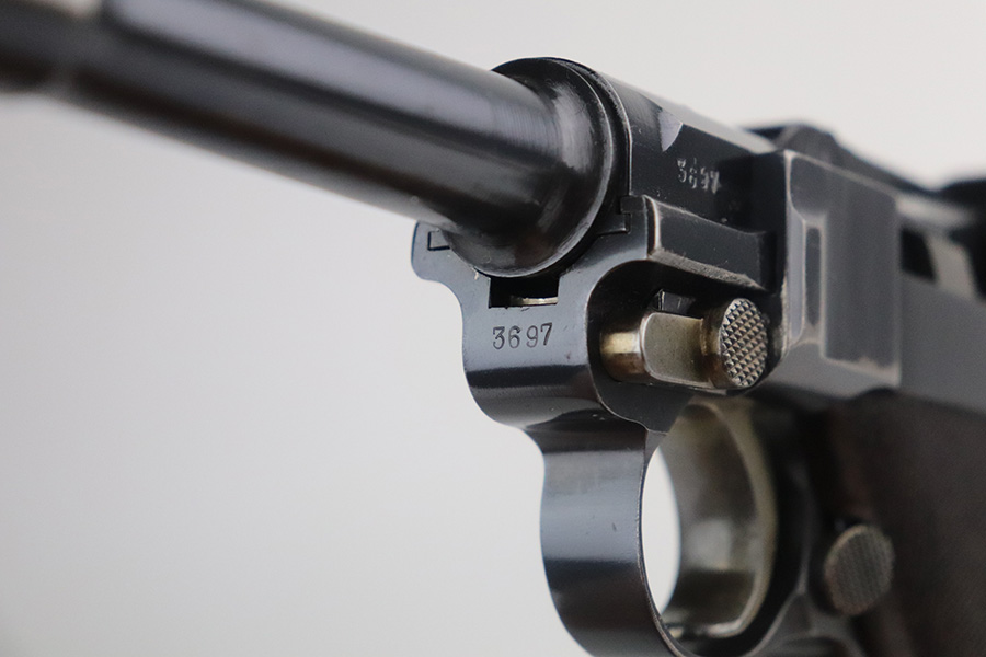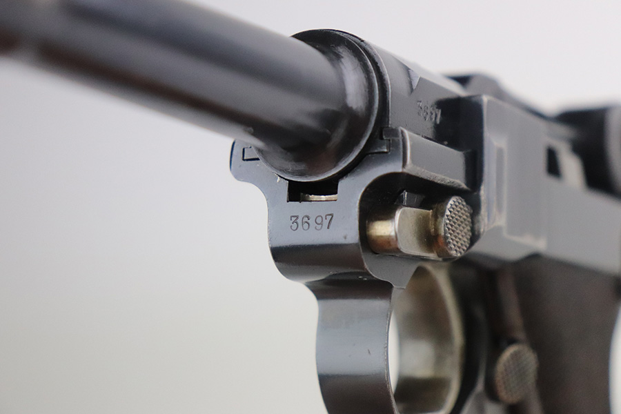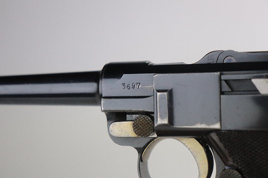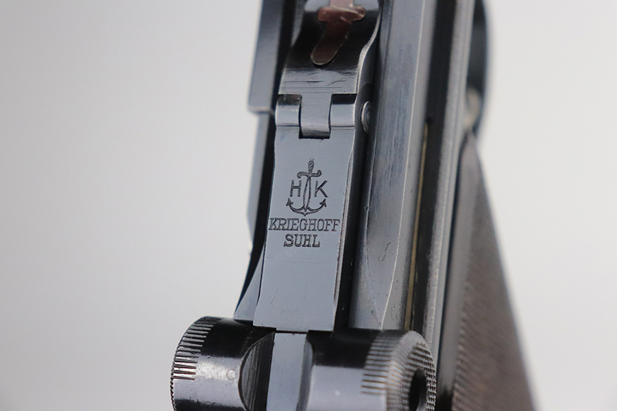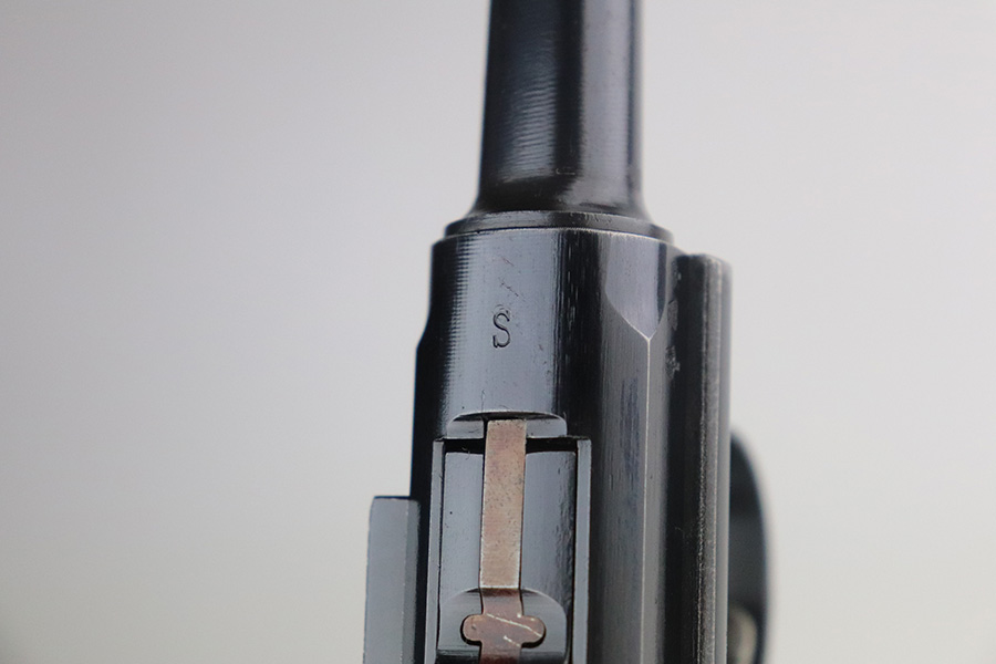7/9/21 – This is a very nice example of a rare S Code Krieghoff Luger with its original, matching magazine. Fewer than 4,000 S Code pistols were produced in 1935-36. This one is all matching and original with about 94% blue remaining. Common high edge wear on right side rail, sideplate, muzzle, and a spot on the bottom of the front strap. Beautiful, finely checkered Ritz grips. Excellent straw remains on the small parts. Bore has strong rifling but a little frost throughout.