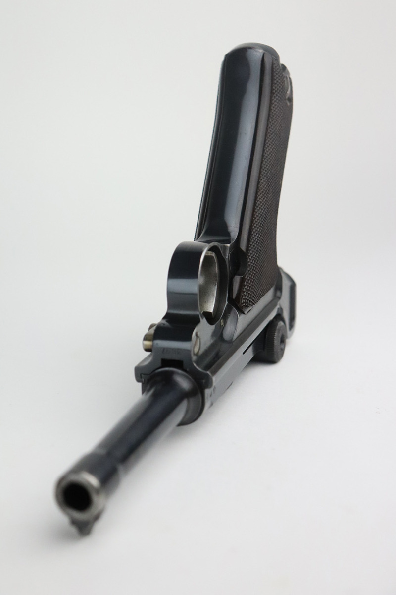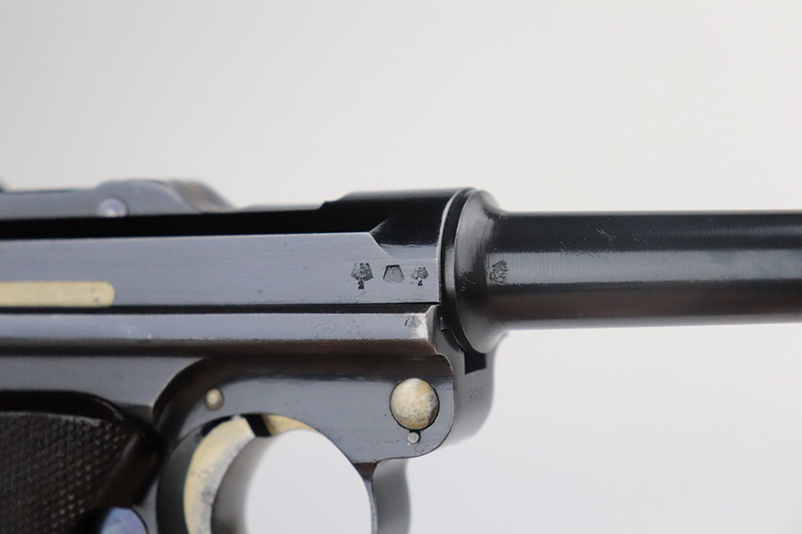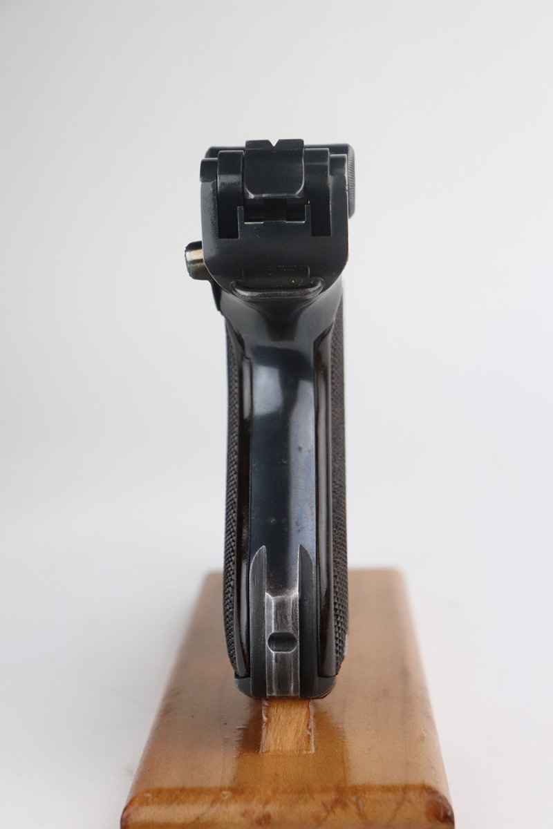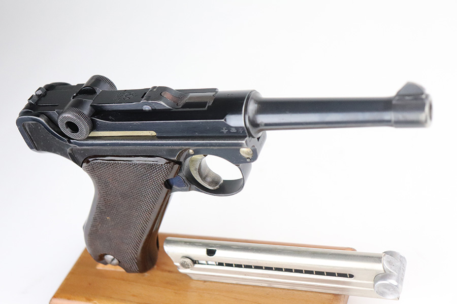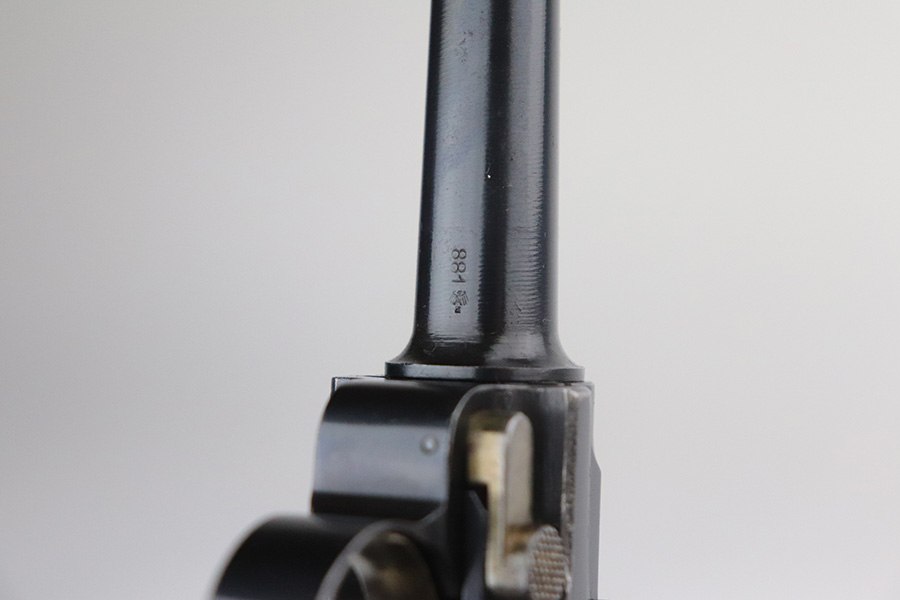 7/9/21 – This is a very nice example of a rare S Code Krieghoff Luger with its original, matching magazine. Fewer than 4,000 S Code pistols were produced in 1935-36. This one is all matching and original with about 94% blue remaining. Common high edge wear on right side rail, sideplate, muzzle, and a spot on the bottom of the front strap. Beautiful, finely checkered Ritz grips. Excellent straw remains on the small parts. Bore has strong rifling but a little frost throughout.