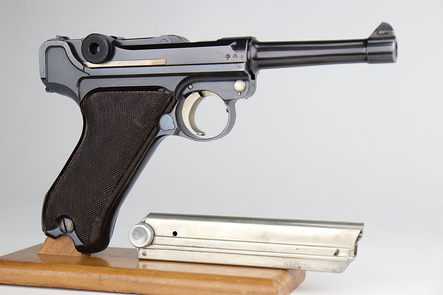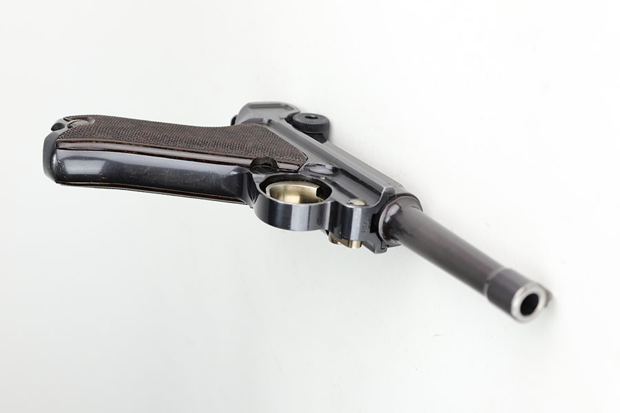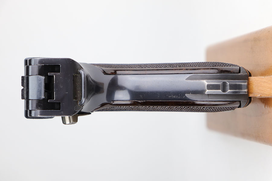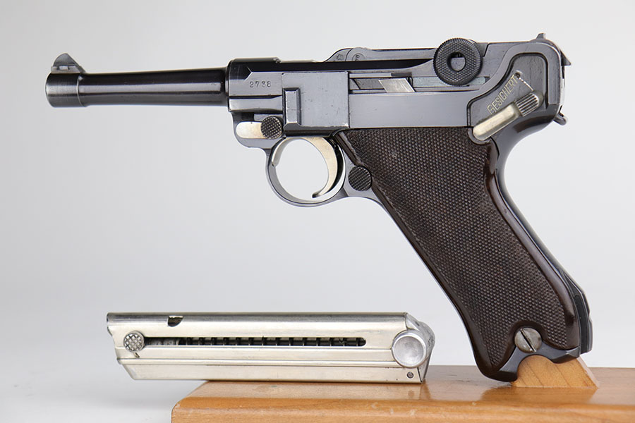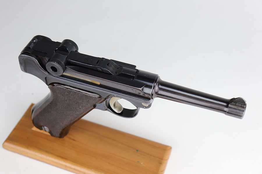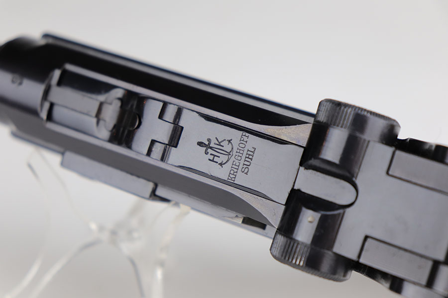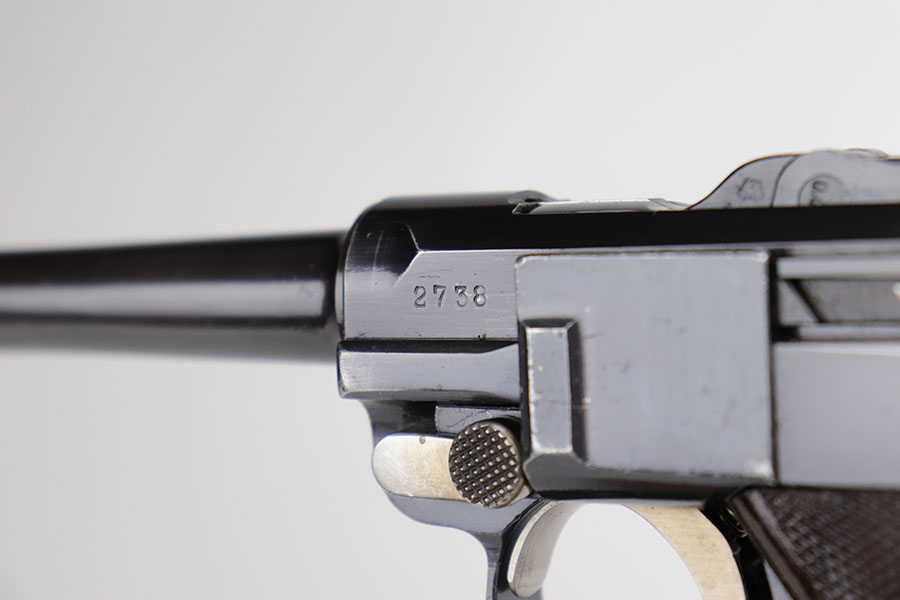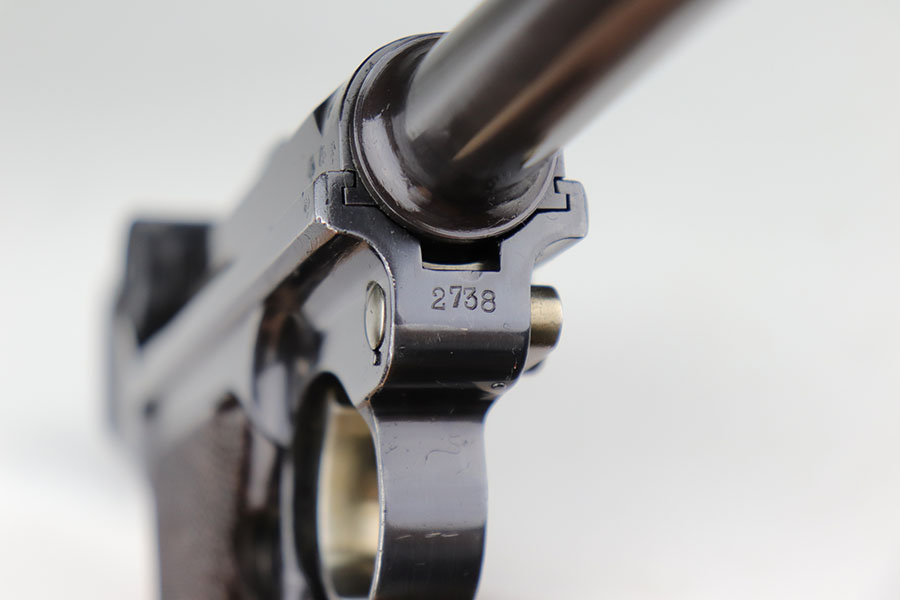 12/8/20 – This is a beautiful and rare Krieghoff Luger from 1936 with S code on receiver. There were only about 3,600 of this variation produced. This particular example has about 95% of the original blue with a near matching magazine. There’s minor high edge wear on this Luger, and a little thinning on the front strap, but a beautiful pistol overall. Krieghoff Lugers are known for their deep, lustrous blue and this is a good example of why. Nice straw on the small parts. Excellent, original grips. Original magazine that is only 16 digits off from the pistol. Strong, shiny bore.