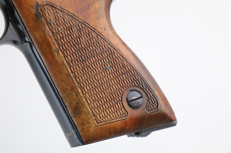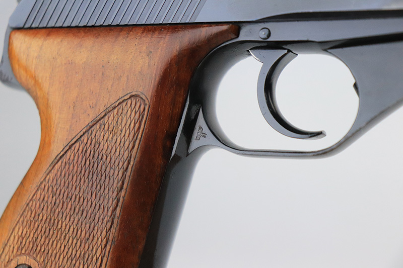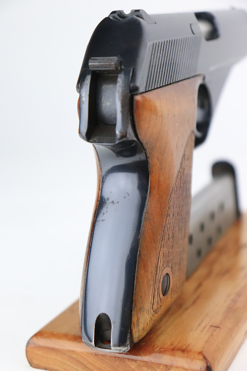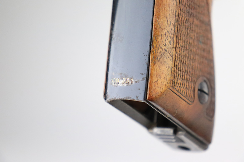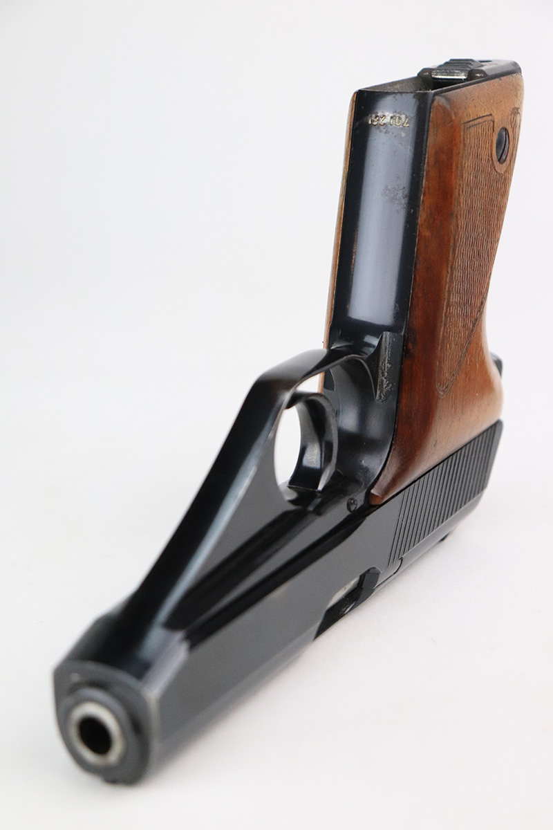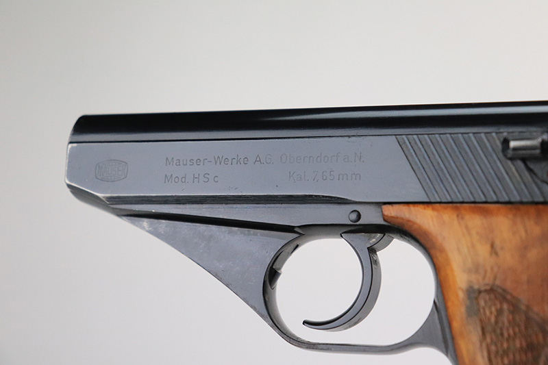 11/23/22 – This is an extremely rare Mauser HSc from 1940.  This variation with low grip screw saw only ~700 commercially manufactured, all in 1940 with high-polish finish. This variation represents the earliest HSc’s manufactured, as the revision to the grip placement on the frame had already been done before production began.  This likely means these pistols were already in inventory at the factory and the replacement forgings would have been ordered before the HSc came off the assembly line. This one has about 97% blue remaining with most of the wear in a single area on the right side of the slide. There is also minor freckling in a small area on both straps.  Minty magazine and bore.  Grips have a few dings but no cracks or chips.