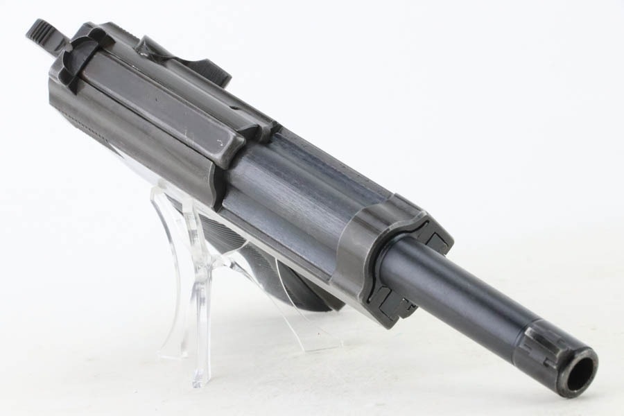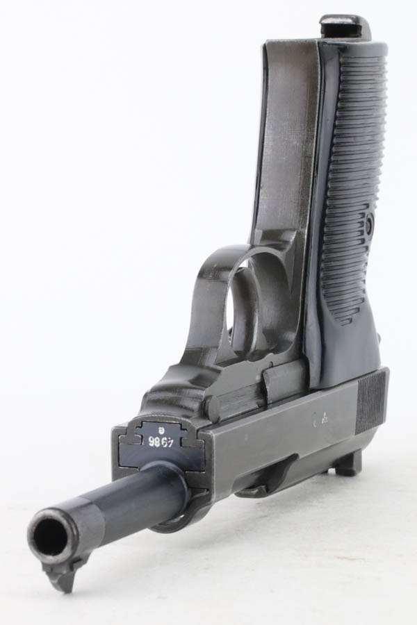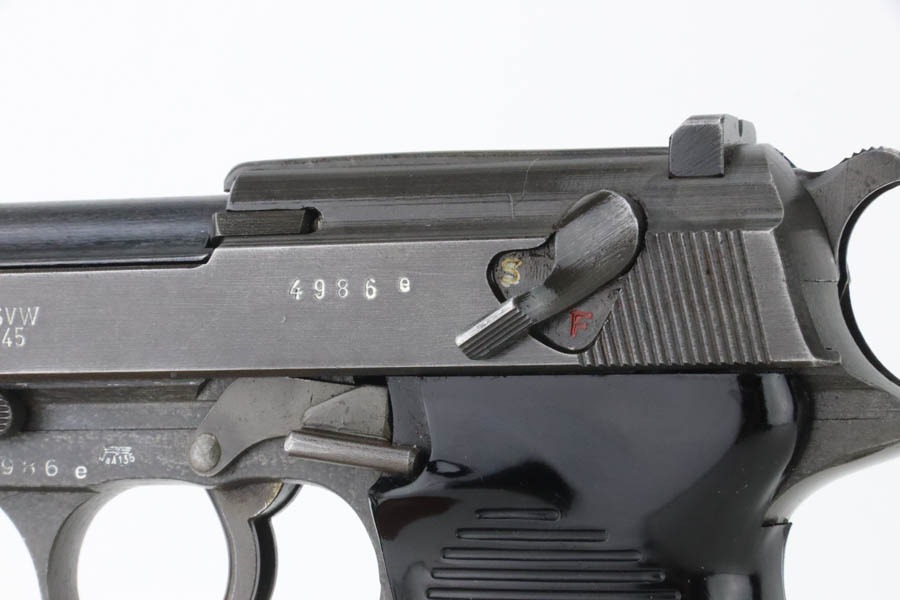 10/30/24 – This is a beautiful example of a rare Nazi Mauser P.38 with ‘svw 45’ slide code, indicating it was made at the French Mauser factory but issued and accepted into the German military. There were only ~7,800 of this variation produced with dual-tone finish. This one is in near-mint condition, retaining nearly all of its finish. Just hints of high edge wear and a couple of small dots of discoloration on the right side of the slide (typical for phosphate finishes). Fitted with black plastic Mauser grips and comes with a rare, late-war, “U” marked “Waffen 135” Mauser magazine. The bore has good rifling, but there is light freckling throughout. De-cocker is functional.