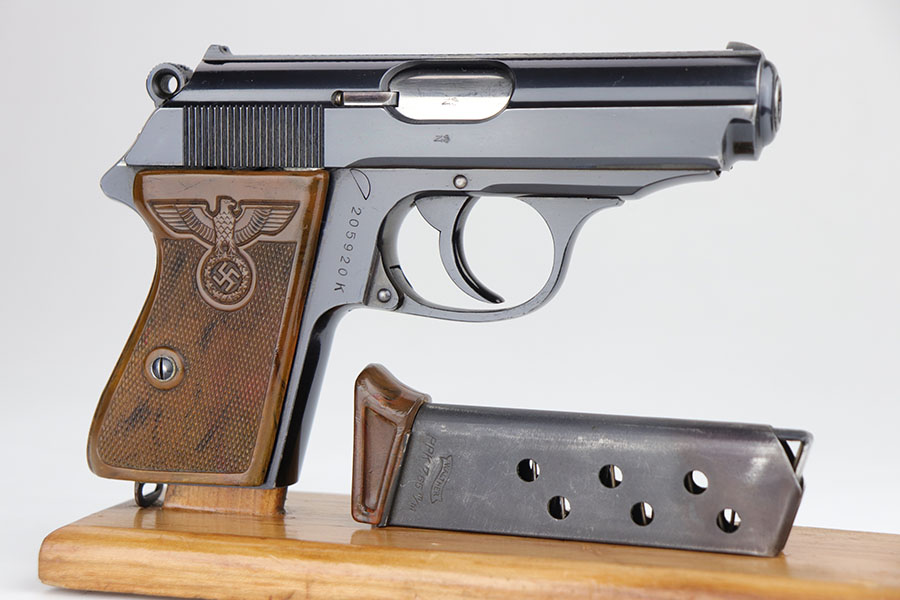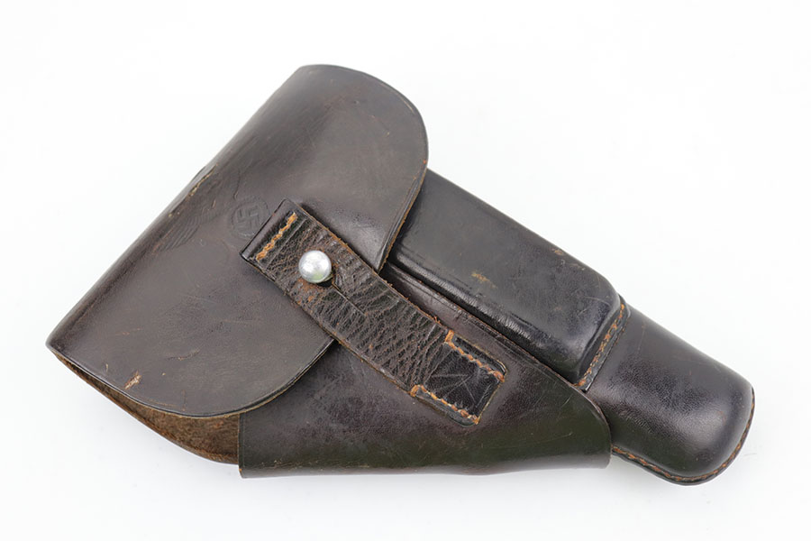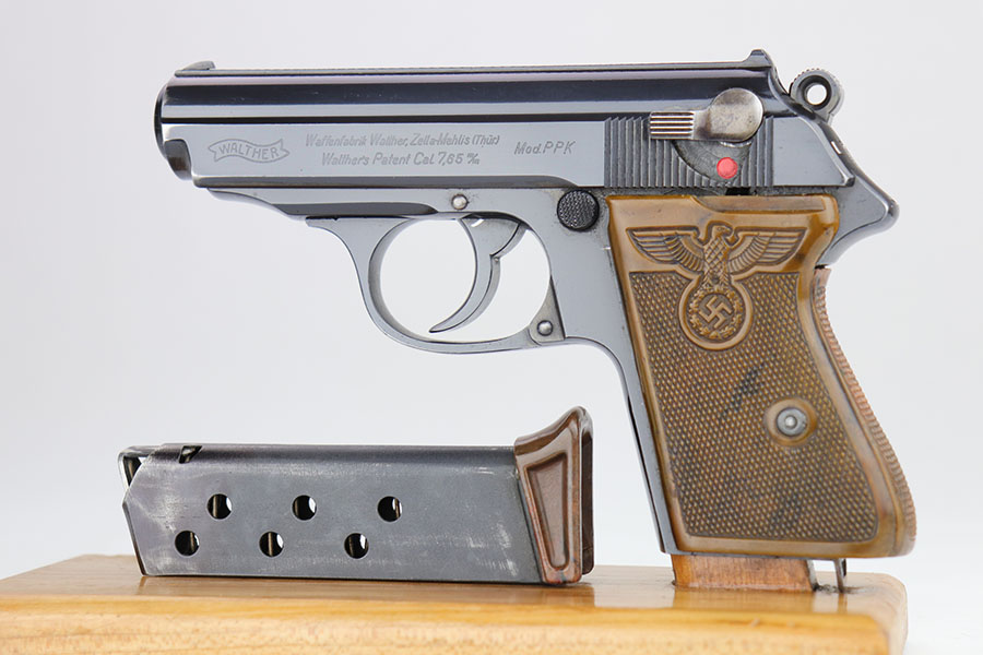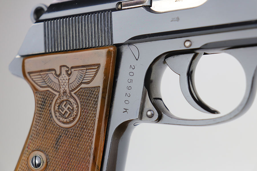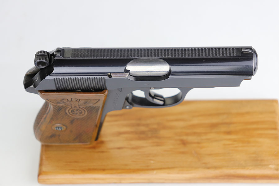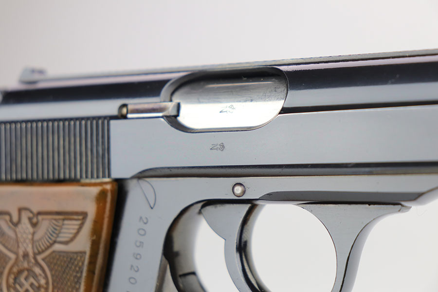 The Walther PPK with Party Leader Grips was the “Honor Weapon of the Political Leaders”. The Hoheitsabzeichen or High Insignia is the Eagle over Swastika found on either side of the grips where the Walther banner is normally located. The person entitled to wear the honor weapons that were awarded them by the Fuhrer were the Political Leaders of the national, regional and district territories, as well as leaders of local and support units. The persons who wore the honor weapon had their authorizations listed in the district personnel offices, and had to have in their possession a weapons permit issued by the police, which was obtained through official channels. These rare pistols were estimated to number around 3,500, and are widely faked, but this one is guaranteed original.
